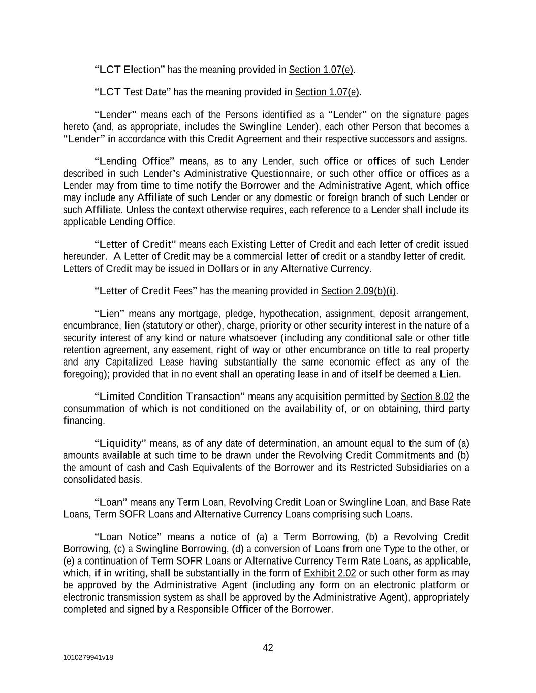 “LCT Election” has the meaning provided in Section 1.07(e). “LCT Test Date” has the meaning provided in Section 1.07(e). “Lender” means each of the Persons identified as a “Lender” on the signature pages hereto (and, as appropriate, includes the Swingline Lender), each other Person that becomes a “Lender” in accordance with this Credit Agreement and their respective successors and assigns. “Lending Office” means, as to any Lender, such office or offices of such Lender described in such Lender’s Administrative Questionnaire, or such other office or offices as a Lender may from time to time notify the Borrower and the Administrative Agent, which office may include any Affiliate of such Lender or any domestic or foreign branch of such Lender or such Affiliate. Unless the context otherwise requires, each reference to a Lender shall include its applicable Lending Office. “Letter of Credit” means each Existing Letter of Credit and each letter of credit issued hereunder. A Letter of Credit may be a commercial letter of credit or a standby letter of credit. Letters of Credit may be issued in Dollars or in any Alternative Currency. “Letter of Credit Fees” has the meaning provided in Section 2.09(b)(i). “Lien” means any mortgage, pledge, hypothecation, assignment, deposit arrangement, encumbrance, lien (statutory or other), charge, priority or other security interest in the nature of a security interest of any kind or nature whatsoever (including any conditional sale or other title retention agreement, any easement, right of way or other encumbrance on title to real property and any Capitalized Lease having substantially the same economic effect as any of the foregoing); provided that in no event shall an operating lease in and of itself be deemed a Lien. “Limited Condition Transaction” means any acquisition permitted by Section 8.02 the consummation of which is not conditioned on the availability of, or on obtaining, third party financing. “Liquidity” means, as of any date of determination, an amount equal to the sum of (a) amounts available at such time to be drawn under the Revolving Credit Commitments and (b) the amount of cash and Cash Equivalents of the Borrower and its Restricted Subsidiaries on a consolidated basis. “Loan” means any Term Loan, Revolving Credit Loan or Swingline Loan, and Base Rate Loans, Term SOFR Loans and Alternative Currency Loans comprising such Loans. “Loan Notice” means a notice of (a) a Term Borrowing, (b) a Revolving Credit Borrowing, (c) a Swingline Borrowing, (d) a conversion of Loans from one Type to the other, or (e) a continuation of Term SOFR Loans or Alternative Currency Term Rate Loans, as applicable, which, if in writing, shall be substantially in the form of Exhibit 2.02 or such other form as may be approved by the Administrative Agent (including any form on an electronic platform or electronic transmission system as shall be approved by the Administrative Agent), appropriately completed and signed by a Responsible Officer of the Borrower. 42 1010279941v18