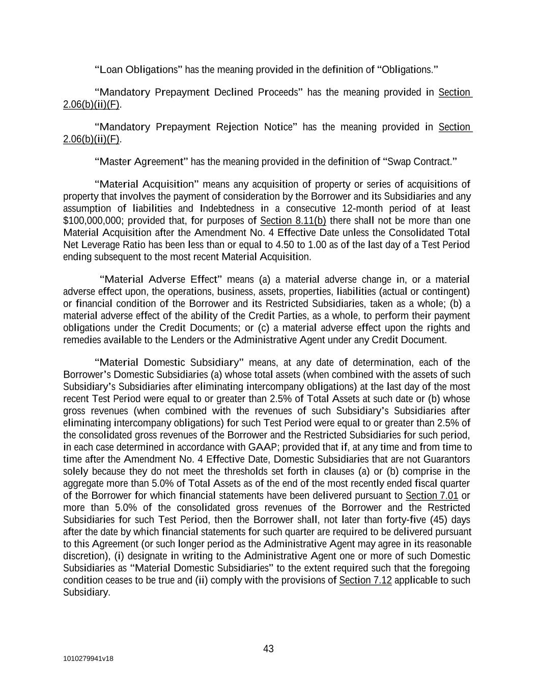 “Loan Obligations” has the meaning provided in the definition of “Obligations.” “Mandatory Prepayment Declined Proceeds” has the meaning provided in Section 2.06(b)(ii)(F). “Mandatory Prepayment Rejection Notice” has the meaning provided in Section 2.06(b)(ii)(F). “Master Agreement” has the meaning provided in the definition of “Swap Contract.” “Material Acquisition” means any acquisition of property or series of acquisitions of property that involves the payment of consideration by the Borrower and its Subsidiaries and any assumption of liabilities and Indebtedness in a consecutive 12-month period of at least $100,000,000; provided that, for purposes of Section 8.11(b) there shall not be more than one Material Acquisition after the Amendment No. 4 Effective Date unless the Consolidated Total Net Leverage Ratio has been less than or equal to 4.50 to 1.00 as of the last day of a Test Period ending subsequent to the most recent Material Acquisition. “Material Adverse Effect” means (a) a material adverse change in, or a material adverse effect upon, the operations, business, assets, properties, liabilities (actual or contingent) or financial condition of the Borrower and its Restricted Subsidiaries, taken as a whole; (b) a material adverse effect of the ability of the Credit Parties, as a whole, to perform their payment obligations under the Credit Documents; or (c) a material adverse effect upon the rights and remedies available to the Lenders or the Administrative Agent under any Credit Document. “Material Domestic Subsidiary” means, at any date of determination, each of the Borrower’s Domestic Subsidiaries (a) whose total assets (when combined with the assets of such Subsidiary’s Subsidiaries after eliminating intercompany obligations) at the last day of the most recent Test Period were equal to or greater than 2.5% of Total Assets at such date or (b) whose gross revenues (when combined with the revenues of such Subsidiary’s Subsidiaries after eliminating intercompany obligations) for such Test Period were equal to or greater than 2.5% of the consolidated gross revenues of the Borrower and the Restricted Subsidiaries for such period, in each case determined in accordance with GAAP; provided that if, at any time and from time to time after the Amendment No. 4 Effective Date, Domestic Subsidiaries that are not Guarantors solely because they do not meet the thresholds set forth in clauses (a) or (b) comprise in the aggregate more than 5.0% of Total Assets as of the end of the most recently ended fiscal quarter of the Borrower for which financial statements have been delivered pursuant to Section 7.01 or more than 5.0% of the consolidated gross revenues of the Borrower and the Restricted Subsidiaries for such Test Period, then the Borrower shall, not later than forty-five (45) days after the date by which financial statements for such quarter are required to be delivered pursuant to this Agreement (or such longer period as the Administrative Agent may agree in its reasonable discretion), (i) designate in writing to the Administrative Agent one or more of such Domestic Subsidiaries as “Material Domestic Subsidiaries” to the extent required such that the foregoing condition ceases to be true and (ii) comply with the provisions of Section 7.12 applicable to such Subsidiary. 43 1010279941v18