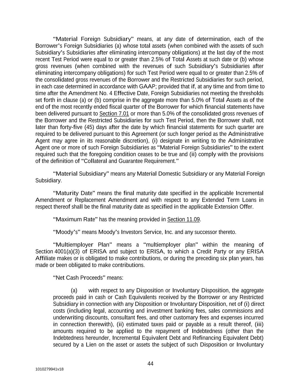 “Material Foreign Subsidiary” means, at any date of determination, each of the Borrower’s Foreign Subsidiaries (a) whose total assets (when combined with the assets of such Subsidiary’s Subsidiaries after eliminating intercompany obligations) at the last day of the most recent Test Period were equal to or greater than 2.5% of Total Assets at such date or (b) whose gross revenues (when combined with the revenues of such Subsidiary’s Subsidiaries after eliminating intercompany obligations) for such Test Period were equal to or greater than 2.5% of the consolidated gross revenues of the Borrower and the Restricted Subsidiaries for such period, in each case determined in accordance with GAAP; provided that if, at any time and from time to time after the Amendment No. 4 Effective Date, Foreign Subsidiaries not meeting the thresholds set forth in clause (a) or (b) comprise in the aggregate more than 5.0% of Total Assets as of the end of the most recently ended fiscal quarter of the Borrower for which financial statements have been delivered pursuant to Section 7.01 or more than 5.0% of the consolidated gross revenues of the Borrower and the Restricted Subsidiaries for such Test Period, then the Borrower shall, not later than forty-five (45) days after the date by which financial statements for such quarter are required to be delivered pursuant to this Agreement (or such longer period as the Administrative Agent may agree in its reasonable discretion), (i) designate in writing to the Administrative Agent one or more of such Foreign Subsidiaries as “Material Foreign Subsidiaries” to the extent required such that the foregoing condition ceases to be true and (ii) comply with the provisions of the definition of “Collateral and Guarantee Requirement.” “Material Subsidiary” means any Material Domestic Subsidiary or any Material Foreign Subsidiary. “Maturity Date” means the final maturity date specified in the applicable Incremental Amendment or Replacement Amendment and with respect to any Extended Term Loans in respect thereof shall be the final maturity date as specified in the applicable Extension Offer. “Maximum Rate” has the meaning provided in Section 11.09. “Moody’s” means Moody’s Investors Service, Inc. and any successor thereto. “Multiemployer Plan” means a “multiemployer plan” within the meaning of Section 4001(a)(3) of ERISA and subject to ERISA, to which a Credit Party or any ERISA Affiliate makes or is obligated to make contributions, or during the preceding six plan years, has made or been obligated to make contributions. “Net Cash Proceeds” means: (a) with respect to any Disposition or Involuntary Disposition, the aggregate proceeds paid in cash or Cash Equivalents received by the Borrower or any Restricted Subsidiary in connection with any Disposition or Involuntary Disposition, net of (i) direct costs (including legal, accounting and investment banking fees, sales commissions and underwriting discounts, consultant fees, and other customary fees and expenses incurred in connection therewith), (ii) estimated taxes paid or payable as a result thereof, (iii) amounts required to be applied to the repayment of Indebtedness (other than the Indebtedness hereunder, Incremental Equivalent Debt and Refinancing Equivalent Debt) secured by a Lien on the asset or assets the subject of such Disposition or Involuntary 44 1010279941v18