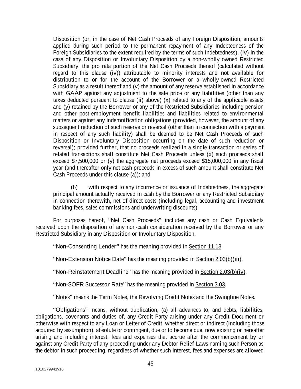 Disposition (or, in the case of Net Cash Proceeds of any Foreign Disposition, amounts applied during such period to the permanent repayment of any Indebtedness of the Foreign Subsidiaries to the extent required by the terms of such Indebtedness), (iv) in the case of any Disposition or Involuntary Disposition by a non-wholly owned Restricted Subsidiary, the pro rata portion of the Net Cash Proceeds thereof (calculated without regard to this clause (iv)) attributable to minority interests and not available for distribution to or for the account of the Borrower or a wholly-owned Restricted Subsidiary as a result thereof and (v) the amount of any reserve established in accordance with GAAP against any adjustment to the sale price or any liabilities (other than any taxes deducted pursuant to clause (ii) above) (x) related to any of the applicable assets and (y) retained by the Borrower or any of the Restricted Subsidiaries including pension and other post-employment benefit liabilities and liabilities related to environmental matters or against any indemnification obligations (provided, however, the amount of any subsequent reduction of such reserve or reversal (other than in connection with a payment in respect of any such liability) shall be deemed to be Net Cash Proceeds of such Disposition or Involuntary Disposition occurring on the date of such reduction or reversal); provided further, that no proceeds realized in a single transaction or series of related transactions shall constitute Net Cash Proceeds unless (x) such proceeds shall exceed $7,500,000 or (y) the aggregate net proceeds exceed $15,000,000 in any fiscal year (and thereafter only net cash proceeds in excess of such amount shall constitute Net Cash Proceeds under this clause (a)); and (b) with respect to any incurrence or issuance of Indebtedness, the aggregate principal amount actually received in cash by the Borrower or any Restricted Subsidiary in connection therewith, net of direct costs (including legal, accounting and investment banking fees, sales commissions and underwriting discounts). For purposes hereof, “Net Cash Proceeds” includes any cash or Cash Equivalents received upon the disposition of any non-cash consideration received by the Borrower or any Restricted Subsidiary in any Disposition or Involuntary Disposition. “Non-Consenting Lender” has the meaning provided in Section 11.13. “Non-Extension Notice Date” has the meaning provided in Section 2.03(b)(iii). “Non-Reinstatement Deadline” has the meaning provided in Section 2.03(b)(iv). “Non-SOFR Successor Rate” has the meaning provided in Section 3.03. “Notes” means the Term Notes, the Revolving Credit Notes and the Swingline Notes. “Obligations” means, without duplication, (a) all advances to, and debts, liabilities, obligations, covenants and duties of, any Credit Party arising under any Credit Document or otherwise with respect to any Loan or Letter of Credit, whether direct or indirect (including those acquired by assumption), absolute or contingent, due or to become due, now existing or hereafter arising and including interest, fees and expenses that accrue after the commencement by or against any Credit Party of any proceeding under any Debtor Relief Laws naming such Person as the debtor in such proceeding, regardless of whether such interest, fees and expenses are allowed 45 1010279941v18