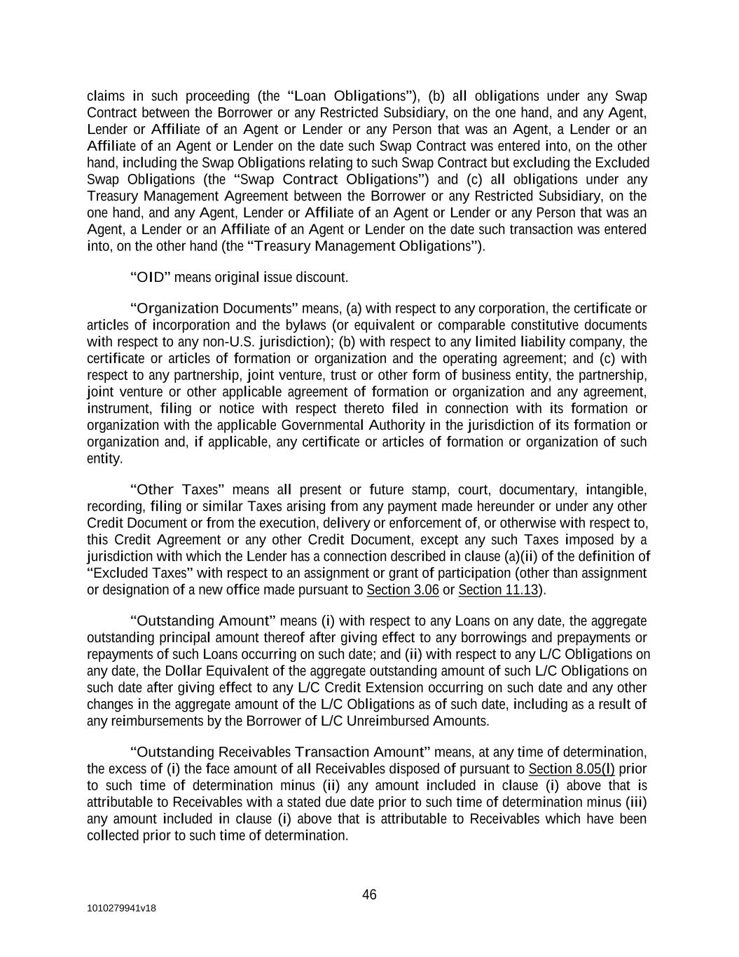 claims in such proceeding (the “Loan Obligations”), (b) all obligations under any Swap Contract between the Borrower or any Restricted Subsidiary, on the one hand, and any Agent, Lender or Affiliate of an Agent or Lender or any Person that was an Agent, a Lender or an Affiliate of an Agent or Lender on the date such Swap Contract was entered into, on the other hand, including the Swap Obligations relating to such Swap Contract but excluding the Excluded Swap Obligations (the “Swap Contract Obligations”) and (c) all obligations under any Treasury Management Agreement between the Borrower or any Restricted Subsidiary, on the one hand, and any Agent, Lender or Affiliate of an Agent or Lender or any Person that was an Agent, a Lender or an Affiliate of an Agent or Lender on the date such transaction was entered into, on the other hand (the “Treasury Management Obligations”). “OID” means original issue discount. “Organization Documents” means, (a) with respect to any corporation, the certificate or articles of incorporation and the bylaws (or equivalent or comparable constitutive documents with respect to any non-U.S. jurisdiction); (b) with respect to any limited liability company, the certificate or articles of formation or organization and the operating agreement; and (c) with respect to any partnership, joint venture, trust or other form of business entity, the partnership, joint venture or other applicable agreement of formation or organization and any agreement, instrument, filing or notice with respect thereto filed in connection with its formation or organization with the applicable Governmental Authority in the jurisdiction of its formation or organization and, if applicable, any certificate or articles of formation or organization of such entity. “Other Taxes” means all present or future stamp, court, documentary, intangible, recording, filing or similar Taxes arising from any payment made hereunder or under any other Credit Document or from the execution, delivery or enforcement of, or otherwise with respect to, this Credit Agreement or any other Credit Document, except any such Taxes imposed by a jurisdiction with which the Lender has a connection described in clause (a)(ii) of the definition of “Excluded Taxes” with respect to an assignment or grant of participation (other than assignment or designation of a new office made pursuant to Section 3.06 or Section 11.13). “Outstanding Amount” means (i) with respect to any Loans on any date, the aggregate outstanding principal amount thereof after giving effect to any borrowings and prepayments or repayments of such Loans occurring on such date; and (ii) with respect to any L/C Obligations on any date, the Dollar Equivalent of the aggregate outstanding amount of such L/C Obligations on such date after giving effect to any L/C Credit Extension occurring on such date and any other changes in the aggregate amount of the L/C Obligations as of such date, including as a result of any reimbursements by the Borrower of L/C Unreimbursed Amounts. “Outstanding Receivables Transaction Amount” means, at any time of determination, the excess of (i) the face amount of all Receivables disposed of pursuant to Section 8.05(l) prior to such time of determination minus (ii) any amount included in clause (i) above that is attributable to Receivables with a stated due date prior to such time of determination minus (iii) any amount included in clause (i) above that is attributable to Receivables which have been collected prior to such time of determination. 46 1010279941v18