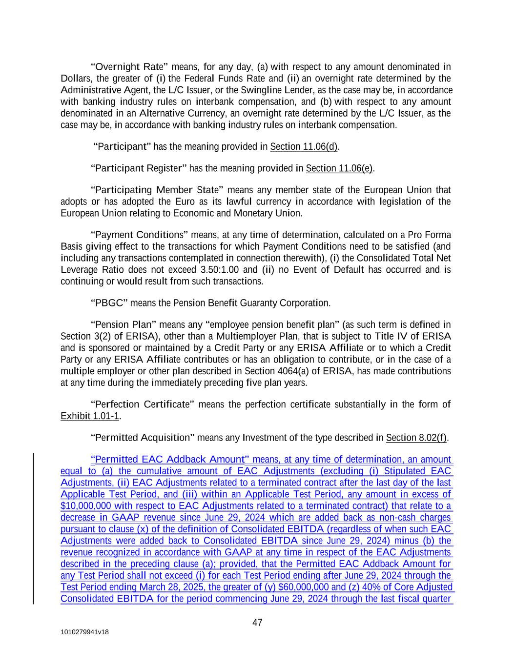 “Overnight Rate” means, for any day, (a) with respect to any amount denominated in Dollars, the greater of (i) the Federal Funds Rate and (ii) an overnight rate determined by the Administrative Agent, the L/C Issuer, or the Swingline Lender, as the case may be, in accordance with banking industry rules on interbank compensation, and (b) with respect to any amount denominated in an Alternative Currency, an overnight rate determined by the L/C Issuer, as the case may be, in accordance with banking industry rules on interbank compensation. “Participant” has the meaning provided in Section 11.06(d). “Participant Register” has the meaning provided in Section 11.06(e). “Participating Member State” means any member state of the European Union that adopts or has adopted the Euro as its lawful currency in accordance with legislation of the European Union relating to Economic and Monetary Union. “Payment Conditions” means, at any time of determination, calculated on a Pro Forma Basis giving effect to the transactions for which Payment Conditions need to be satisfied (and including any transactions contemplated in connection therewith), (i) the Consolidated Total Net Leverage Ratio does not exceed 3.50:1.00 and (ii) no Event of Default has occurred and is continuing or would result from such transactions. “PBGC” means the Pension Benefit Guaranty Corporation. “Pension Plan” means any “employee pension benefit plan” (as such term is defined in Section 3(2) of ERISA), other than a Multiemployer Plan, that is subject to Title IV of ERISA and is sponsored or maintained by a Credit Party or any ERISA Affiliate or to which a Credit Party or any ERISA Affiliate contributes or has an obligation to contribute, or in the case of a multiple employer or other plan described in Section 4064(a) of ERISA, has made contributions at any time during the immediately preceding five plan years. “Perfection Certificate” means the perfection certificate substantially in the form of Exhibit 1.01-1. “Permitted Acquisition” means any Investment of the type described in Section 8.02(f). “Permitted EAC Addback Amount” means, at any time of determination, an amount equal to (a) the cumulative amount of EAC Adjustments (excluding (i) Stipulated EAC Adjustments, (ii) EAC Adjustments related to a terminated contract after the last day of the last Applicable Test Period, and (iii) within an Applicable Test Period, any amount in excess of $10,000,000 with respect to EAC Adjustments related to a terminated contract) that relate to a decrease in GAAP revenue since June 29, 2024 which are added back as non-cash charges pursuant to clause (x) of the definition of Consolidated EBITDA (regardless of when such EAC Adjustments were added back to Consolidated EBITDA since June 29, 2024) minus (b) the revenue recognized in accordance with GAAP at any time in respect of the EAC Adjustments described in the preceding clause (a); provided, that the Permitted EAC Addback Amount for any Test Period shall not exceed (i) for each Test Period ending after June 29, 2024 through the Test Period ending March 28, 2025, the greater of (y) $60,000,000 and (z) 40% of Core Adjusted Consolidated EBITDA for the period commencing June 29, 2024 through the last fiscal quarter 47 1010279941v18