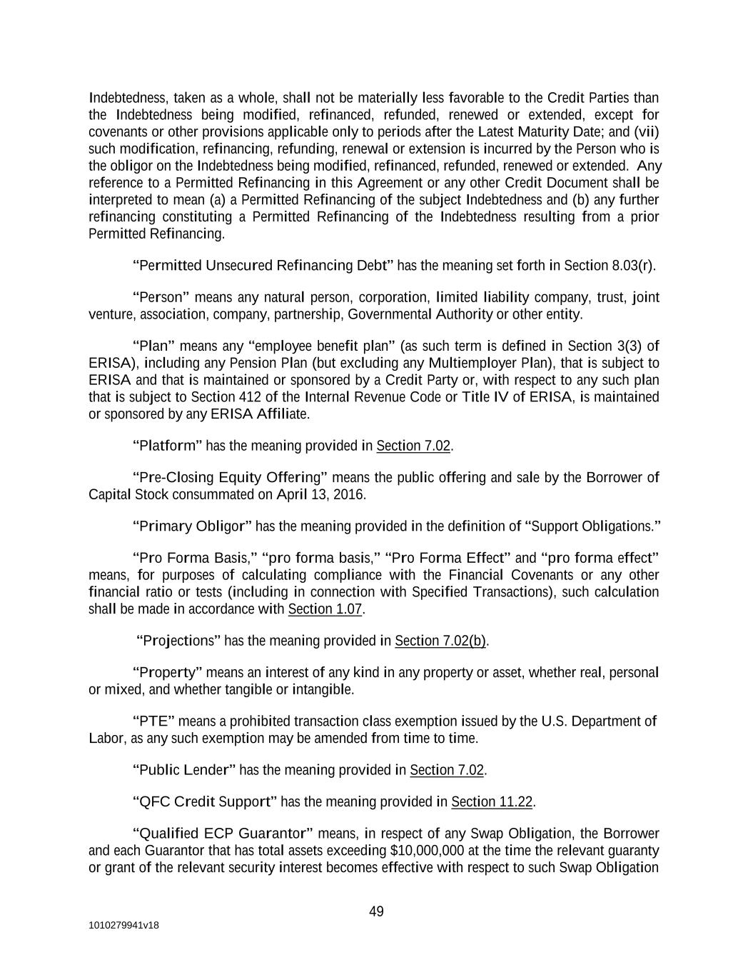 Indebtedness, taken as a whole, shall not be materially less favorable to the Credit Parties than the Indebtedness being modified, refinanced, refunded, renewed or extended, except for covenants or other provisions applicable only to periods after the Latest Maturity Date; and (vii) such modification, refinancing, refunding, renewal or extension is incurred by the Person who is the obligor on the Indebtedness being modified, refinanced, refunded, renewed or extended. Any reference to a Permitted Refinancing in this Agreement or any other Credit Document shall be interpreted to mean (a) a Permitted Refinancing of the subject Indebtedness and (b) any further refinancing constituting a Permitted Refinancing of the Indebtedness resulting from a prior Permitted Refinancing. “Permitted Unsecured Refinancing Debt” has the meaning set forth in Section 8.03(r). “Person” means any natural person, corporation, limited liability company, trust, joint venture, association, company, partnership, Governmental Authority or other entity. “Plan” means any “employee benefit plan” (as such term is defined in Section 3(3) of ERISA), including any Pension Plan (but excluding any Multiemployer Plan), that is subject to ERISA and that is maintained or sponsored by a Credit Party or, with respect to any such plan that is subject to Section 412 of the Internal Revenue Code or Title IV of ERISA, is maintained or sponsored by any ERISA Affiliate. “Platform” has the meaning provided in Section 7.02. “Pre-Closing Equity Offering” means the public offering and sale by the Borrower of Capital Stock consummated on April 13, 2016. “Primary Obligor” has the meaning provided in the definition of “Support Obligations.” “Pro Forma Basis,” “pro forma basis,” “Pro Forma Effect” and “pro forma effect” means, for purposes of calculating compliance with the Financial Covenants or any other financial ratio or tests (including in connection with Specified Transactions), such calculation shall be made in accordance with Section 1.07. “Projections” has the meaning provided in Section 7.02(b). “Property” means an interest of any kind in any property or asset, whether real, personal or mixed, and whether tangible or intangible. “PTE” means a prohibited transaction class exemption issued by the U.S. Department of Labor, as any such exemption may be amended from time to time. “Public Lender” has the meaning provided in Section 7.02. “QFC Credit Support” has the meaning provided in Section 11.22. “Qualified ECP Guarantor” means, in respect of any Swap Obligation, the Borrower and each Guarantor that has total assets exceeding $10,000,000 at the time the relevant guaranty or grant of the relevant security interest becomes effective with respect to such Swap Obligation 49 1010279941v18