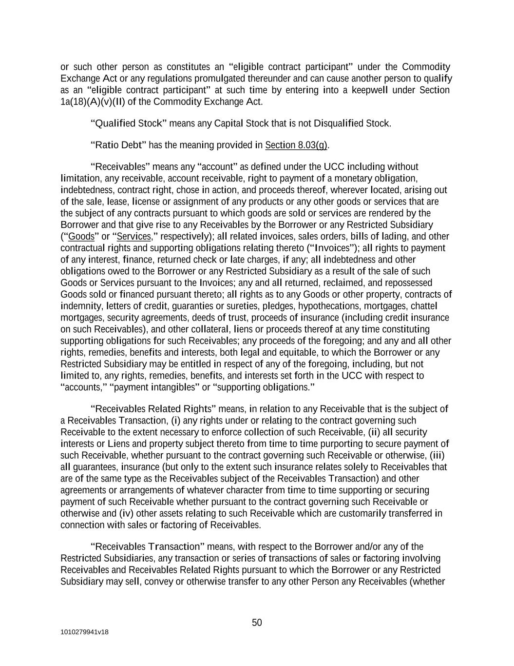 or such other person as constitutes an “eligible contract participant” under the Commodity Exchange Act or any regulations promulgated thereunder and can cause another person to qualify as an “eligible contract participant” at such time by entering into a keepwell under Section 1a(18)(A)(v)(II) of the Commodity Exchange Act. “Qualified Stock” means any Capital Stock that is not Disqualified Stock. “Ratio Debt” has the meaning provided in Section 8.03(g). “Receivables” means any “account” as defined under the UCC including without limitation, any receivable, account receivable, right to payment of a monetary obligation, indebtedness, contract right, chose in action, and proceeds thereof, wherever located, arising out of the sale, lease, license or assignment of any products or any other goods or services that are the subject of any contracts pursuant to which goods are sold or services are rendered by the Borrower and that give rise to any Receivables by the Borrower or any Restricted Subsidiary (“Goods” or “Services,” respectively); all related invoices, sales orders, bills of lading, and other contractual rights and supporting obligations relating thereto (“Invoices”); all rights to payment of any interest, finance, returned check or late charges, if any; all indebtedness and other obligations owed to the Borrower or any Restricted Subsidiary as a result of the sale of such Goods or Services pursuant to the Invoices; any and all returned, reclaimed, and repossessed Goods sold or financed pursuant thereto; all rights as to any Goods or other property, contracts of indemnity, letters of credit, guaranties or sureties, pledges, hypothecations, mortgages, chattel mortgages, security agreements, deeds of trust, proceeds of insurance (including credit insurance on such Receivables), and other collateral, liens or proceeds thereof at any time constituting supporting obligations for such Receivables; any proceeds of the foregoing; and any and all other rights, remedies, benefits and interests, both legal and equitable, to which the Borrower or any Restricted Subsidiary may be entitled in respect of any of the foregoing, including, but not limited to, any rights, remedies, benefits, and interests set forth in the UCC with respect to “accounts,” “payment intangibles” or “supporting obligations.” “Receivables Related Rights” means, in relation to any Receivable that is the subject of a Receivables Transaction, (i) any rights under or relating to the contract governing such Receivable to the extent necessary to enforce collection of such Receivable, (ii) all security interests or Liens and property subject thereto from time to time purporting to secure payment of such Receivable, whether pursuant to the contract governing such Receivable or otherwise, (iii) all guarantees, insurance (but only to the extent such insurance relates solely to Receivables that are of the same type as the Receivables subject of the Receivables Transaction) and other agreements or arrangements of whatever character from time to time supporting or securing payment of such Receivable whether pursuant to the contract governing such Receivable or otherwise and (iv) other assets relating to such Receivable which are customarily transferred in connection with sales or factoring of Receivables. “Receivables Transaction” means, with respect to the Borrower and/or any of the Restricted Subsidiaries, any transaction or series of transactions of sales or factoring involving Receivables and Receivables Related Rights pursuant to which the Borrower or any Restricted Subsidiary may sell, convey or otherwise transfer to any other Person any Receivables (whether 50 1010279941v18