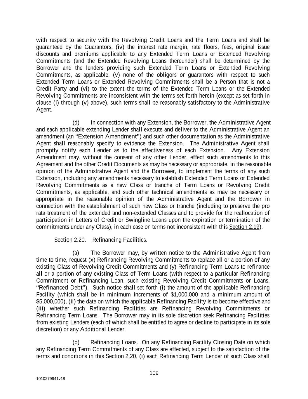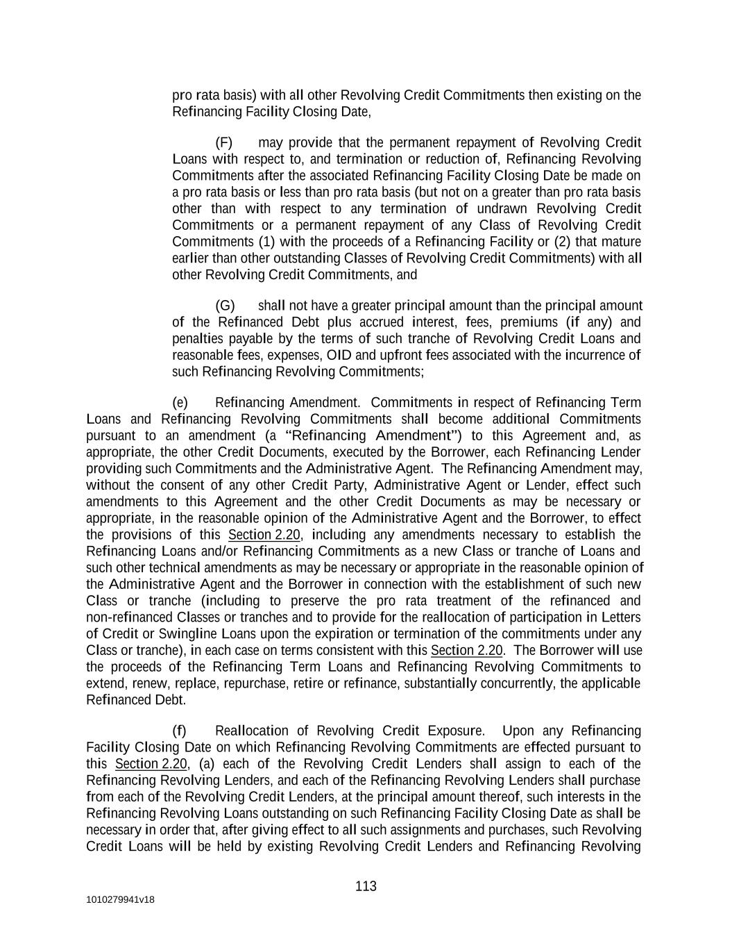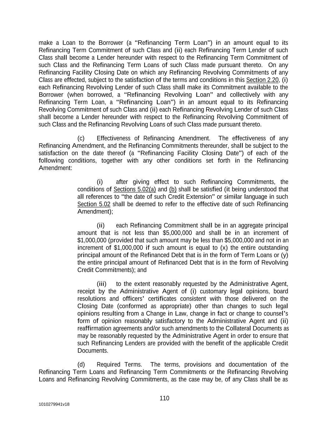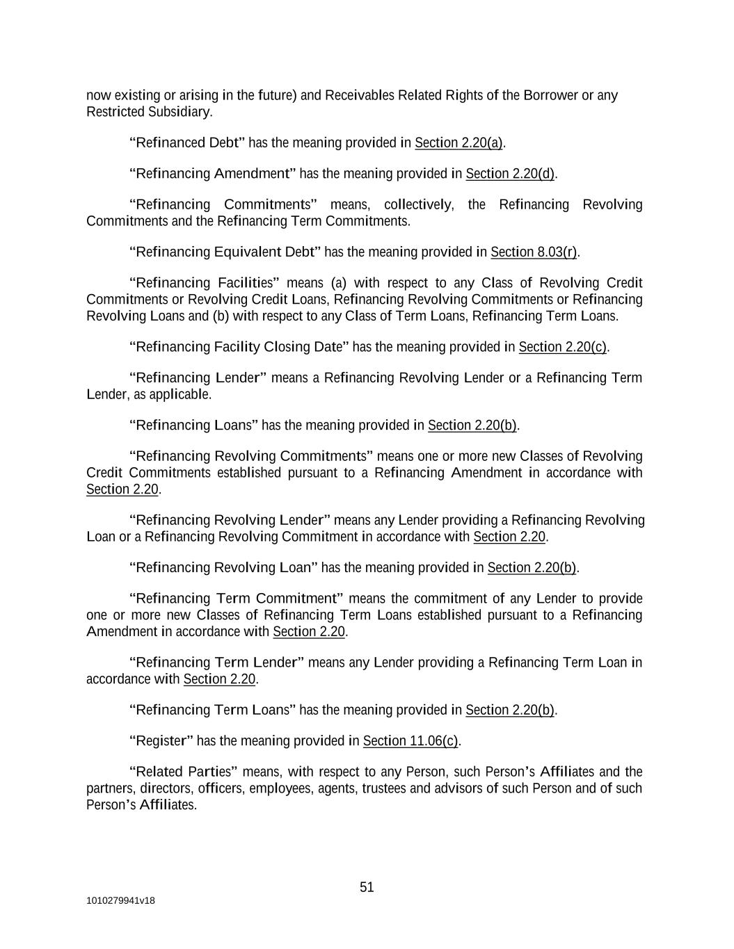 now existing or arising in the future) and Receivables Related Rights of the Borrower or any Restricted Subsidiary. “Refinanced Debt” has the meaning provided in Section 2.20(a). “Refinancing Amendment” has the meaning provided in Section 2.20(d). “Refinancing Commitments” means, collectively, the Refinancing Revolving Commitments and the Refinancing Term Commitments. “Refinancing Equivalent Debt” has the meaning provided in Section 8.03(r). “Refinancing Facilities” means (a) with respect to any Class of Revolving Credit Commitments or Revolving Credit Loans, Refinancing Revolving Commitments or Refinancing Revolving Loans and (b) with respect to any Class of Term Loans, Refinancing Term Loans. “Refinancing Facility Closing Date” has the meaning provided in Section 2.20(c). “Refinancing Lender” means a Refinancing Revolving Lender or a Refinancing Term Lender, as applicable. “Refinancing Loans” has the meaning provided in Section 2.20(b). “Refinancing Revolving Commitments” means one or more new Classes of Revolving Credit Commitments established pursuant to a Refinancing Amendment in accordance with Section 2.20. “Refinancing Revolving Lender” means any Lender providing a Refinancing Revolving Loan or a Refinancing Revolving Commitment in accordance with Section 2.20. “Refinancing Revolving Loan” has the meaning provided in Section 2.20(b). “Refinancing Term Commitment” means the commitment of any Lender to provide one or more new Classes of Refinancing Term Loans established pursuant to a Refinancing Amendment in accordance with Section 2.20. “Refinancing Term Lender” means any Lender providing a Refinancing Term Loan in accordance with Section 2.20. “Refinancing Term Loans” has the meaning provided in Section 2.20(b). “Register” has the meaning provided in Section 11.06(c). “Related Parties” means, with respect to any Person, such Person’s Affiliates and the partners, directors, officers, employees, agents, trustees and advisors of such Person and of such Person’s Affiliates. 51 1010279941v18