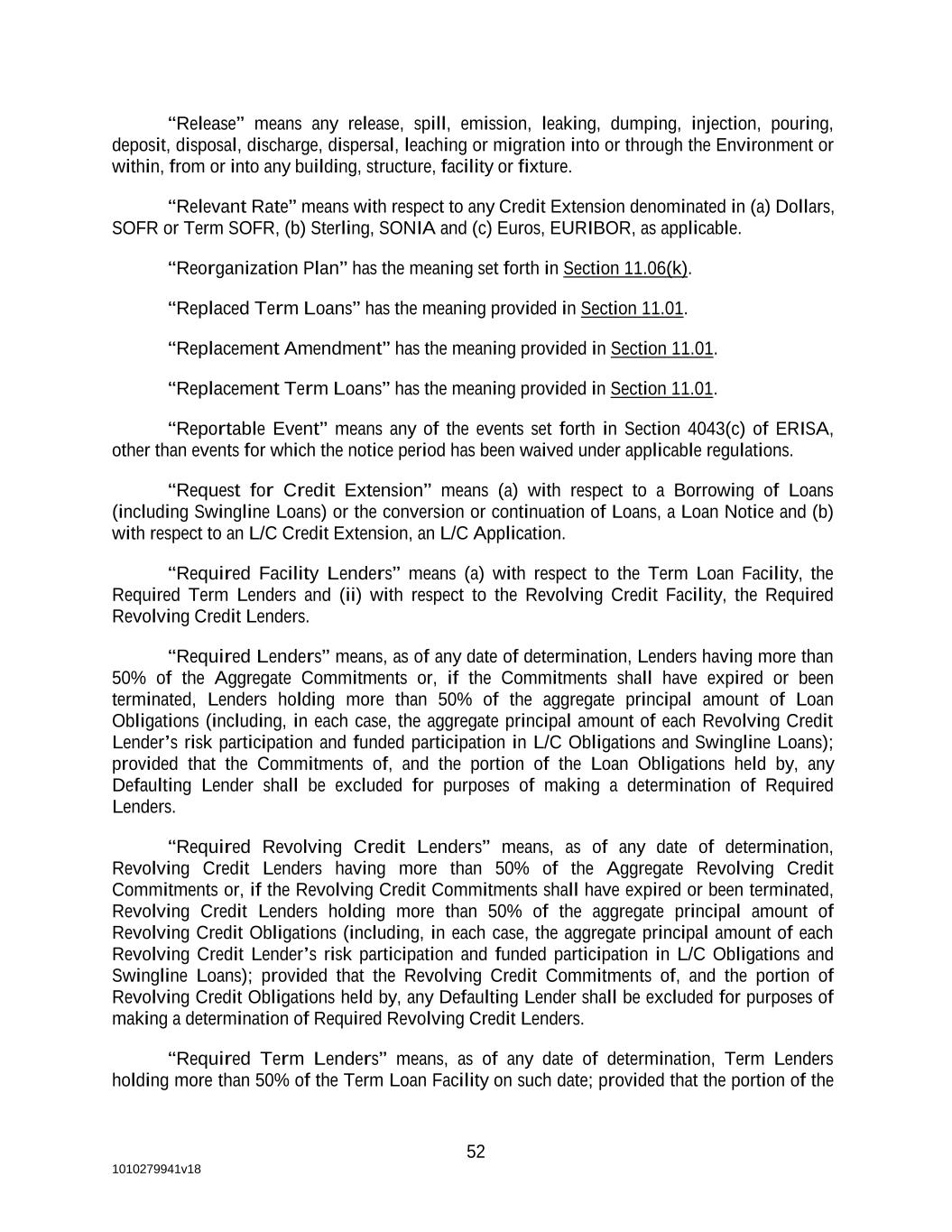 “Release” means any release, spill, emission, leaking, dumping, injection, pouring, deposit, disposal, discharge, dispersal, leaching or migration into or through the Environment or within, from or into any building, structure, facility or fixture. “Relevant Rate” means with respect to any Credit Extension denominated in (a) Dollars, SOFR or Term SOFR, (b) Sterling, SONIA and (c) Euros, EURIBOR, as applicable. “Reorganization Plan” has the meaning set forth in Section 11.06(k). “Replaced Term Loans” has the meaning provided in Section 11.01. “Replacement Amendment” has the meaning provided in Section 11.01. “Replacement Term Loans” has the meaning provided in Section 11.01. “Reportable Event” means any of the events set forth in Section 4043(c) of ERISA, other than events for which the notice period has been waived under applicable regulations. “Request for Credit Extension” means (a) with respect to a Borrowing of Loans (including Swingline Loans) or the conversion or continuation of Loans, a Loan Notice and (b) with respect to an L/C Credit Extension, an L/C Application. “Required Facility Lenders” means (a) with respect to the Term Loan Facility, the Required Term Lenders and (ii) with respect to the Revolving Credit Facility, the Required Revolving Credit Lenders. “Required Lenders” means, as of any date of determination, Lenders having more than 50% of the Aggregate Commitments or, if the Commitments shall have expired or been terminated, Lenders holding more than 50% of the aggregate principal amount of Loan Obligations (including, in each case, the aggregate principal amount of each Revolving Credit Lender’s risk participation and funded participation in L/C Obligations and Swingline Loans); provided that the Commitments of, and the portion of the Loan Obligations held by, any Defaulting Lender shall be excluded for purposes of making a determination of Required Lenders. “Required Revolving Credit Lenders” means, as of any date of determination, Revolving Credit Lenders having more than 50% of the Aggregate Revolving Credit Commitments or, if the Revolving Credit Commitments shall have expired or been terminated, Revolving Credit Lenders holding more than 50% of the aggregate principal amount of Revolving Credit Obligations (including, in each case, the aggregate principal amount of each Revolving Credit Lender’s risk participation and funded participation in L/C Obligations and Swingline Loans); provided that the Revolving Credit Commitments of, and the portion of Revolving Credit Obligations held by, any Defaulting Lender shall be excluded for purposes of making a determination of Required Revolving Credit Lenders. “Required Term Lenders” means, as of any date of determination, Term Lenders holding more than 50% of the Term Loan Facility on such date; provided that the portion of the 52 1010279941v18