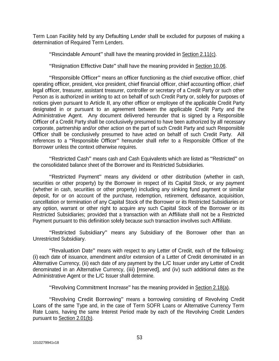 Term Loan Facility held by any Defaulting Lender shall be excluded for purposes of making a determination of Required Term Lenders. “Rescindable Amount” shall have the meaning provided in Section 2.11(c). “Resignation Effective Date” shall have the meaning provided in Section 10.06. “Responsible Officer” means an officer functioning as the chief executive officer, chief operating officer, president, vice president, chief financial officer, chief accounting officer, chief legal officer, treasurer, assistant treasurer, controller or secretary of a Credit Party or such other Person as is authorized in writing to act on behalf of such Credit Party or, solely for purposes of notices given pursuant to Article II, any other officer or employee of the applicable Credit Party designated in or pursuant to an agreement between the applicable Credit Party and the Administrative Agent. Any document delivered hereunder that is signed by a Responsible Officer of a Credit Party shall be conclusively presumed to have been authorized by all necessary corporate, partnership and/or other action on the part of such Credit Party and such Responsible Officer shall be conclusively presumed to have acted on behalf of such Credit Party. All references to a “Responsible Officer” hereunder shall refer to a Responsible Officer of the Borrower unless the context otherwise requires. “Restricted Cash” means cash and Cash Equivalents which are listed as “Restricted” on the consolidated balance sheet of the Borrower and its Restricted Subsidiaries. “Restricted Payment” means any dividend or other distribution (whether in cash, securities or other property) by the Borrower in respect of its Capital Stock, or any payment (whether in cash, securities or other property) including any sinking fund payment or similar deposit, for or on account of the purchase, redemption, retirement, defeasance, acquisition, cancellation or termination of any Capital Stock of the Borrower or its Restricted Subsidiaries or any option, warrant or other right to acquire any such Capital Stock of the Borrower or its Restricted Subsidiaries; provided that a transaction with an Affiliate shall not be a Restricted Payment pursuant to this definition solely because such transaction involves such Affiliate. “Restricted Subsidiary” means any Subsidiary of the Borrower other than an Unrestricted Subsidiary. “Revaluation Date” means with respect to any Letter of Credit, each of the following: (i) each date of issuance, amendment and/or extension of a Letter of Credit denominated in an Alternative Currency, (ii) each date of any payment by the L/C Issuer under any Letter of Credit denominated in an Alternative Currency, (iii) [reserved], and (iv) such additional dates as the Administrative Agent or the L/C Issuer shall determine. “Revolving Commitment Increase” has the meaning provided in Section 2.18(a). “Revolving Credit Borrowing” means a borrowing consisting of Revolving Credit Loans of the same Type and, in the case of Term SOFR Loans or Alternative Currency Term Rate Loans, having the same Interest Period made by each of the Revolving Credit Lenders pursuant to Section 2.01(b). 53 1010279941v18