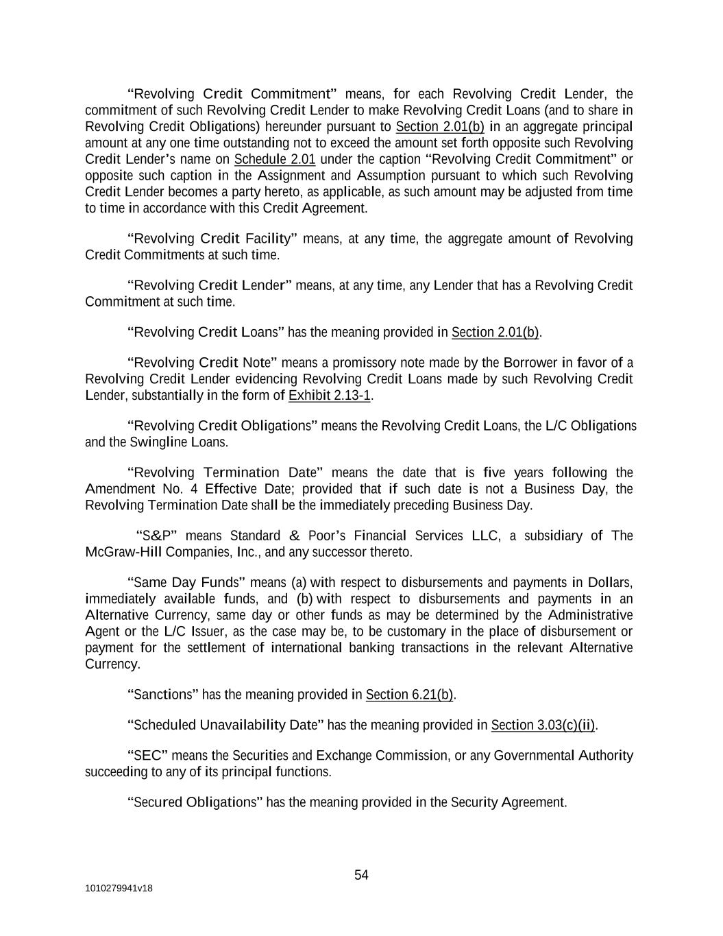 “Revolving Credit Commitment” means, for each Revolving Credit Lender, the commitment of such Revolving Credit Lender to make Revolving Credit Loans (and to share in Revolving Credit Obligations) hereunder pursuant to Section 2.01(b) in an aggregate principal amount at any one time outstanding not to exceed the amount set forth opposite such Revolving Credit Lender’s name on Schedule 2.01 under the caption “Revolving Credit Commitment” or opposite such caption in the Assignment and Assumption pursuant to which such Revolving Credit Lender becomes a party hereto, as applicable, as such amount may be adjusted from time to time in accordance with this Credit Agreement. “Revolving Credit Facility” means, at any time, the aggregate amount of Revolving Credit Commitments at such time. “Revolving Credit Lender” means, at any time, any Lender that has a Revolving Credit Commitment at such time. “Revolving Credit Loans” has the meaning provided in Section 2.01(b). “Revolving Credit Note” means a promissory note made by the Borrower in favor of a Revolving Credit Lender evidencing Revolving Credit Loans made by such Revolving Credit Lender, substantially in the form of Exhibit 2.13-1. “Revolving Credit Obligations” means the Revolving Credit Loans, the L/C Obligations and the Swingline Loans. “Revolving Termination Date” means the date that is five years following the Amendment No. 4 Effective Date; provided that if such date is not a Business Day, the Revolving Termination Date shall be the immediately preceding Business Day. “S&P” means Standard & Poor’s Financial Services LLC, a subsidiary of The McGraw-Hill Companies, Inc., and any successor thereto. “Same Day Funds” means (a) with respect to disbursements and payments in Dollars, immediately available funds, and (b) with respect to disbursements and payments in an Alternative Currency, same day or other funds as may be determined by the Administrative Agent or the L/C Issuer, as the case may be, to be customary in the place of disbursement or payment for the settlement of international banking transactions in the relevant Alternative Currency. “Sanctions” has the meaning provided in Section 6.21(b). “Scheduled Unavailability Date” has the meaning provided in Section 3.03(c)(ii). “SEC” means the Securities and Exchange Commission, or any Governmental Authority succeeding to any of its principal functions. “Secured Obligations” has the meaning provided in the Security Agreement. 54 1010279941v18