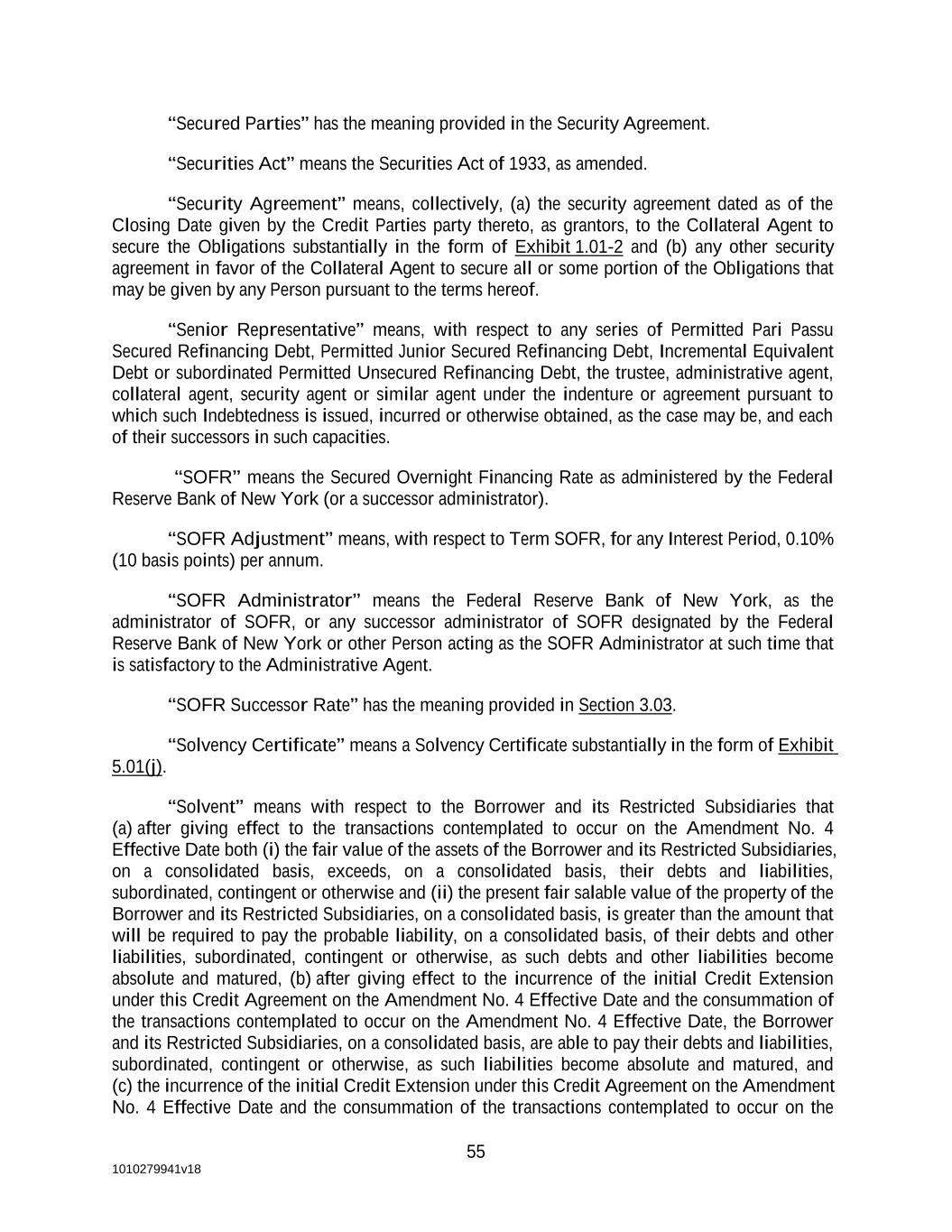 “Secured Parties” has the meaning provided in the Security Agreement. “Securities Act” means the Securities Act of 1933, as amended. “Security Agreement” means, collectively, (a) the security agreement dated as of the Closing Date given by the Credit Parties party thereto, as grantors, to the Collateral Agent to secure the Obligations substantially in the form of Exhibit 1.01-2 and (b) any other security agreement in favor of the Collateral Agent to secure all or some portion of the Obligations that may be given by any Person pursuant to the terms hereof. “Senior Representative” means, with respect to any series of Permitted Pari Passu Secured Refinancing Debt, Permitted Junior Secured Refinancing Debt, Incremental Equivalent Debt or subordinated Permitted Unsecured Refinancing Debt, the trustee, administrative agent, collateral agent, security agent or similar agent under the indenture or agreement pursuant to which such Indebtedness is issued, incurred or otherwise obtained, as the case may be, and each of their successors in such capacities. “SOFR” means the Secured Overnight Financing Rate as administered by the Federal Reserve Bank of New York (or a successor administrator). “SOFR Adjustment” means, with respect to Term SOFR, for any Interest Period, 0.10% (10 basis points) per annum. “SOFR Administrator” means the Federal Reserve Bank of New York, as the administrator of SOFR, or any successor administrator of SOFR designated by the Federal Reserve Bank of New York or other Person acting as the SOFR Administrator at such time that is satisfactory to the Administrative Agent. “SOFR Successor Rate” has the meaning provided in Section 3.03. “Solvency Certificate” means a Solvency Certificate substantially in the form of Exhibit 5.01(j). “Solvent” means with respect to the Borrower and its Restricted Subsidiaries that (a) after giving effect to the transactions contemplated to occur on the Amendment No. 4 Effective Date both (i) the fair value of the assets of the Borrower and its Restricted Subsidiaries, on a consolidated basis, exceeds, on a consolidated basis, their debts and liabilities, subordinated, contingent or otherwise and (ii) the present fair salable value of the property of the Borrower and its Restricted Subsidiaries, on a consolidated basis, is greater than the amount that will be required to pay the probable liability, on a consolidated basis, of their debts and other liabilities, subordinated, contingent or otherwise, as such debts and other liabilities become absolute and matured, (b) after giving effect to the incurrence of the initial Credit Extension under this Credit Agreement on the Amendment No. 4 Effective Date and the consummation of the transactions contemplated to occur on the Amendment No. 4 Effective Date, the Borrower and its Restricted Subsidiaries, on a consolidated basis, are able to pay their debts and liabilities, subordinated, contingent or otherwise, as such liabilities become absolute and matured, and (c) the incurrence of the initial Credit Extension under this Credit Agreement on the Amendment No. 4 Effective Date and the consummation of the transactions contemplated to occur on the 55 1010279941v18