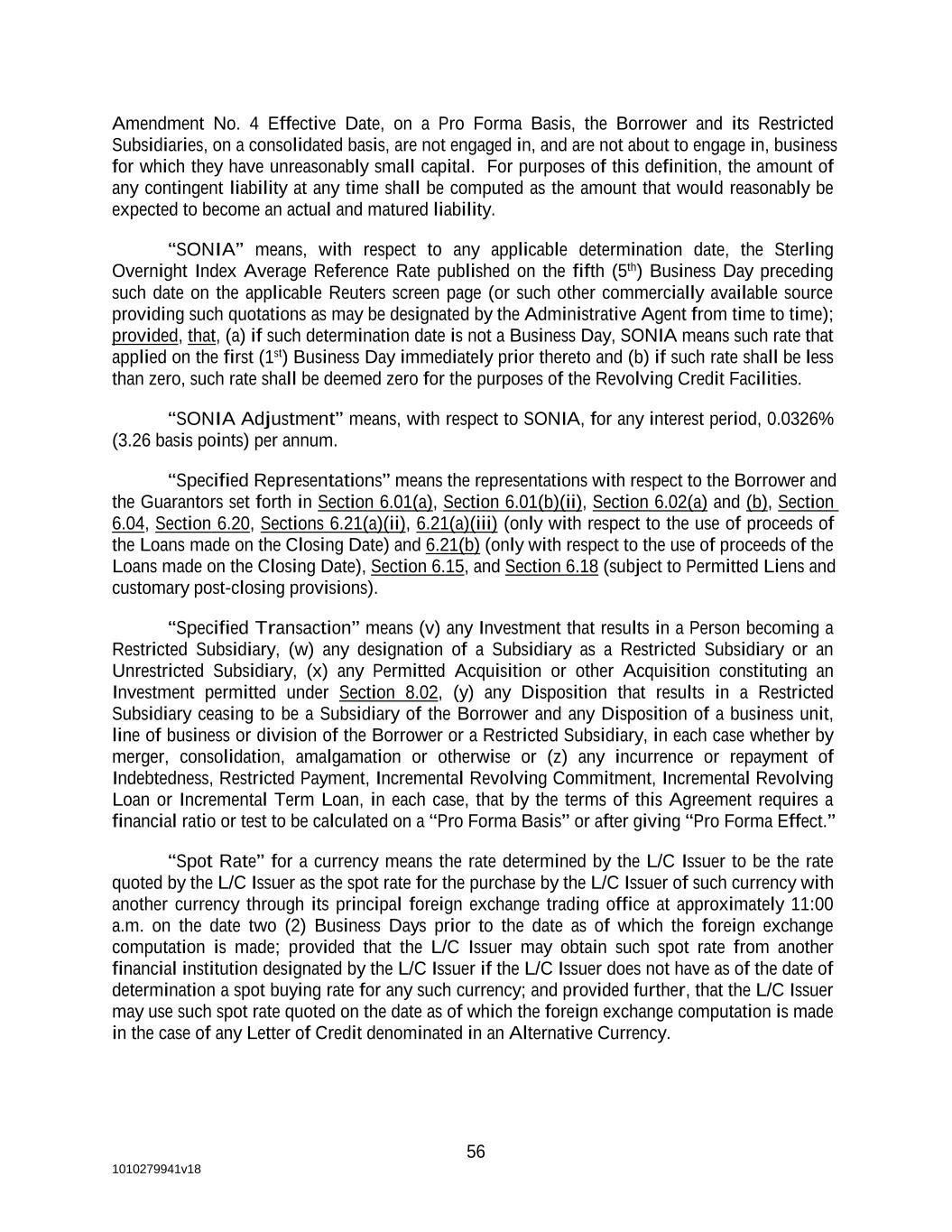Amendment No. 4 Effective Date, on a Pro Forma Basis, the Borrower and its Restricted Subsidiaries, on a consolidated basis, are not engaged in, and are not about to engage in, business for which they have unreasonably small capital. For purposes of this definition, the amount of any contingent liability at any time shall be computed as the amount that would reasonably be expected to become an actual and matured liability. “SONIA” means, with respect to any applicable determination date, the Sterling Overnight Index Average Reference Rate published on the fifth (5th) Business Day preceding such date on the applicable Reuters screen page (or such other commercially available source providing such quotations as may be designated by the Administrative Agent from time to time); provided, that, (a) if such determination date is not a Business Day, SONIA means such rate that applied on the first (1st) Business Day immediately prior thereto and (b) if such rate shall be less than zero, such rate shall be deemed zero for the purposes of the Revolving Credit Facilities. “SONIA Adjustment” means, with respect to SONIA, for any interest period, 0.0326% (3.26 basis points) per annum. “Specified Representations” means the representations with respect to the Borrower and the Guarantors set forth in Section 6.01(a), Section 6.01(b)(ii), Section 6.02(a) and (b), Section 6.04, Section 6.20, Sections 6.21(a)(ii), 6.21(a)(iii) (only with respect to the use of proceeds of the Loans made on the Closing Date) and 6.21(b) (only with respect to the use of proceeds of the Loans made on the Closing Date), Section 6.15, and Section 6.18 (subject to Permitted Liens and customary post-closing provisions). “Specified Transaction” means (v) any Investment that results in a Person becoming a Restricted Subsidiary, (w) any designation of a Subsidiary as a Restricted Subsidiary or an Unrestricted Subsidiary, (x) any Permitted Acquisition or other Acquisition constituting an Investment permitted under Section 8.02, (y) any Disposition that results in a Restricted Subsidiary ceasing to be a Subsidiary of the Borrower and any Disposition of a business unit, line of business or division of the Borrower or a Restricted Subsidiary, in each case whether by merger, consolidation, amalgamation or otherwise or (z) any incurrence or repayment of Indebtedness, Restricted Payment, Incremental Revolving Commitment, Incremental Revolving Loan or Incremental Term Loan, in each case, that by the terms of this Agreement requires a financial ratio or test to be calculated on a “Pro Forma Basis” or after giving “Pro Forma Effect.” “Spot Rate” for a currency means the rate determined by the L/C Issuer to be the rate quoted by the L/C Issuer as the spot rate for the purchase by the L/C Issuer of such currency with another currency through its principal foreign exchange trading office at approximately 11:00 a.m. on the date two (2) Business Days prior to the date as of which the foreign exchange computation is made; provided that the L/C Issuer may obtain such spot rate from another financial institution designated by the L/C Issuer if the L/C Issuer does not have as of the date of determination a spot buying rate for any such currency; and provided further, that the L/C Issuer may use such spot rate quoted on the date as of which the foreign exchange computation is made in the case of any Letter of Credit denominated in an Alternative Currency. 56 1010279941v18