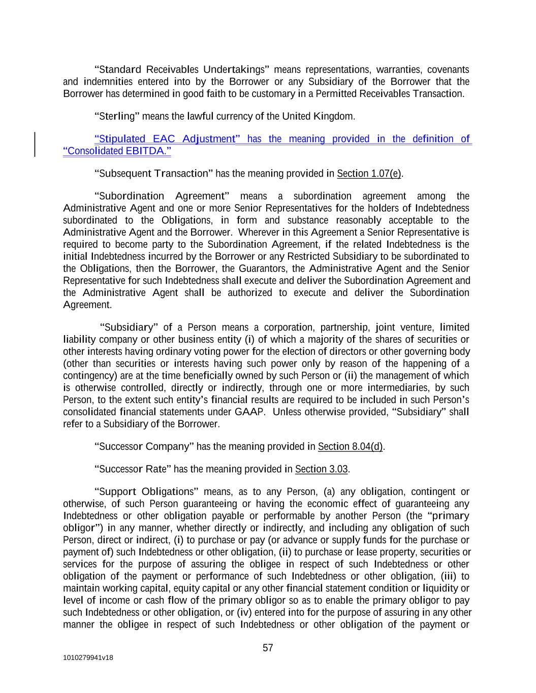 “Standard Receivables Undertakings” means representations, warranties, covenants and indemnities entered into by the Borrower or any Subsidiary of the Borrower that the Borrower has determined in good faith to be customary in a Permitted Receivables Transaction. “Sterling” means the lawful currency of the United Kingdom. “Stipulated EAC Adjustment” has the meaning provided in the definition of “Consolidated EBITDA.” “Subsequent Transaction” has the meaning provided in Section 1.07(e). “Subordination Agreement” means a subordination agreement among the Administrative Agent and one or more Senior Representatives for the holders of Indebtedness subordinated to the Obligations, in form and substance reasonably acceptable to the Administrative Agent and the Borrower. Wherever in this Agreement a Senior Representative is required to become party to the Subordination Agreement, if the related Indebtedness is the initial Indebtedness incurred by the Borrower or any Restricted Subsidiary to be subordinated to the Obligations, then the Borrower, the Guarantors, the Administrative Agent and the Senior Representative for such Indebtedness shall execute and deliver the Subordination Agreement and the Administrative Agent shall be authorized to execute and deliver the Subordination Agreement. “Subsidiary” of a Person means a corporation, partnership, joint venture, limited liability company or other business entity (i) of which a majority of the shares of securities or other interests having ordinary voting power for the election of directors or other governing body (other than securities or interests having such power only by reason of the happening of a contingency) are at the time beneficially owned by such Person or (ii) the management of which is otherwise controlled, directly or indirectly, through one or more intermediaries, by such Person, to the extent such entity’s financial results are required to be included in such Person’s consolidated financial statements under GAAP. Unless otherwise provided, “Subsidiary” shall refer to a Subsidiary of the Borrower. “Successor Company” has the meaning provided in Section 8.04(d). “Successor Rate” has the meaning provided in Section 3.03. “Support Obligations” means, as to any Person, (a) any obligation, contingent or otherwise, of such Person guaranteeing or having the economic effect of guaranteeing any Indebtedness or other obligation payable or performable by another Person (the “primary obligor”) in any manner, whether directly or indirectly, and including any obligation of such Person, direct or indirect, (i) to purchase or pay (or advance or supply funds for the purchase or payment of) such Indebtedness or other obligation, (ii) to purchase or lease property, securities or services for the purpose of assuring the obligee in respect of such Indebtedness or other obligation of the payment or performance of such Indebtedness or other obligation, (iii) to maintain working capital, equity capital or any other financial statement condition or liquidity or level of income or cash flow of the primary obligor so as to enable the primary obligor to pay such Indebtedness or other obligation, or (iv) entered into for the purpose of assuring in any other manner the obligee in respect of such Indebtedness or other obligation of the payment or 57 1010279941v18