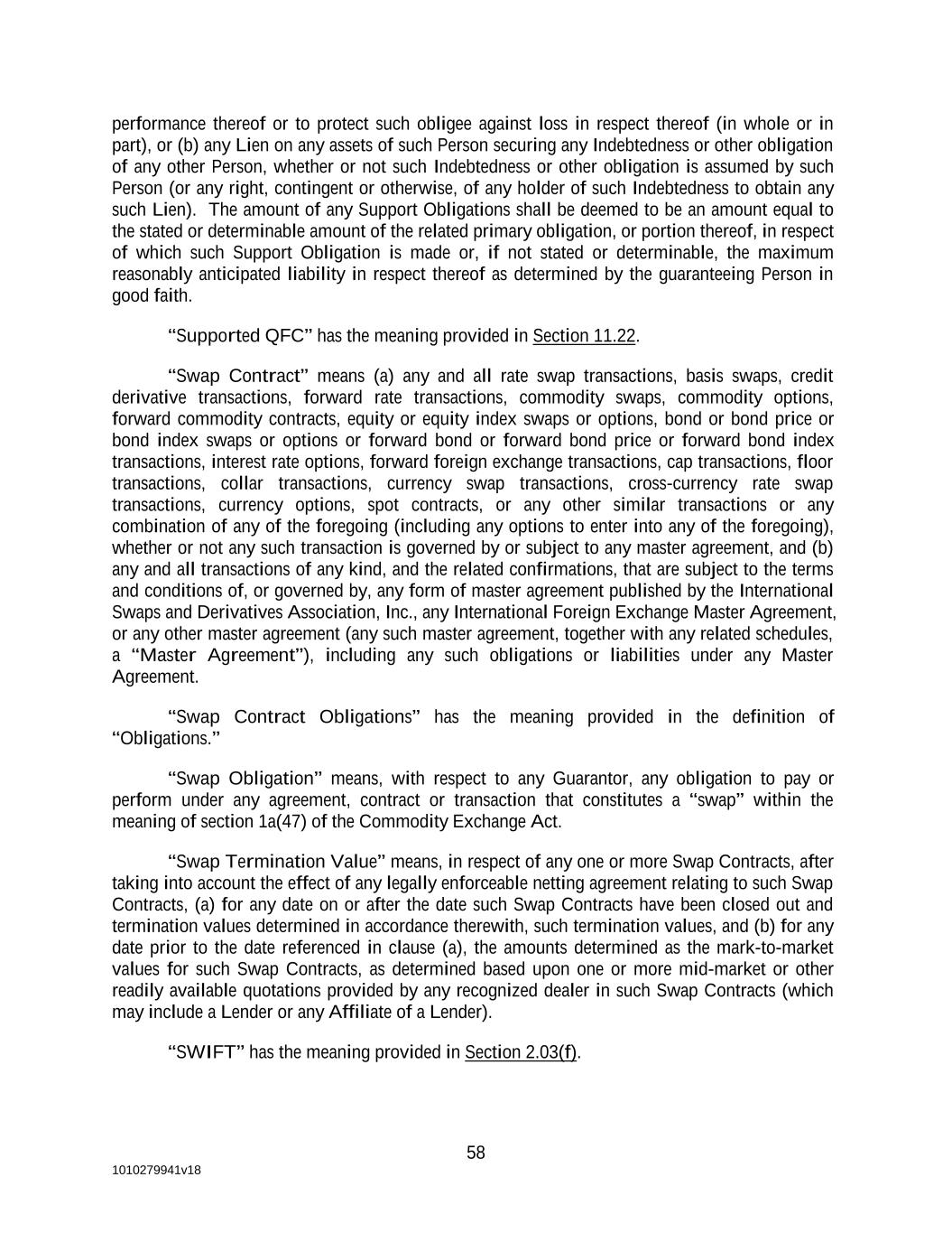 performance thereof or to protect such obligee against loss in respect thereof (in whole or in part), or (b) any Lien on any assets of such Person securing any Indebtedness or other obligation of any other Person, whether or not such Indebtedness or other obligation is assumed by such Person (or any right, contingent or otherwise, of any holder of such Indebtedness to obtain any such Lien). The amount of any Support Obligations shall be deemed to be an amount equal to the stated or determinable amount of the related primary obligation, or portion thereof, in respect of which such Support Obligation is made or, if not stated or determinable, the maximum reasonably anticipated liability in respect thereof as determined by the guaranteeing Person in good faith. “Supported QFC” has the meaning provided in Section 11.22. “Swap Contract” means (a) any and all rate swap transactions, basis swaps, credit derivative transactions, forward rate transactions, commodity swaps, commodity options, forward commodity contracts, equity or equity index swaps or options, bond or bond price or bond index swaps or options or forward bond or forward bond price or forward bond index transactions, interest rate options, forward foreign exchange transactions, cap transactions, floor transactions, collar transactions, currency swap transactions, cross-currency rate swap transactions, currency options, spot contracts, or any other similar transactions or any combination of any of the foregoing (including any options to enter into any of the foregoing), whether or not any such transaction is governed by or subject to any master agreement, and (b) any and all transactions of any kind, and the related confirmations, that are subject to the terms and conditions of, or governed by, any form of master agreement published by the International Swaps and Derivatives Association, Inc., any International Foreign Exchange Master Agreement, or any other master agreement (any such master agreement, together with any related schedules, a “Master Agreement”), including any such obligations or liabilities under any Master Agreement. “Swap Contract Obligations” has the meaning provided in the definition of “Obligations.” “Swap Obligation” means, with respect to any Guarantor, any obligation to pay or perform under any agreement, contract or transaction that constitutes a “swap” within the meaning of section 1a(47) of the Commodity Exchange Act. “Swap Termination Value” means, in respect of any one or more Swap Contracts, after taking into account the effect of any legally enforceable netting agreement relating to such Swap Contracts, (a) for any date on or after the date such Swap Contracts have been closed out and termination values determined in accordance therewith, such termination values, and (b) for any date prior to the date referenced in clause (a), the amounts determined as the mark-to-market values for such Swap Contracts, as determined based upon one or more mid-market or other readily available quotations provided by any recognized dealer in such Swap Contracts (which may include a Lender or any Affiliate of a Lender). “SWIFT” has the meaning provided in Section 2.03(f). 58 1010279941v18