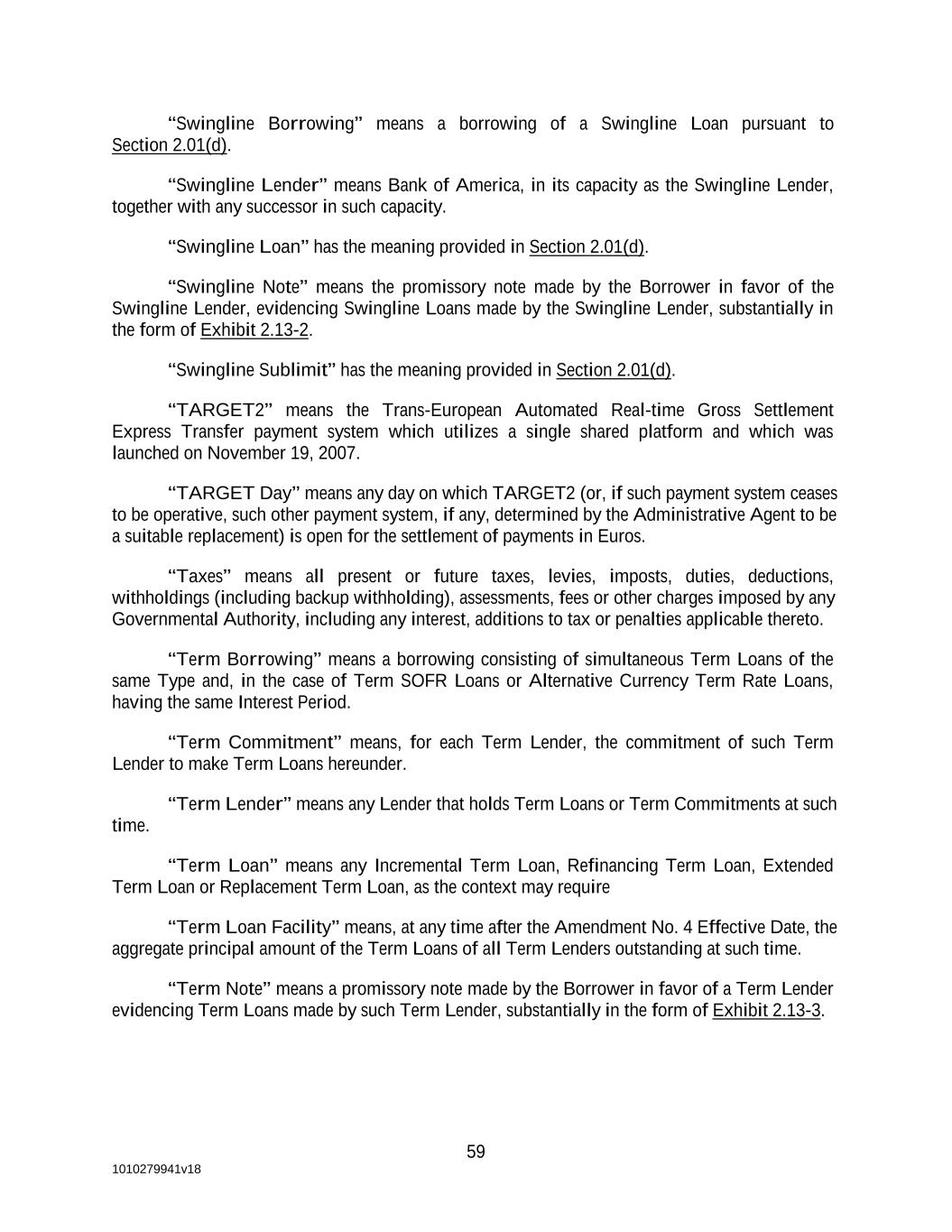 “Swingline Borrowing” means a borrowing of a Swingline Loan pursuant to Section 2.01(d). “Swingline Lender” means Bank of America, in its capacity as the Swingline Lender, together with any successor in such capacity. “Swingline Loan” has the meaning provided in Section 2.01(d). “Swingline Note” means the promissory note made by the Borrower in favor of the Swingline Lender, evidencing Swingline Loans made by the Swingline Lender, substantially in the form of Exhibit 2.13-2. “Swingline Sublimit” has the meaning provided in Section 2.01(d). “TARGET2” means the Trans-European Automated Real-time Gross Settlement Express Transfer payment system which utilizes a single shared platform and which was launched on November 19, 2007. “TARGET Day” means any day on which TARGET2 (or, if such payment system ceases to be operative, such other payment system, if any, determined by the Administrative Agent to be a suitable replacement) is open for the settlement of payments in Euros. “Taxes” means all present or future taxes, levies, imposts, duties, deductions, withholdings (including backup withholding), assessments, fees or other charges imposed by any Governmental Authority, including any interest, additions to tax or penalties applicable thereto. “Term Borrowing” means a borrowing consisting of simultaneous Term Loans of the same Type and, in the case of Term SOFR Loans or Alternative Currency Term Rate Loans, having the same Interest Period. “Term Commitment” means, for each Term Lender, the commitment of such Term Lender to make Term Loans hereunder. “Term Lender” means any Lender that holds Term Loans or Term Commitments at such time. “Term Loan” means any Incremental Term Loan, Refinancing Term Loan, Extended Term Loan or Replacement Term Loan, as the context may require “Term Loan Facility” means, at any time after the Amendment No. 4 Effective Date, the aggregate principal amount of the Term Loans of all Term Lenders outstanding at such time. “Term Note” means a promissory note made by the Borrower in favor of a Term Lender evidencing Term Loans made by such Term Lender, substantially in the form of Exhibit 2.13-3. 59 1010279941v18