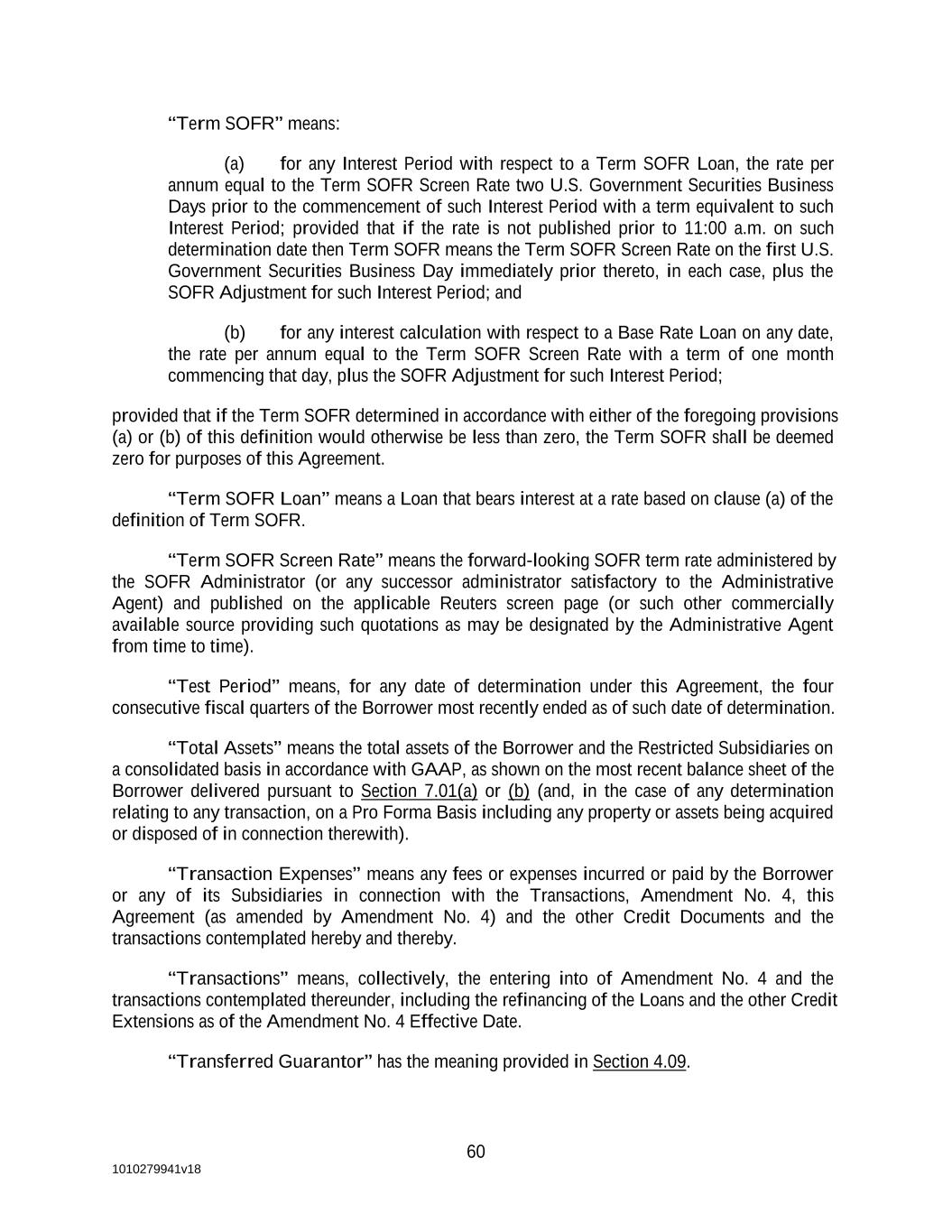 “Term SOFR” means: (a) for any Interest Period with respect to a Term SOFR Loan, the rate per annum equal to the Term SOFR Screen Rate two U.S. Government Securities Business Days prior to the commencement of such Interest Period with a term equivalent to such Interest Period; provided that if the rate is not published prior to 11:00 a.m. on such determination date then Term SOFR means the Term SOFR Screen Rate on the first U.S. Government Securities Business Day immediately prior thereto, in each case, plus the SOFR Adjustment for such Interest Period; and (b) for any interest calculation with respect to a Base Rate Loan on any date, the rate per annum equal to the Term SOFR Screen Rate with a term of one month commencing that day, plus the SOFR Adjustment for such Interest Period; provided that if the Term SOFR determined in accordance with either of the foregoing provisions (a) or (b) of this definition would otherwise be less than zero, the Term SOFR shall be deemed zero for purposes of this Agreement. “Term SOFR Loan” means a Loan that bears interest at a rate based on clause (a) of the definition of Term SOFR. “Term SOFR Screen Rate” means the forward-looking SOFR term rate administered by the SOFR Administrator (or any successor administrator satisfactory to the Administrative Agent) and published on the applicable Reuters screen page (or such other commercially available source providing such quotations as may be designated by the Administrative Agent from time to time). “Test Period” means, for any date of determination under this Agreement, the four consecutive fiscal quarters of the Borrower most recently ended as of such date of determination. “Total Assets” means the total assets of the Borrower and the Restricted Subsidiaries on a consolidated basis in accordance with GAAP, as shown on the most recent balance sheet of the Borrower delivered pursuant to Section 7.01(a) or (b) (and, in the case of any determination relating to any transaction, on a Pro Forma Basis including any property or assets being acquired or disposed of in connection therewith). “Transaction Expenses” means any fees or expenses incurred or paid by the Borrower or any of its Subsidiaries in connection with the Transactions, Amendment No. 4, this Agreement (as amended by Amendment No. 4) and the other Credit Documents and the transactions contemplated hereby and thereby. “Transactions” means, collectively, the entering into of Amendment No. 4 and the transactions contemplated thereunder, including the refinancing of the Loans and the other Credit Extensions as of the Amendment No. 4 Effective Date. “Transferred Guarantor” has the meaning provided in Section 4.09. 60 1010279941v18