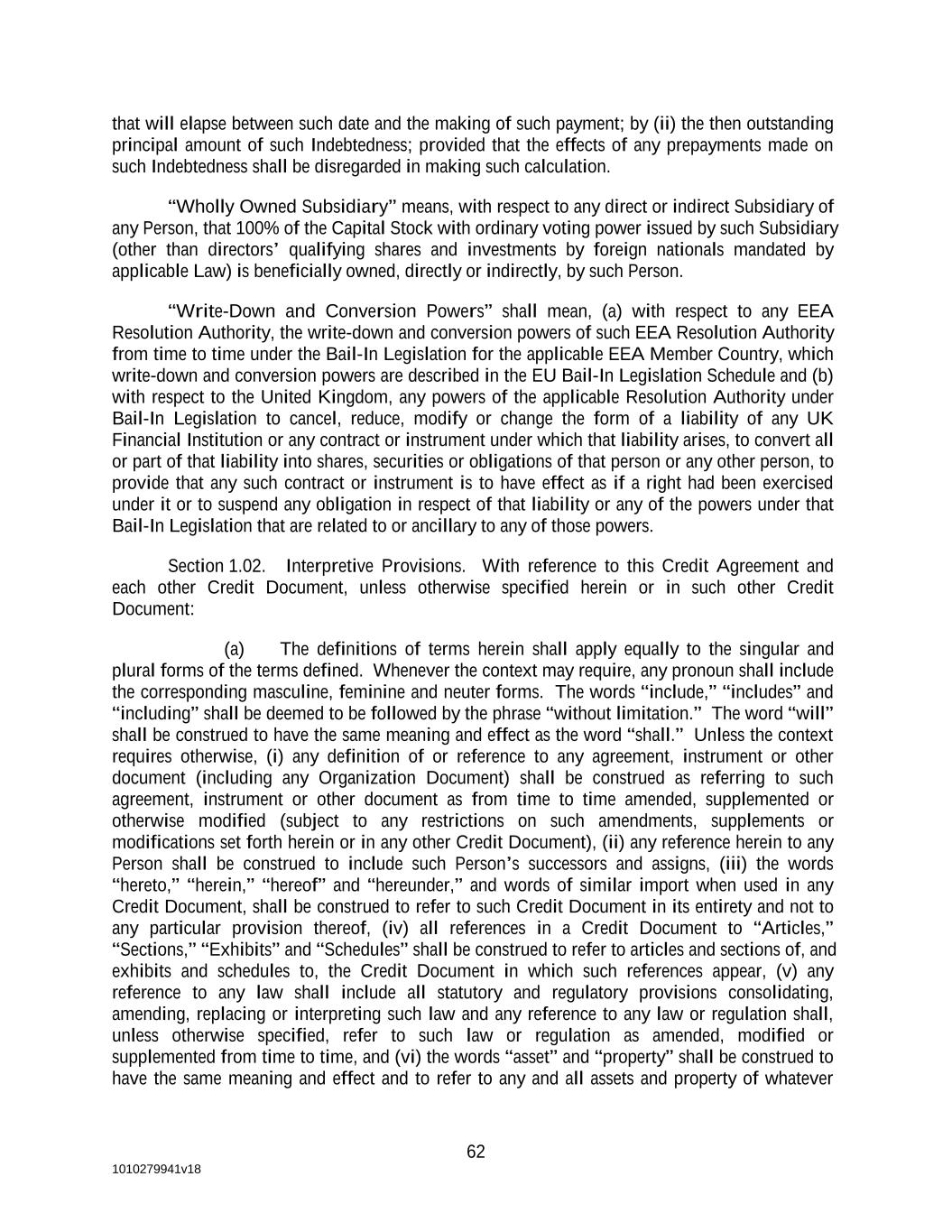 that will elapse between such date and the making of such payment; by (ii) the then outstanding principal amount of such Indebtedness; provided that the effects of any prepayments made on such Indebtedness shall be disregarded in making such calculation. “Wholly Owned Subsidiary” means, with respect to any direct or indirect Subsidiary of any Person, that 100% of the Capital Stock with ordinary voting power issued by such Subsidiary (other than directors’ qualifying shares and investments by foreign nationals mandated by applicable Law) is beneficially owned, directly or indirectly, by such Person. “Write-Down and Conversion Powers” shall mean, (a) with respect to any EEA Resolution Authority, the write-down and conversion powers of such EEA Resolution Authority from time to time under the Bail-In Legislation for the applicable EEA Member Country, which write-down and conversion powers are described in the EU Bail-In Legislation Schedule and (b) with respect to the United Kingdom, any powers of the applicable Resolution Authority under Bail-In Legislation to cancel, reduce, modify or change the form of a liability of any UK Financial Institution or any contract or instrument under which that liability arises, to convert all or part of that liability into shares, securities or obligations of that person or any other person, to provide that any such contract or instrument is to have effect as if a right had been exercised under it or to suspend any obligation in respect of that liability or any of the powers under that Bail-In Legislation that are related to or ancillary to any of those powers. Section 1.02. Interpretive Provisions. With reference to this Credit Agreement and each other Credit Document, unless otherwise specified herein or in such other Credit Document: (a) The definitions of terms herein shall apply equally to the singular and plural forms of the terms defined. Whenever the context may require, any pronoun shall include the corresponding masculine, feminine and neuter forms. The words “include,” “includes” and “including” shall be deemed to be followed by the phrase “without limitation.” The word “will” shall be construed to have the same meaning and effect as the word “shall.” Unless the context requires otherwise, (i) any definition of or reference to any agreement, instrument or other document (including any Organization Document) shall be construed as referring to such agreement, instrument or other document as from time to time amended, supplemented or otherwise modified (subject to any restrictions on such amendments, supplements or modifications set forth herein or in any other Credit Document), (ii) any reference herein to any Person shall be construed to include such Person’s successors and assigns, (iii) the words “hereto,” “herein,” “hereof” and “hereunder,” and words of similar import when used in any Credit Document, shall be construed to refer to such Credit Document in its entirety and not to any particular provision thereof, (iv) all references in a Credit Document to “Articles,” “Sections,” “Exhibits” and “Schedules” shall be construed to refer to articles and sections of, and exhibits and schedules to, the Credit Document in which such references appear, (v) any reference to any law shall include all statutory and regulatory provisions consolidating, amending, replacing or interpreting such law and any reference to any law or regulation shall, unless otherwise specified, refer to such law or regulation as amended, modified or supplemented from time to time, and (vi) the words “asset” and “property” shall be construed to have the same meaning and effect and to refer to any and all assets and property of whatever 62 1010279941v18