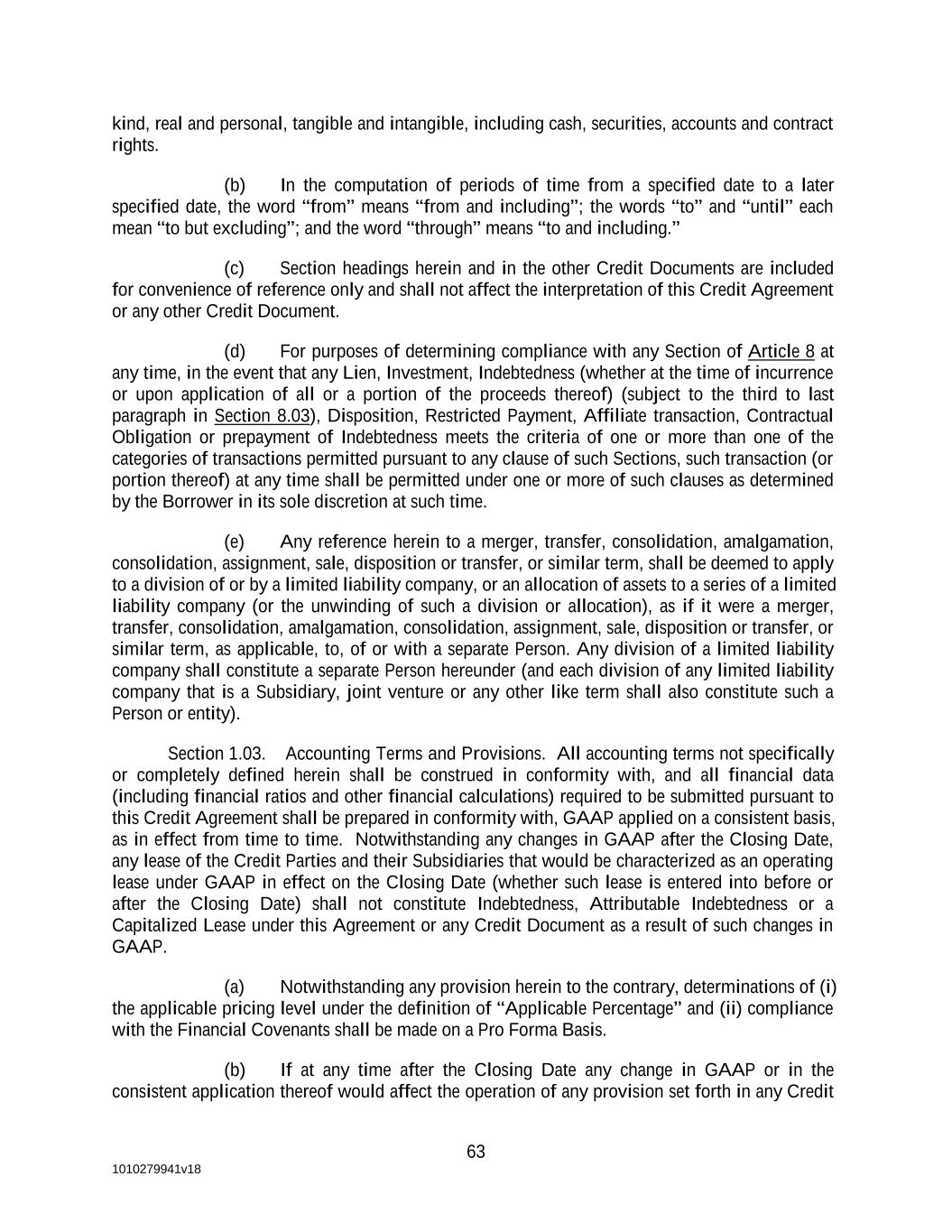 kind, real and personal, tangible and intangible, including cash, securities, accounts and contract rights. (b) In the computation of periods of time from a specified date to a later specified date, the word “from” means “from and including”; the words “to” and “until” each mean “to but excluding”; and the word “through” means “to and including.” (c) Section headings herein and in the other Credit Documents are included for convenience of reference only and shall not affect the interpretation of this Credit Agreement or any other Credit Document. (d) For purposes of determining compliance with any Section of Article 8 at any time, in the event that any Lien, Investment, Indebtedness (whether at the time of incurrence or upon application of all or a portion of the proceeds thereof) (subject to the third to last paragraph in Section 8.03), Disposition, Restricted Payment, Affiliate transaction, Contractual Obligation or prepayment of Indebtedness meets the criteria of one or more than one of the categories of transactions permitted pursuant to any clause of such Sections, such transaction (or portion thereof) at any time shall be permitted under one or more of such clauses as determined by the Borrower in its sole discretion at such time. (e) Any reference herein to a merger, transfer, consolidation, amalgamation, consolidation, assignment, sale, disposition or transfer, or similar term, shall be deemed to apply to a division of or by a limited liability company, or an allocation of assets to a series of a limited liability company (or the unwinding of such a division or allocation), as if it were a merger, transfer, consolidation, amalgamation, consolidation, assignment, sale, disposition or transfer, or similar term, as applicable, to, of or with a separate Person. Any division of a limited liability company shall constitute a separate Person hereunder (and each division of any limited liability company that is a Subsidiary, joint venture or any other like term shall also constitute such a Person or entity). Section 1.03. Accounting Terms and Provisions. All accounting terms not specifically or completely defined herein shall be construed in conformity with, and all financial data (including financial ratios and other financial calculations) required to be submitted pursuant to this Credit Agreement shall be prepared in conformity with, GAAP applied on a consistent basis, as in effect from time to time. Notwithstanding any changes in GAAP after the Closing Date, any lease of the Credit Parties and their Subsidiaries that would be characterized as an operating lease under GAAP in effect on the Closing Date (whether such lease is entered into before or after the Closing Date) shall not constitute Indebtedness, Attributable Indebtedness or a Capitalized Lease under this Agreement or any Credit Document as a result of such changes in GAAP. (a) Notwithstanding any provision herein to the contrary, determinations of (i) the applicable pricing level under the definition of “Applicable Percentage” and (ii) compliance with the Financial Covenants shall be made on a Pro Forma Basis. (b) If at any time after the Closing Date any change in GAAP or in the consistent application thereof would affect the operation of any provision set forth in any Credit 63 1010279941v18