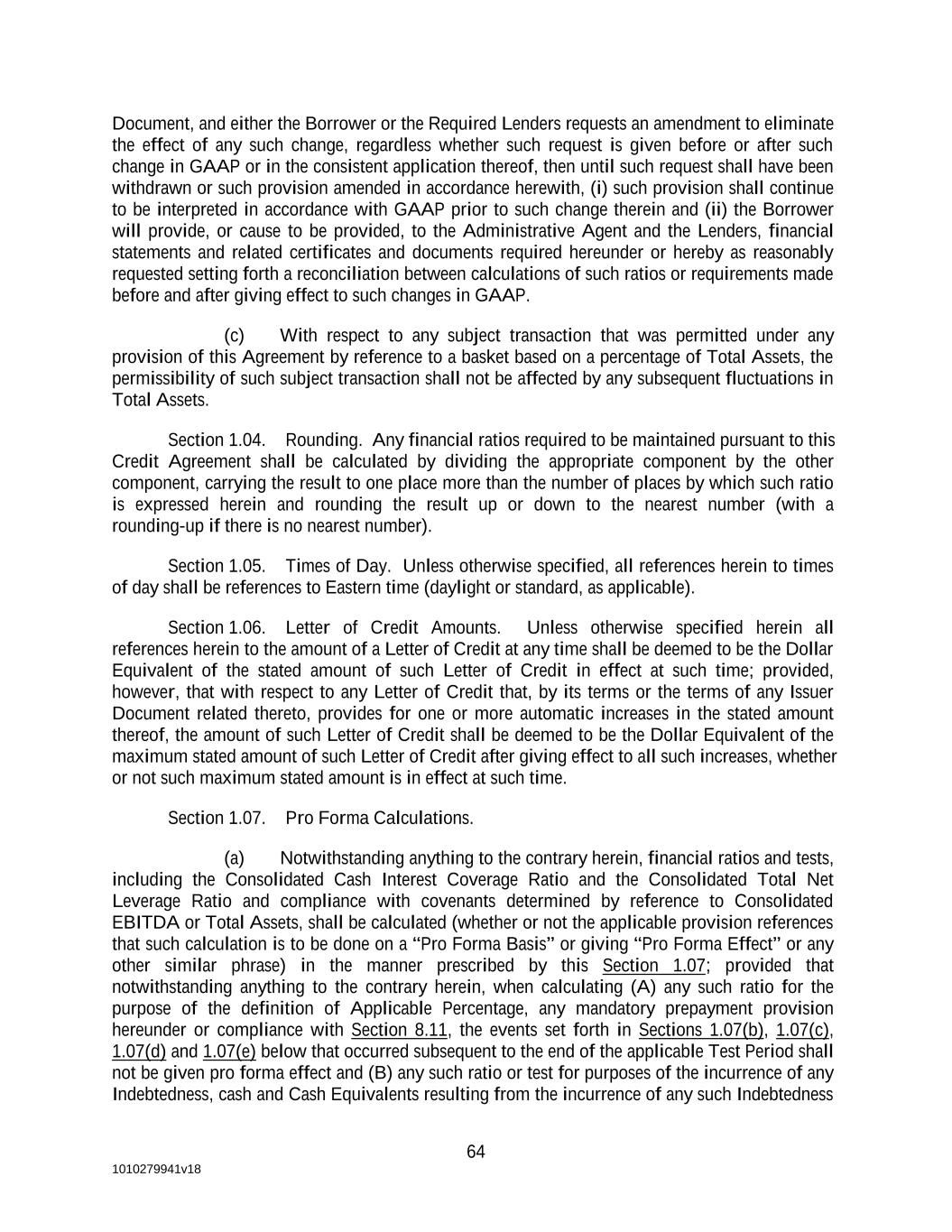 Document, and either the Borrower or the Required Lenders requests an amendment to eliminate the effect of any such change, regardless whether such request is given before or after such change in GAAP or in the consistent application thereof, then until such request shall have been withdrawn or such provision amended in accordance herewith, (i) such provision shall continue to be interpreted in accordance with GAAP prior to such change therein and (ii) the Borrower will provide, or cause to be provided, to the Administrative Agent and the Lenders, financial statements and related certificates and documents required hereunder or hereby as reasonably requested setting forth a reconciliation between calculations of such ratios or requirements made before and after giving effect to such changes in GAAP. (c) With respect to any subject transaction that was permitted under any provision of this Agreement by reference to a basket based on a percentage of Total Assets, the permissibility of such subject transaction shall not be affected by any subsequent fluctuations in Total Assets. Section 1.04. Rounding. Any financial ratios required to be maintained pursuant to this Credit Agreement shall be calculated by dividing the appropriate component by the other component, carrying the result to one place more than the number of places by which such ratio is expressed herein and rounding the result up or down to the nearest number (with a rounding-up if there is no nearest number). Section 1.05. Times of Day. Unless otherwise specified, all references herein to times of day shall be references to Eastern time (daylight or standard, as applicable). Section 1.06. Letter of Credit Amounts. Unless otherwise specified herein all references herein to the amount of a Letter of Credit at any time shall be deemed to be the Dollar Equivalent of the stated amount of such Letter of Credit in effect at such time; provided, however, that with respect to any Letter of Credit that, by its terms or the terms of any Issuer Document related thereto, provides for one or more automatic increases in the stated amount thereof, the amount of such Letter of Credit shall be deemed to be the Dollar Equivalent of the maximum stated amount of such Letter of Credit after giving effect to all such increases, whether or not such maximum stated amount is in effect at such time. Section 1.07. Pro Forma Calculations. (a) Notwithstanding anything to the contrary herein, financial ratios and tests, including the Consolidated Cash Interest Coverage Ratio and the Consolidated Total Net Leverage Ratio and compliance with covenants determined by reference to Consolidated EBITDA or Total Assets, shall be calculated (whether or not the applicable provision references that such calculation is to be done on a “Pro Forma Basis” or giving “Pro Forma Effect” or any other similar phrase) in the manner prescribed by this Section 1.07; provided that notwithstanding anything to the contrary herein, when calculating (A) any such ratio for the purpose of the definition of Applicable Percentage, any mandatory prepayment provision hereunder or compliance with Section 8.11, the events set forth in Sections 1.07(b), 1.07(c), 1.07(d) and 1.07(e) below that occurred subsequent to the end of the applicable Test Period shall not be given pro forma effect and (B) any such ratio or test for purposes of the incurrence of any Indebtedness, cash and Cash Equivalents resulting from the incurrence of any such Indebtedness 64 1010279941v18
