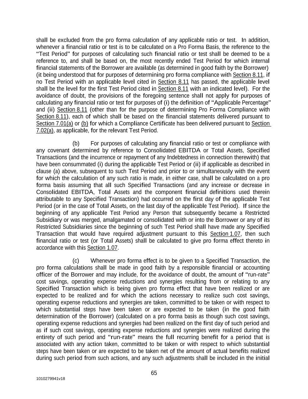 shall be excluded from the pro forma calculation of any applicable ratio or test. In addition, whenever a financial ratio or test is to be calculated on a Pro Forma Basis, the reference to the “Test Period” for purposes of calculating such financial ratio or test shall be deemed to be a reference to, and shall be based on, the most recently ended Test Period for which internal financial statements of the Borrower are available (as determined in good faith by the Borrower) (it being understood that for purposes of determining pro forma compliance with Section 8.11, if no Test Period with an applicable level cited in Section 8.11 has passed, the applicable level shall be the level for the first Test Period cited in Section 8.11 with an indicated level). For the avoidance of doubt, the provisions of the foregoing sentence shall not apply for purposes of calculating any financial ratio or test for purposes of (i) the definition of “Applicable Percentage” and (ii) Section 8.11 (other than for the purpose of determining Pro Forma Compliance with Section 8.11), each of which shall be based on the financial statements delivered pursuant to Section 7.01(a) or (b) for which a Compliance Certificate has been delivered pursuant to Section 7.02(a), as applicable, for the relevant Test Period. (b) For purposes of calculating any financial ratio or test or compliance with any covenant determined by reference to Consolidated EBITDA or Total Assets, Specified Transactions (and the incurrence or repayment of any Indebtedness in connection therewith) that have been consummated (i) during the applicable Test Period or (ii) if applicable as described in clause (a) above, subsequent to such Test Period and prior to or simultaneously with the event for which the calculation of any such ratio is made, in either case, shall be calculated on a pro forma basis assuming that all such Specified Transactions (and any increase or decrease in Consolidated EBITDA, Total Assets and the component financial definitions used therein attributable to any Specified Transaction) had occurred on the first day of the applicable Test Period (or in the case of Total Assets, on the last day of the applicable Test Period). If since the beginning of any applicable Test Period any Person that subsequently became a Restricted Subsidiary or was merged, amalgamated or consolidated with or into the Borrower or any of its Restricted Subsidiaries since the beginning of such Test Period shall have made any Specified Transaction that would have required adjustment pursuant to this Section 1.07, then such financial ratio or test (or Total Assets) shall be calculated to give pro forma effect thereto in accordance with this Section 1.07. (c) Whenever pro forma effect is to be given to a Specified Transaction, the pro forma calculations shall be made in good faith by a responsible financial or accounting officer of the Borrower and may include, for the avoidance of doubt, the amount of “run-rate” cost savings, operating expense reductions and synergies resulting from or relating to any Specified Transaction which is being given pro forma effect that have been realized or are expected to be realized and for which the actions necessary to realize such cost savings, operating expense reductions and synergies are taken, committed to be taken or with respect to which substantial steps have been taken or are expected to be taken (in the good faith determination of the Borrower) (calculated on a pro forma basis as though such cost savings, operating expense reductions and synergies had been realized on the first day of such period and as if such cost savings, operating expense reductions and synergies were realized during the entirety of such period and “run-rate” means the full recurring benefit for a period that is associated with any action taken, committed to be taken or with respect to which substantial steps have been taken or are expected to be taken net of the amount of actual benefits realized during such period from such actions, and any such adjustments shall be included in the initial 65 1010279941v18