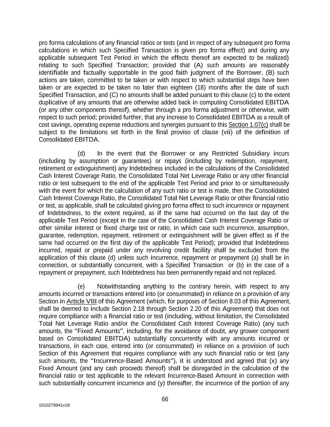pro forma calculations of any financial ratios or tests (and in respect of any subsequent pro forma calculations in which such Specified Transaction is given pro forma effect) and during any applicable subsequent Test Period in which the effects thereof are expected to be realized) relating to such Specified Transaction; provided that (A) such amounts are reasonably identifiable and factually supportable in the good faith judgment of the Borrower, (B) such actions are taken, committed to be taken or with respect to which substantial steps have been taken or are expected to be taken no later than eighteen (18) months after the date of such Specified Transaction, and (C) no amounts shall be added pursuant to this clause (c) to the extent duplicative of any amounts that are otherwise added back in computing Consolidated EBITDA (or any other components thereof), whether through a pro forma adjustment or otherwise, with respect to such period; provided further, that any increase to Consolidated EBITDA as a result of cost savings, operating expense reductions and synergies pursuant to this Section 1.07(c) shall be subject to the limitations set forth in the final proviso of clause (vii) of the definition of Consolidated EBITDA. (d) In the event that the Borrower or any Restricted Subsidiary incurs (including by assumption or guarantees) or repays (including by redemption, repayment, retirement or extinguishment) any Indebtedness included in the calculations of the Consolidated Cash Interest Coverage Ratio, the Consolidated Total Net Leverage Ratio or any other financial ratio or test subsequent to the end of the applicable Test Period and prior to or simultaneously with the event for which the calculation of any such ratio or test is made, then the Consolidated Cash Interest Coverage Ratio, the Consolidated Total Net Leverage Ratio or other financial ratio or test, as applicable, shall be calculated giving pro forma effect to such incurrence or repayment of Indebtedness, to the extent required, as if the same had occurred on the last day of the applicable Test Period (except in the case of the Consolidated Cash Interest Coverage Ratio or other similar interest or fixed charge test or ratio, in which case such incurrence, assumption, guarantee, redemption, repayment, retirement or extinguishment will be given effect as if the same had occurred on the first day of the applicable Test Period); provided that Indebtedness incurred, repaid or prepaid under any revolving credit facility shall be excluded from the application of this clause (d) unless such incurrence, repayment or prepayment (a) shall be in connection, or substantially concurrent, with a Specified Transaction or (b) in the case of a repayment or prepayment, such Indebtedness has been permanently repaid and not replaced. (e) Notwithstanding anything to the contrary herein, with respect to any amounts incurred or transactions entered into (or consummated) in reliance on a provision of any Section in Article VIII of this Agreement (which, for purposes of Section 8.03 of this Agreement, shall be deemed to include Section 2.18 through Section 2.20 of this Agreement) that does not require compliance with a financial ratio or test (including, without limitation, the Consolidated Total Net Leverage Ratio and/or the Consolidated Cash Interest Coverage Ratio) (any such amounts, the “Fixed Amounts”, including, for the avoidance of doubt, any grower component based on Consolidated EBITDA) substantially concurrently with any amounts incurred or transactions, in each case, entered into (or consummated) in reliance on a provision of such Section of this Agreement that requires compliance with any such financial ratio or test (any such amounts, the “Incurrence-Based Amounts”), it is understood and agreed that (x) any Fixed Amount (and any cash proceeds thereof) shall be disregarded in the calculation of the financial ratio or test applicable to the relevant Incurrence-Based Amount in connection with such substantially concurrent incurrence and (y) thereafter, the incurrence of the portion of any 66 1010279941v18