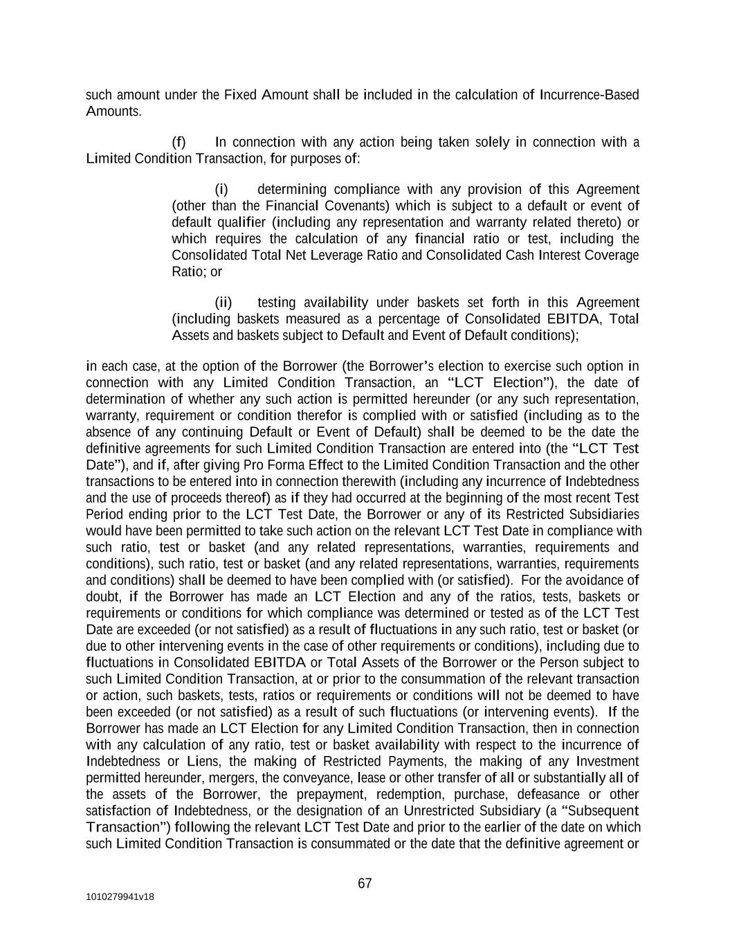 such amount under the Fixed Amount shall be included in the calculation of Incurrence-Based Amounts. (f) In connection with any action being taken solely in connection with a Limited Condition Transaction, for purposes of: (i) determining compliance with any provision of this Agreement (other than the Financial Covenants) which is subject to a default or event of default qualifier (including any representation and warranty related thereto) or which requires the calculation of any financial ratio or test, including the Consolidated Total Net Leverage Ratio and Consolidated Cash Interest Coverage Ratio; or (ii) testing availability under baskets set forth in this Agreement (including baskets measured as a percentage of Consolidated EBITDA, Total Assets and baskets subject to Default and Event of Default conditions); in each case, at the option of the Borrower (the Borrower’s election to exercise such option in connection with any Limited Condition Transaction, an “LCT Election”), the date of determination of whether any such action is permitted hereunder (or any such representation, warranty, requirement or condition therefor is complied with or satisfied (including as to the absence of any continuing Default or Event of Default) shall be deemed to be the date the definitive agreements for such Limited Condition Transaction are entered into (the “LCT Test Date”), and if, after giving Pro Forma Effect to the Limited Condition Transaction and the other transactions to be entered into in connection therewith (including any incurrence of Indebtedness and the use of proceeds thereof) as if they had occurred at the beginning of the most recent Test Period ending prior to the LCT Test Date, the Borrower or any of its Restricted Subsidiaries would have been permitted to take such action on the relevant LCT Test Date in compliance with such ratio, test or basket (and any related representations, warranties, requirements and conditions), such ratio, test or basket (and any related representations, warranties, requirements and conditions) shall be deemed to have been complied with (or satisfied). For the avoidance of doubt, if the Borrower has made an LCT Election and any of the ratios, tests, baskets or requirements or conditions for which compliance was determined or tested as of the LCT Test Date are exceeded (or not satisfied) as a result of fluctuations in any such ratio, test or basket (or due to other intervening events in the case of other requirements or conditions), including due to fluctuations in Consolidated EBITDA or Total Assets of the Borrower or the Person subject to such Limited Condition Transaction, at or prior to the consummation of the relevant transaction or action, such baskets, tests, ratios or requirements or conditions will not be deemed to have been exceeded (or not satisfied) as a result of such fluctuations (or intervening events). If the Borrower has made an LCT Election for any Limited Condition Transaction, then in connection with any calculation of any ratio, test or basket availability with respect to the incurrence of Indebtedness or Liens, the making of Restricted Payments, the making of any Investment permitted hereunder, mergers, the conveyance, lease or other transfer of all or substantially all of the assets of the Borrower, the prepayment, redemption, purchase, defeasance or other satisfaction of Indebtedness, or the designation of an Unrestricted Subsidiary (a “Subsequent Transaction”) following the relevant LCT Test Date and prior to the earlier of the date on which such Limited Condition Transaction is consummated or the date that the definitive agreement or 67 1010279941v18