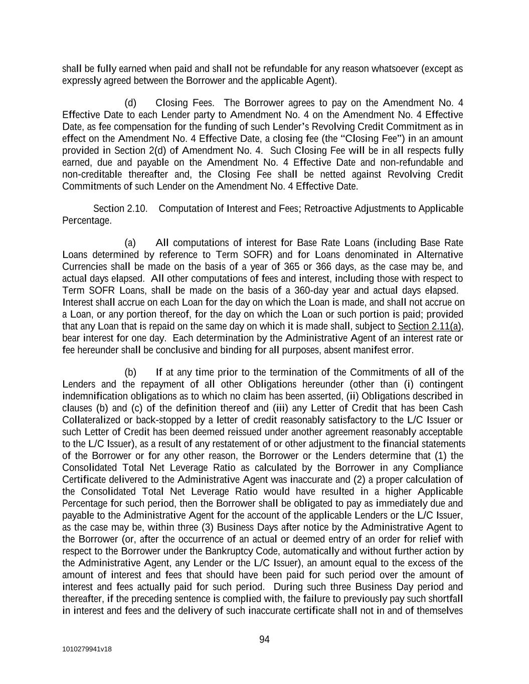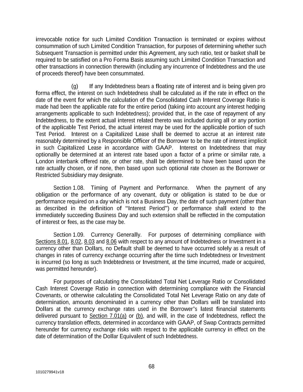 irrevocable notice for such Limited Condition Transaction is terminated or expires without consummation of such Limited Condition Transaction, for purposes of determining whether such Subsequent Transaction is permitted under this Agreement, any such ratio, test or basket shall be required to be satisfied on a Pro Forma Basis assuming such Limited Condition Transaction and other transactions in connection therewith (including any incurrence of Indebtedness and the use of proceeds thereof) have been consummated. (g) If any Indebtedness bears a floating rate of interest and is being given pro forma effect, the interest on such Indebtedness shall be calculated as if the rate in effect on the date of the event for which the calculation of the Consolidated Cash Interest Coverage Ratio is made had been the applicable rate for the entire period (taking into account any interest hedging arrangements applicable to such Indebtedness); provided that, in the case of repayment of any Indebtedness, to the extent actual interest related thereto was included during all or any portion of the applicable Test Period, the actual interest may be used for the applicable portion of such Test Period. Interest on a Capitalized Lease shall be deemed to accrue at an interest rate reasonably determined by a Responsible Officer of the Borrower to be the rate of interest implicit in such Capitalized Lease in accordance with GAAP. Interest on Indebtedness that may optionally be determined at an interest rate based upon a factor of a prime or similar rate, a London interbank offered rate, or other rate, shall be determined to have been based upon the rate actually chosen, or if none, then based upon such optional rate chosen as the Borrower or Restricted Subsidiary may designate. Section 1.08. Timing of Payment and Performance. When the payment of any obligation or the performance of any covenant, duty or obligation is stated to be due or performance required on a day which is not a Business Day, the date of such payment (other than as described in the definition of “Interest Period”) or performance shall extend to the immediately succeeding Business Day and such extension shall be reflected in the computation of interest or fees, as the case may be. Section 1.09. Currency Generally. For purposes of determining compliance with Sections 8.01, 8.02, 8.03 and 8.06 with respect to any amount of Indebtedness or Investment in a currency other than Dollars, no Default shall be deemed to have occurred solely as a result of changes in rates of currency exchange occurring after the time such Indebtedness or Investment is incurred (so long as such Indebtedness or Investment, at the time incurred, made or acquired, was permitted hereunder). For purposes of calculating the Consolidated Total Net Leverage Ratio or Consolidated Cash Interest Coverage Ratio in connection with determining compliance with the Financial Covenants, or otherwise calculating the Consolidated Total Net Leverage Ratio on any date of determination, amounts denominated in a currency other than Dollars will be translated into Dollars at the currency exchange rates used in the Borrower’s latest financial statements delivered pursuant to Section 7.01(a) or (b), and will, in the case of Indebtedness, reflect the currency translation effects, determined in accordance with GAAP, of Swap Contracts permitted hereunder for currency exchange risks with respect to the applicable currency in effect on the date of determination of the Dollar Equivalent of such Indebtedness. 68 1010279941v18