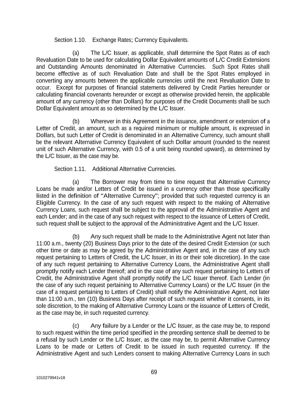 Section 1.10. Exchange Rates; Currency Equivalents. (a) The L/C Issuer, as applicable, shall determine the Spot Rates as of each Revaluation Date to be used for calculating Dollar Equivalent amounts of L/C Credit Extensions and Outstanding Amounts denominated in Alternative Currencies. Such Spot Rates shall become effective as of such Revaluation Date and shall be the Spot Rates employed in converting any amounts between the applicable currencies until the next Revaluation Date to occur. Except for purposes of financial statements delivered by Credit Parties hereunder or calculating financial covenants hereunder or except as otherwise provided herein, the applicable amount of any currency (other than Dollars) for purposes of the Credit Documents shall be such Dollar Equivalent amount as so determined by the L/C Issuer. (b) Wherever in this Agreement in the issuance, amendment or extension of a Letter of Credit, an amount, such as a required minimum or multiple amount, is expressed in Dollars, but such Letter of Credit is denominated in an Alternative Currency, such amount shall be the relevant Alternative Currency Equivalent of such Dollar amount (rounded to the nearest unit of such Alternative Currency, with 0.5 of a unit being rounded upward), as determined by the L/C Issuer, as the case may be. Section 1.11. Additional Alternative Currencies. (a) The Borrower may from time to time request that Alternative Currency Loans be made and/or Letters of Credit be issued in a currency other than those specifically listed in the definition of “Alternative Currency”; provided that such requested currency is an Eligible Currency. In the case of any such request with respect to the making of Alternative Currency Loans, such request shall be subject to the approval of the Administrative Agent and each Lender; and in the case of any such request with respect to the issuance of Letters of Credit, such request shall be subject to the approval of the Administrative Agent and the L/C Issuer. (b) Any such request shall be made to the Administrative Agent not later than 11:00 a.m., twenty (20) Business Days prior to the date of the desired Credit Extension (or such other time or date as may be agreed by the Administrative Agent and, in the case of any such request pertaining to Letters of Credit, the L/C Issuer, in its or their sole discretion). In the case of any such request pertaining to Alternative Currency Loans, the Administrative Agent shall promptly notify each Lender thereof; and in the case of any such request pertaining to Letters of Credit, the Administrative Agent shall promptly notify the L/C Issuer thereof. Each Lender (in the case of any such request pertaining to Alternative Currency Loans) or the L/C Issuer (in the case of a request pertaining to Letters of Credit) shall notify the Administrative Agent, not later than 11:00 a.m., ten (10) Business Days after receipt of such request whether it consents, in its sole discretion, to the making of Alternative Currency Loans or the issuance of Letters of Credit, as the case may be, in such requested currency. (c) Any failure by a Lender or the L/C Issuer, as the case may be, to respond to such request within the time period specified in the preceding sentence shall be deemed to be a refusal by such Lender or the L/C Issuer, as the case may be, to permit Alternative Currency Loans to be made or Letters of Credit to be issued in such requested currency. If the Administrative Agent and such Lenders consent to making Alternative Currency Loans in such 69 1010279941v18