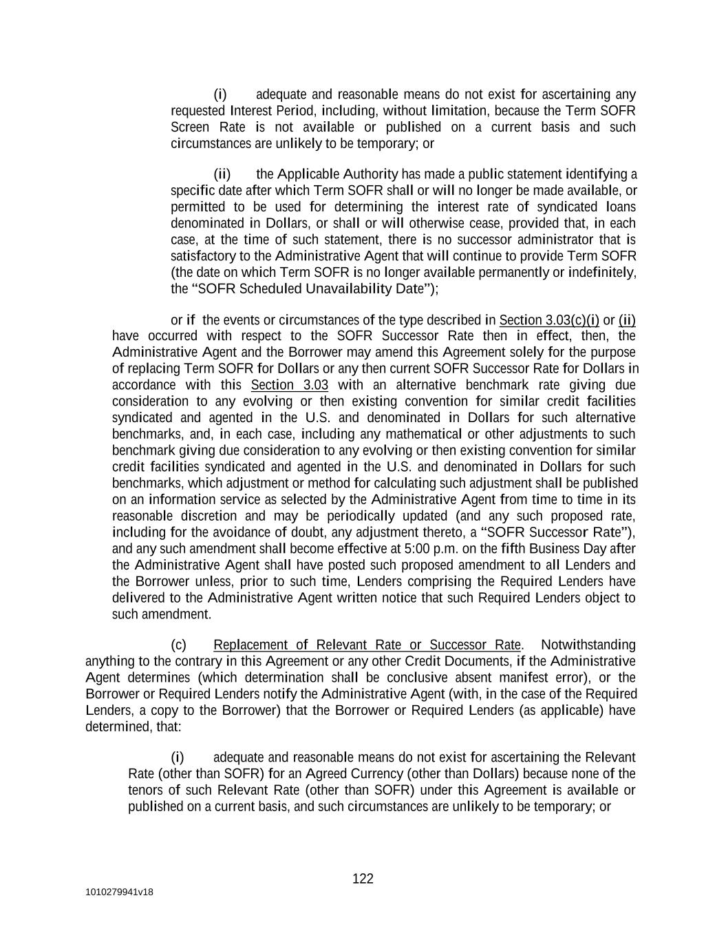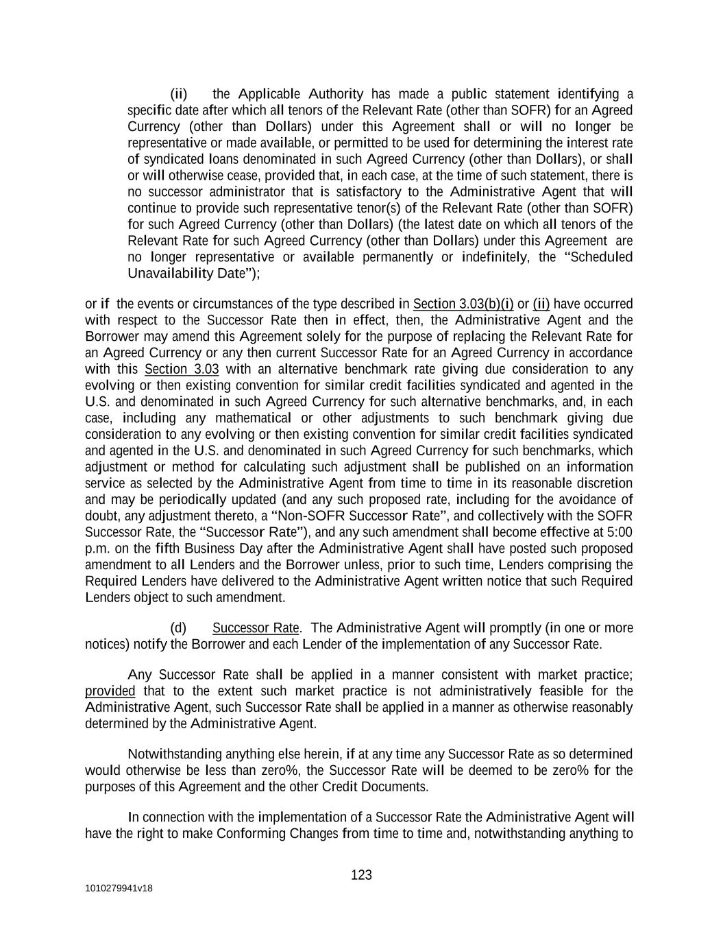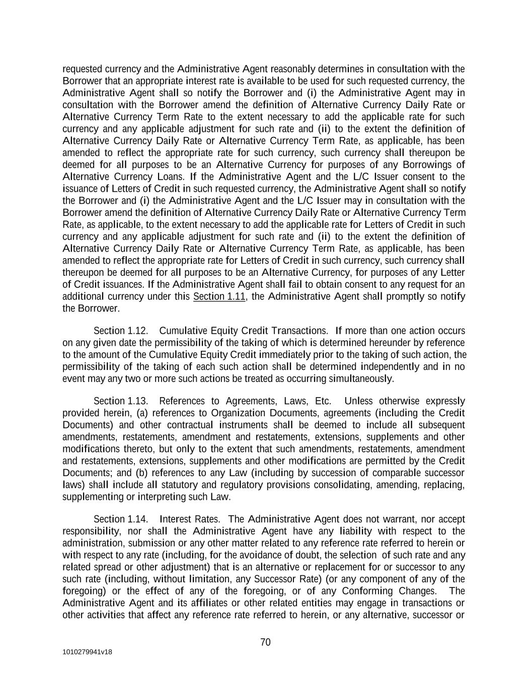 requested currency and the Administrative Agent reasonably determines in consultation with the Borrower that an appropriate interest rate is available to be used for such requested currency, the Administrative Agent shall so notify the Borrower and (i) the Administrative Agent may in consultation with the Borrower amend the definition of Alternative Currency Daily Rate or Alternative Currency Term Rate to the extent necessary to add the applicable rate for such currency and any applicable adjustment for such rate and (ii) to the extent the definition of Alternative Currency Daily Rate or Alternative Currency Term Rate, as applicable, has been amended to reflect the appropriate rate for such currency, such currency shall thereupon be deemed for all purposes to be an Alternative Currency for purposes of any Borrowings of Alternative Currency Loans. If the Administrative Agent and the L/C Issuer consent to the issuance of Letters of Credit in such requested currency, the Administrative Agent shall so notify the Borrower and (i) the Administrative Agent and the L/C Issuer may in consultation with the Borrower amend the definition of Alternative Currency Daily Rate or Alternative Currency Term Rate, as applicable, to the extent necessary to add the applicable rate for Letters of Credit in such currency and any applicable adjustment for such rate and (ii) to the extent the definition of Alternative Currency Daily Rate or Alternative Currency Term Rate, as applicable, has been amended to reflect the appropriate rate for Letters of Credit in such currency, such currency shall thereupon be deemed for all purposes to be an Alternative Currency, for purposes of any Letter of Credit issuances. If the Administrative Agent shall fail to obtain consent to any request for an additional currency under this Section 1.11, the Administrative Agent shall promptly so notify the Borrower. Section 1.12. Cumulative Equity Credit Transactions. If more than one action occurs on any given date the permissibility of the taking of which is determined hereunder by reference to the amount of the Cumulative Equity Credit immediately prior to the taking of such action, the permissibility of the taking of each such action shall be determined independently and in no event may any two or more such actions be treated as occurring simultaneously. Section 1.13. References to Agreements, Laws, Etc. Unless otherwise expressly provided herein, (a) references to Organization Documents, agreements (including the Credit Documents) and other contractual instruments shall be deemed to include all subsequent amendments, restatements, amendment and restatements, extensions, supplements and other modifications thereto, but only to the extent that such amendments, restatements, amendment and restatements, extensions, supplements and other modifications are permitted by the Credit Documents; and (b) references to any Law (including by succession of comparable successor laws) shall include all statutory and regulatory provisions consolidating, amending, replacing, supplementing or interpreting such Law. Section 1.14. Interest Rates. The Administrative Agent does not warrant, nor accept responsibility, nor shall the Administrative Agent have any liability with respect to the administration, submission or any other matter related to any reference rate referred to herein or with respect to any rate (including, for the avoidance of doubt, the selection of such rate and any related spread or other adjustment) that is an alternative or replacement for or successor to any such rate (including, without limitation, any Successor Rate) (or any component of any of the foregoing) or the effect of any of the foregoing, or of any Conforming Changes. The Administrative Agent and its affiliates or other related entities may engage in transactions or other activities that affect any reference rate referred to herein, or any alternative, successor or 70 1010279941v18