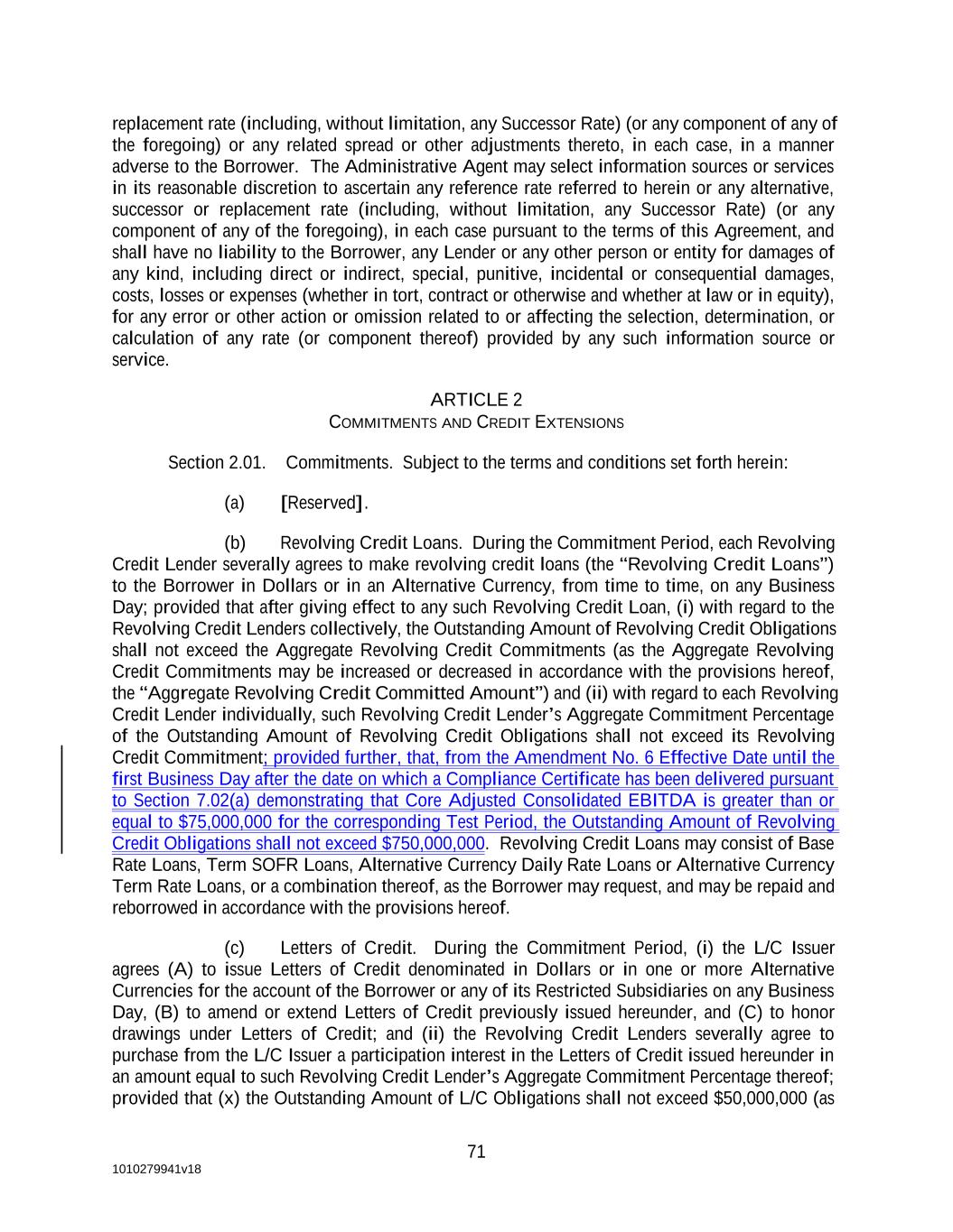 replacement rate (including, without limitation, any Successor Rate) (or any component of any of the foregoing) or any related spread or other adjustments thereto, in each case, in a manner adverse to the Borrower. The Administrative Agent may select information sources or services in its reasonable discretion to ascertain any reference rate referred to herein or any alternative, successor or replacement rate (including, without limitation, any Successor Rate) (or any component of any of the foregoing), in each case pursuant to the terms of this Agreement, and shall have no liability to the Borrower, any Lender or any other person or entity for damages of any kind, including direct or indirect, special, punitive, incidental or consequential damages, costs, losses or expenses (whether in tort, contract or otherwise and whether at law or in equity), for any error or other action or omission related to or affecting the selection, determination, or calculation of any rate (or component thereof) provided by any such information source or service. ARTICLE 2 COMMITMENTS AND CREDIT EXTENSIONS Section 2.01. Commitments. Subject to the terms and conditions set forth herein: (a) [Reserved]. (b) Revolving Credit Loans. During the Commitment Period, each Revolving Credit Lender severally agrees to make revolving credit loans (the “Revolving Credit Loans”) to the Borrower in Dollars or in an Alternative Currency, from time to time, on any Business Day; provided that after giving effect to any such Revolving Credit Loan, (i) with regard to the Revolving Credit Lenders collectively, the Outstanding Amount of Revolving Credit Obligations shall not exceed the Aggregate Revolving Credit Commitments (as the Aggregate Revolving Credit Commitments may be increased or decreased in accordance with the provisions hereof, the “Aggregate Revolving Credit Committed Amount”) and (ii) with regard to each Revolving Credit Lender individually, such Revolving Credit Lender’s Aggregate Commitment Percentage of the Outstanding Amount of Revolving Credit Obligations shall not exceed its Revolving Credit Commitment; provided further, that, from the Amendment No. 6 Effective Date until the first Business Day after the date on which a Compliance Certificate has been delivered pursuant to Section 7.02(a) demonstrating that Core Adjusted Consolidated EBITDA is greater than or equal to $75,000,000 for the corresponding Test Period, the Outstanding Amount of Revolving Credit Obligations shall not exceed $750,000,000. Revolving Credit Loans may consist of Base Rate Loans, Term SOFR Loans, Alternative Currency Daily Rate Loans or Alternative Currency Term Rate Loans, or a combination thereof, as the Borrower may request, and may be repaid and reborrowed in accordance with the provisions hereof. (c) Letters of Credit. During the Commitment Period, (i) the L/C Issuer agrees (A) to issue Letters of Credit denominated in Dollars or in one or more Alternative Currencies for the account of the Borrower or any of its Restricted Subsidiaries on any Business Day, (B) to amend or extend Letters of Credit previously issued hereunder, and (C) to honor drawings under Letters of Credit; and (ii) the Revolving Credit Lenders severally agree to purchase from the L/C Issuer a participation interest in the Letters of Credit issued hereunder in an amount equal to such Revolving Credit Lender’s Aggregate Commitment Percentage thereof; provided that (x) the Outstanding Amount of L/C Obligations shall not exceed $50,000,000 (as 71 1010279941v18