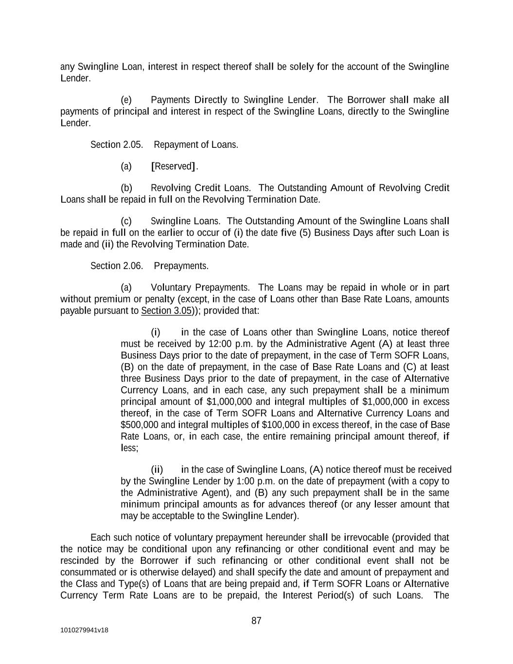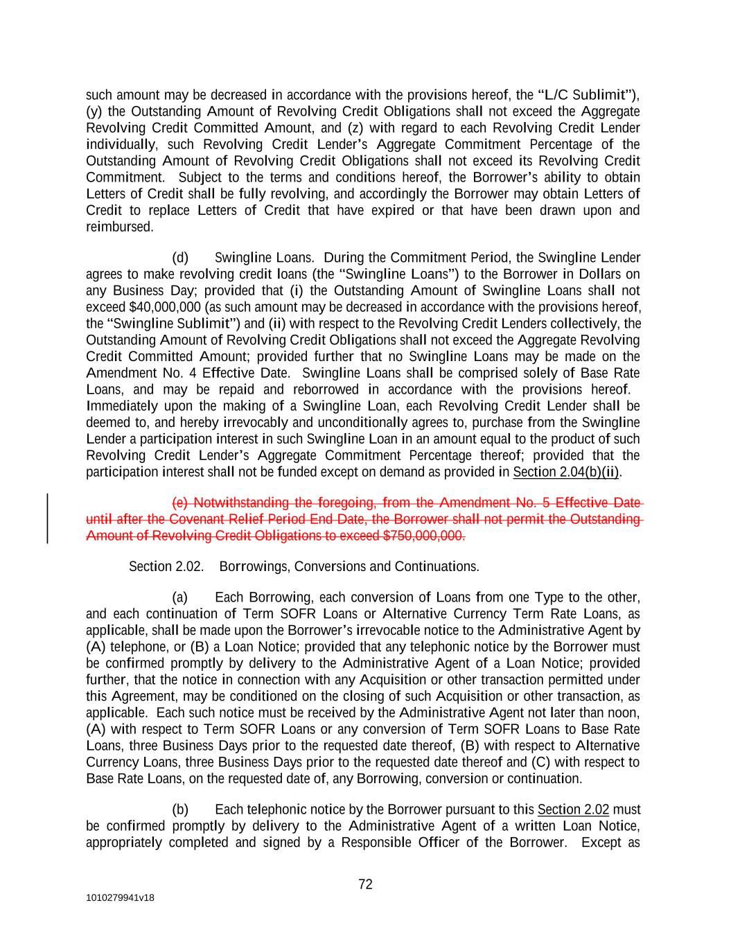 such amount may be decreased in accordance with the provisions hereof, the “L/C Sublimit”), (y) the Outstanding Amount of Revolving Credit Obligations shall not exceed the Aggregate Revolving Credit Committed Amount, and (z) with regard to each Revolving Credit Lender individually, such Revolving Credit Lender’s Aggregate Commitment Percentage of the Outstanding Amount of Revolving Credit Obligations shall not exceed its Revolving Credit Commitment. Subject to the terms and conditions hereof, the Borrower’s ability to obtain Letters of Credit shall be fully revolving, and accordingly the Borrower may obtain Letters of Credit to replace Letters of Credit that have expired or that have been drawn upon and reimbursed. (d) Swingline Loans. During the Commitment Period, the Swingline Lender agrees to make revolving credit loans (the “Swingline Loans”) to the Borrower in Dollars on any Business Day; provided that (i) the Outstanding Amount of Swingline Loans shall not exceed $40,000,000 (as such amount may be decreased in accordance with the provisions hereof, the “Swingline Sublimit”) and (ii) with respect to the Revolving Credit Lenders collectively, the Outstanding Amount of Revolving Credit Obligations shall not exceed the Aggregate Revolving Credit Committed Amount; provided further that no Swingline Loans may be made on the Amendment No. 4 Effective Date. Swingline Loans shall be comprised solely of Base Rate Loans, and may be repaid and reborrowed in accordance with the provisions hereof. Immediately upon the making of a Swingline Loan, each Revolving Credit Lender shall be deemed to, and hereby irrevocably and unconditionally agrees to, purchase from the Swingline Lender a participation interest in such Swingline Loan in an amount equal to the product of such Revolving Credit Lender’s Aggregate Commitment Percentage thereof; provided that the participation interest shall not be funded except on demand as provided in Section 2.04(b)(ii). (e) Notwithstanding the foregoing, from the Amendment No. 5 Effective Date until after the Covenant Relief Period End Date, the Borrower shall not permit the Outstanding Amount of Revolving Credit Obligations to exceed $750,000,000. Section 2.02. Borrowings, Conversions and Continuations. (a) Each Borrowing, each conversion of Loans from one Type to the other, and each continuation of Term SOFR Loans or Alternative Currency Term Rate Loans, as applicable, shall be made upon the Borrower’s irrevocable notice to the Administrative Agent by (A) telephone, or (B) a Loan Notice; provided that any telephonic notice by the Borrower must be confirmed promptly by delivery to the Administrative Agent of a Loan Notice; provided further, that the notice in connection with any Acquisition or other transaction permitted under this Agreement, may be conditioned on the closing of such Acquisition or other transaction, as applicable. Each such notice must be received by the Administrative Agent not later than noon, (A) with respect to Term SOFR Loans or any conversion of Term SOFR Loans to Base Rate Loans, three Business Days prior to the requested date thereof, (B) with respect to Alternative Currency Loans, three Business Days prior to the requested date thereof and (C) with respect to Base Rate Loans, on the requested date of, any Borrowing, conversion or continuation. (b) Each telephonic notice by the Borrower pursuant to this Section 2.02 must be confirmed promptly by delivery to the Administrative Agent of a written Loan Notice, appropriately completed and signed by a Responsible Officer of the Borrower. Except as 72 1010279941v18