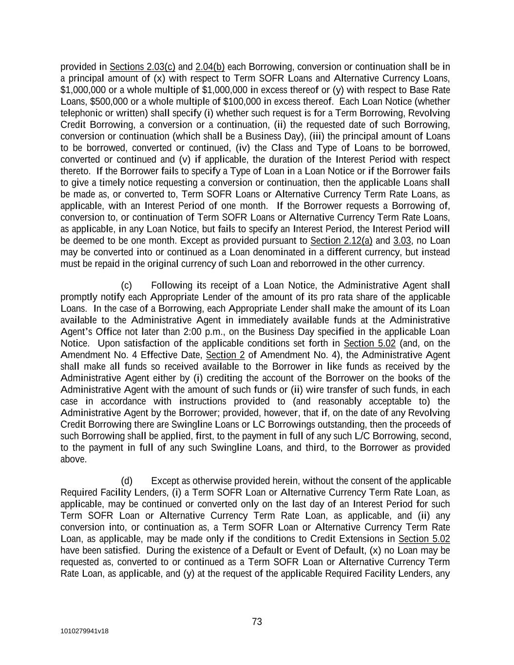 provided in Sections 2.03(c) and 2.04(b) each Borrowing, conversion or continuation shall be in a principal amount of (x) with respect to Term SOFR Loans and Alternative Currency Loans, $1,000,000 or a whole multiple of $1,000,000 in excess thereof or (y) with respect to Base Rate Loans, $500,000 or a whole multiple of $100,000 in excess thereof. Each Loan Notice (whether telephonic or written) shall specify (i) whether such request is for a Term Borrowing, Revolving Credit Borrowing, a conversion or a continuation, (ii) the requested date of such Borrowing, conversion or continuation (which shall be a Business Day), (iii) the principal amount of Loans to be borrowed, converted or continued, (iv) the Class and Type of Loans to be borrowed, converted or continued and (v) if applicable, the duration of the Interest Period with respect thereto. If the Borrower fails to specify a Type of Loan in a Loan Notice or if the Borrower fails to give a timely notice requesting a conversion or continuation, then the applicable Loans shall be made as, or converted to, Term SOFR Loans or Alternative Currency Term Rate Loans, as applicable, with an Interest Period of one month. If the Borrower requests a Borrowing of, conversion to, or continuation of Term SOFR Loans or Alternative Currency Term Rate Loans, as applicable, in any Loan Notice, but fails to specify an Interest Period, the Interest Period will be deemed to be one month. Except as provided pursuant to Section 2.12(a) and 3.03, no Loan may be converted into or continued as a Loan denominated in a different currency, but instead must be repaid in the original currency of such Loan and reborrowed in the other currency. (c) Following its receipt of a Loan Notice, the Administrative Agent shall promptly notify each Appropriate Lender of the amount of its pro rata share of the applicable Loans. In the case of a Borrowing, each Appropriate Lender shall make the amount of its Loan available to the Administrative Agent in immediately available funds at the Administrative Agent’s Office not later than 2:00 p.m., on the Business Day specified in the applicable Loan Notice. Upon satisfaction of the applicable conditions set forth in Section 5.02 (and, on the Amendment No. 4 Effective Date, Section 2 of Amendment No. 4), the Administrative Agent shall make all funds so received available to the Borrower in like funds as received by the Administrative Agent either by (i) crediting the account of the Borrower on the books of the Administrative Agent with the amount of such funds or (ii) wire transfer of such funds, in each case in accordance with instructions provided to (and reasonably acceptable to) the Administrative Agent by the Borrower; provided, however, that if, on the date of any Revolving Credit Borrowing there are Swingline Loans or LC Borrowings outstanding, then the proceeds of such Borrowing shall be applied, first, to the payment in full of any such L/C Borrowing, second, to the payment in full of any such Swingline Loans, and third, to the Borrower as provided above. (d) Except as otherwise provided herein, without the consent of the applicable Required Facility Lenders, (i) a Term SOFR Loan or Alternative Currency Term Rate Loan, as applicable, may be continued or converted only on the last day of an Interest Period for such Term SOFR Loan or Alternative Currency Term Rate Loan, as applicable, and (ii) any conversion into, or continuation as, a Term SOFR Loan or Alternative Currency Term Rate Loan, as applicable, may be made only if the conditions to Credit Extensions in Section 5.02 have been satisfied. During the existence of a Default or Event of Default, (x) no Loan may be requested as, converted to or continued as a Term SOFR Loan or Alternative Currency Term Rate Loan, as applicable, and (y) at the request of the applicable Required Facility Lenders, any 73 1010279941v18