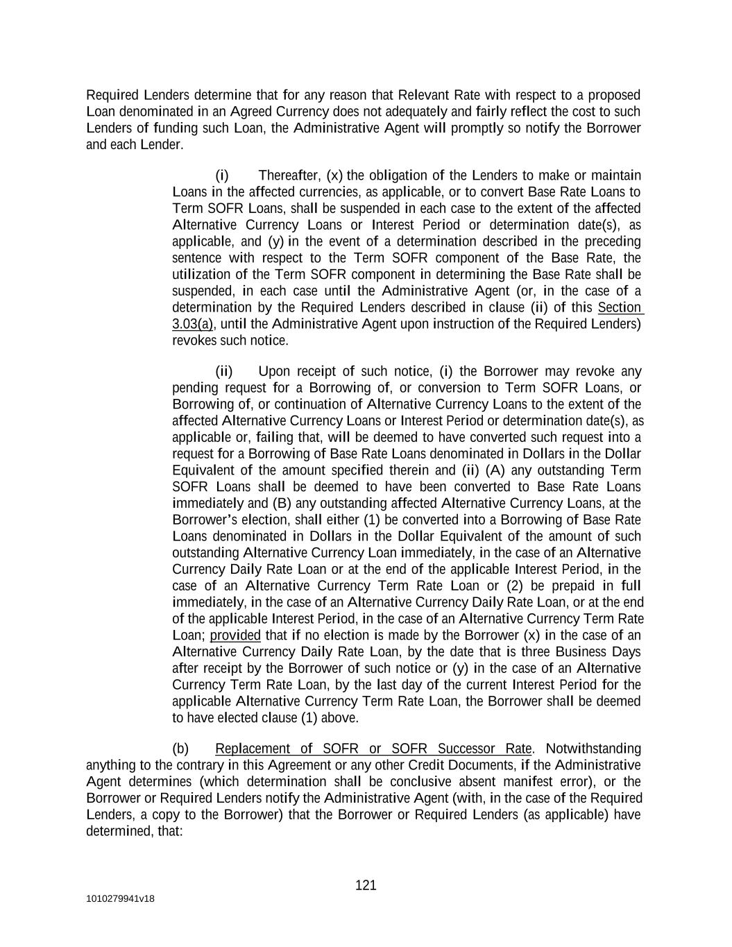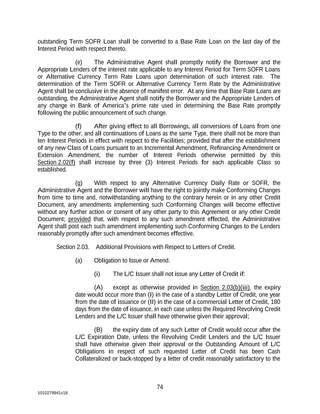 outstanding Term SOFR Loan shall be converted to a Base Rate Loan on the last day of the Interest Period with respect thereto. (e) The Administrative Agent shall promptly notify the Borrower and the Appropriate Lenders of the interest rate applicable to any Interest Period for Term SOFR Loans or Alternative Currency Term Rate Loans upon determination of such interest rate. The determination of the Term SOFR or Alternative Currency Term Rate by the Administrative Agent shall be conclusive in the absence of manifest error. At any time that Base Rate Loans are outstanding, the Administrative Agent shall notify the Borrower and the Appropriate Lenders of any change in Bank of America’s prime rate used in determining the Base Rate promptly following the public announcement of such change. (f) After giving effect to all Borrowings, all conversions of Loans from one Type to the other, and all continuations of Loans as the same Type, there shall not be more than ten Interest Periods in effect with respect to the Facilities; provided that after the establishment of any new Class of Loans pursuant to an Incremental Amendment, Refinancing Amendment or Extension Amendment, the number of Interest Periods otherwise permitted by this Section 2.02(f) shall increase by three (3) Interest Periods for each applicable Class so established. (g) With respect to any Alternative Currency Daily Rate or SOFR, the Administrative Agent and the Borrower will have the right to jointly make Conforming Changes from time to time and, notwithstanding anything to the contrary herein or in any other Credit Document, any amendments implementing such Conforming Changes will become effective without any further action or consent of any other party to this Agreement or any other Credit Document; provided that, with respect to any such amendment effected, the Administrative Agent shall post each such amendment implementing such Conforming Changes to the Lenders reasonably promptly after such amendment becomes effective. Section 2.03. Additional Provisions with Respect to Letters of Credit. (a) Obligation to Issue or Amend. (i) The L/C Issuer shall not issue any Letter of Credit if: (A) except as otherwise provided in Section 2.03(b)(iii), the expiry date would occur more than (I) in the case of a standby Letter of Credit, one year from the date of issuance or (II) in the case of a commercial Letter of Credit, 180 days from the date of issuance, in each case unless the Required Revolving Credit Lenders and the L/C Issuer shall have otherwise given their approval; (B) the expiry date of any such Letter of Credit would occur after the L/C Expiration Date, unless the Revolving Credit Lenders and the L/C Issuer shall have otherwise given their approval or the Outstanding Amount of L/C Obligations in respect of such requested Letter of Credit has been Cash Collateralized or back-stopped by a letter of credit reasonably satisfactory to the 74 1010279941v18