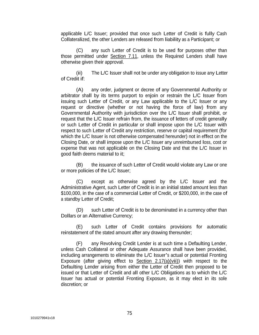 applicable L/C Issuer; provided that once such Letter of Credit is fully Cash Collateralized, the other Lenders are released from liability as a Participant; or (C) any such Letter of Credit is to be used for purposes other than those permitted under Section 7.11, unless the Required Lenders shall have otherwise given their approval. (ii) The L/C Issuer shall not be under any obligation to issue any Letter of Credit if: (A) any order, judgment or decree of any Governmental Authority or arbitrator shall by its terms purport to enjoin or restrain the L/C Issuer from issuing such Letter of Credit, or any Law applicable to the L/C Issuer or any request or directive (whether or not having the force of law) from any Governmental Authority with jurisdiction over the L/C Issuer shall prohibit, or request that the L/C Issuer refrain from, the issuance of letters of credit generally or such Letter of Credit in particular or shall impose upon the L/C Issuer with respect to such Letter of Credit any restriction, reserve or capital requirement (for which the L/C Issuer is not otherwise compensated hereunder) not in effect on the Closing Date, or shall impose upon the L/C Issuer any unreimbursed loss, cost or expense that was not applicable on the Closing Date and that the L/C Issuer in good faith deems material to it; (B) the issuance of such Letter of Credit would violate any Law or one or more policies of the L/C Issuer; (C) except as otherwise agreed by the L/C Issuer and the Administrative Agent, such Letter of Credit is in an initial stated amount less than $100,000, in the case of a commercial Letter of Credit, or $200,000, in the case of a standby Letter of Credit; (D) such Letter of Credit is to be denominated in a currency other than Dollars or an Alternative Currency; (E) such Letter of Credit contains provisions for automatic reinstatement of the stated amount after any drawing thereunder; (F) any Revolving Credit Lender is at such time a Defaulting Lender, unless Cash Collateral or other Adequate Assurance shall have been provided, including arrangements to eliminate the L/C Issuer’s actual or potential Fronting Exposure (after giving effect to Section 2.17(a)(vii)) with respect to the Defaulting Lender arising from either the Letter of Credit then proposed to be issued or that Letter of Credit and all other L/C Obligations as to which the L/C Issuer has actual or potential Fronting Exposure, as it may elect in its sole discretion; or 75 1010279941v18
