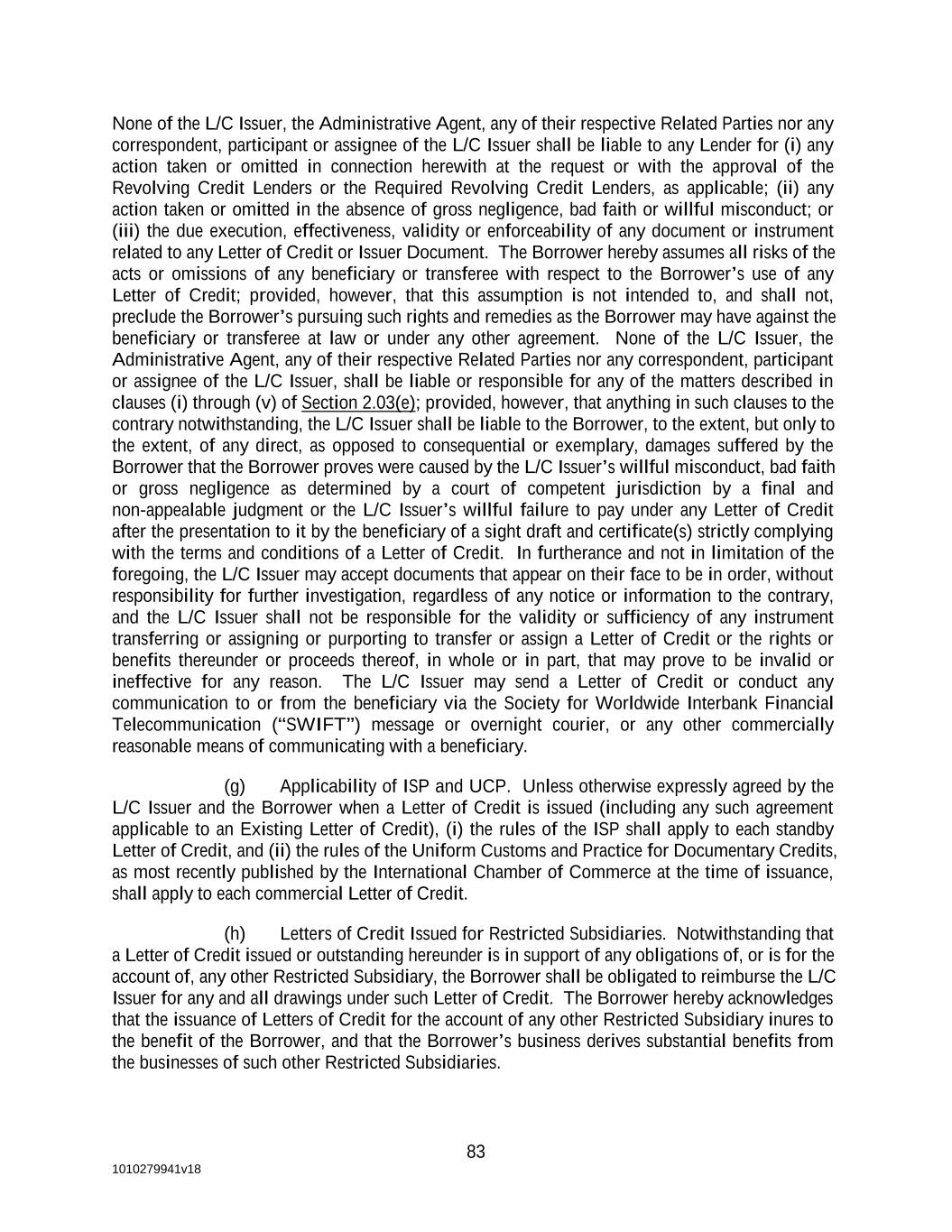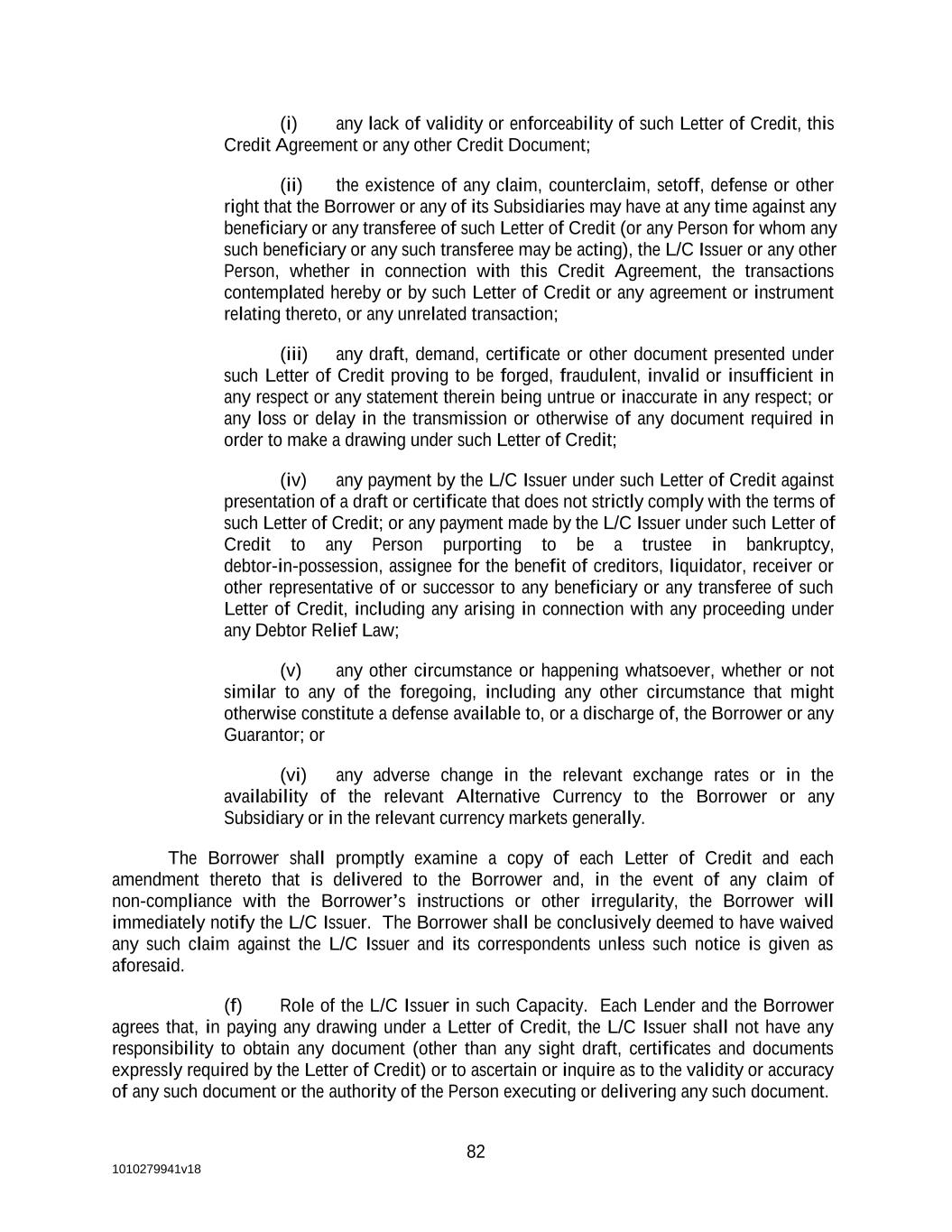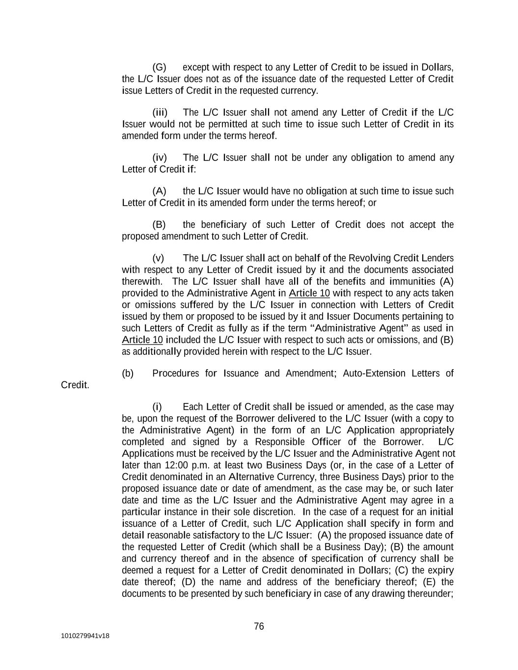 (G) except with respect to any Letter of Credit to be issued in Dollars, the L/C Issuer does not as of the issuance date of the requested Letter of Credit issue Letters of Credit in the requested currency. (iii) The L/C Issuer shall not amend any Letter of Credit if the L/C Issuer would not be permitted at such time to issue such Letter of Credit in its amended form under the terms hereof. (iv) The L/C Issuer shall not be under any obligation to amend any Letter of Credit if: (A) the L/C Issuer would have no obligation at such time to issue such Letter of Credit in its amended form under the terms hereof; or (B) the beneficiary of such Letter of Credit does not accept the proposed amendment to such Letter of Credit. (v) The L/C Issuer shall act on behalf of the Revolving Credit Lenders with respect to any Letter of Credit issued by it and the documents associated therewith. The L/C Issuer shall have all of the benefits and immunities (A) provided to the Administrative Agent in Article 10 with respect to any acts taken or omissions suffered by the L/C Issuer in connection with Letters of Credit issued by them or proposed to be issued by it and Issuer Documents pertaining to such Letters of Credit as fully as if the term “Administrative Agent” as used in Article 10 included the L/C Issuer with respect to such acts or omissions, and (B) as additionally provided herein with respect to the L/C Issuer. (b) Procedures for Issuance and Amendment; Auto-Extension Letters of Credit. (i) Each Letter of Credit shall be issued or amended, as the case may be, upon the request of the Borrower delivered to the L/C Issuer (with a copy to the Administrative Agent) in the form of an L/C Application appropriately completed and signed by a Responsible Officer of the Borrower. L/C Applications must be received by the L/C Issuer and the Administrative Agent not later than 12:00 p.m. at least two Business Days (or, in the case of a Letter of Credit denominated in an Alternative Currency, three Business Days) prior to the proposed issuance date or date of amendment, as the case may be, or such later date and time as the L/C Issuer and the Administrative Agent may agree in a particular instance in their sole discretion. In the case of a request for an initial issuance of a Letter of Credit, such L/C Application shall specify in form and detail reasonable satisfactory to the L/C Issuer: (A) the proposed issuance date of the requested Letter of Credit (which shall be a Business Day); (B) the amount and currency thereof and in the absence of specification of currency shall be deemed a request for a Letter of Credit denominated in Dollars; (C) the expiry date thereof; (D) the name and address of the beneficiary thereof; (E) the documents to be presented by such beneficiary in case of any drawing thereunder; 76 1010279941v18