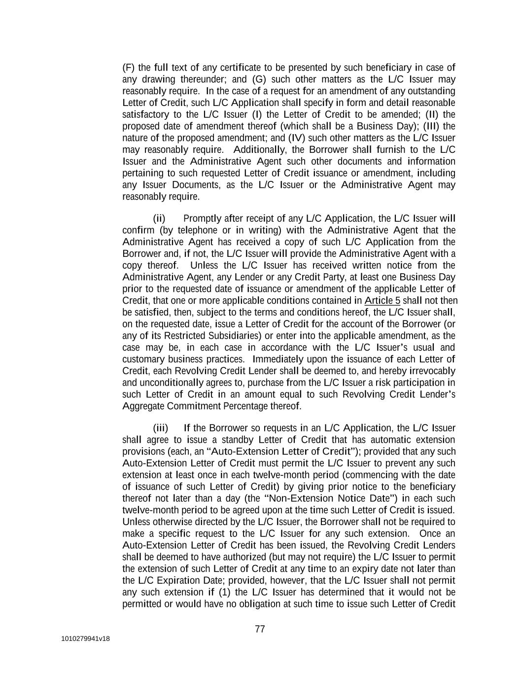 (F) the full text of any certificate to be presented by such beneficiary in case of any drawing thereunder; and (G) such other matters as the L/C Issuer may reasonably require. In the case of a request for an amendment of any outstanding Letter of Credit, such L/C Application shall specify in form and detail reasonable satisfactory to the L/C Issuer (I) the Letter of Credit to be amended; (II) the proposed date of amendment thereof (which shall be a Business Day); (III) the nature of the proposed amendment; and (IV) such other matters as the L/C Issuer may reasonably require. Additionally, the Borrower shall furnish to the L/C Issuer and the Administrative Agent such other documents and information pertaining to such requested Letter of Credit issuance or amendment, including any Issuer Documents, as the L/C Issuer or the Administrative Agent may reasonably require. (ii) Promptly after receipt of any L/C Application, the L/C Issuer will confirm (by telephone or in writing) with the Administrative Agent that the Administrative Agent has received a copy of such L/C Application from the Borrower and, if not, the L/C Issuer will provide the Administrative Agent with a copy thereof. Unless the L/C Issuer has received written notice from the Administrative Agent, any Lender or any Credit Party, at least one Business Day prior to the requested date of issuance or amendment of the applicable Letter of Credit, that one or more applicable conditions contained in Article 5 shall not then be satisfied, then, subject to the terms and conditions hereof, the L/C Issuer shall, on the requested date, issue a Letter of Credit for the account of the Borrower (or any of its Restricted Subsidiaries) or enter into the applicable amendment, as the case may be, in each case in accordance with the L/C Issuer’s usual and customary business practices. Immediately upon the issuance of each Letter of Credit, each Revolving Credit Lender shall be deemed to, and hereby irrevocably and unconditionally agrees to, purchase from the L/C Issuer a risk participation in such Letter of Credit in an amount equal to such Revolving Credit Lender’s Aggregate Commitment Percentage thereof. (iii) If the Borrower so requests in an L/C Application, the L/C Issuer shall agree to issue a standby Letter of Credit that has automatic extension provisions (each, an “Auto-Extension Letter of Credit”); provided that any such Auto-Extension Letter of Credit must permit the L/C Issuer to prevent any such extension at least once in each twelve-month period (commencing with the date of issuance of such Letter of Credit) by giving prior notice to the beneficiary thereof not later than a day (the “Non-Extension Notice Date”) in each such twelve-month period to be agreed upon at the time such Letter of Credit is issued. Unless otherwise directed by the L/C Issuer, the Borrower shall not be required to make a specific request to the L/C Issuer for any such extension. Once an Auto-Extension Letter of Credit has been issued, the Revolving Credit Lenders shall be deemed to have authorized (but may not require) the L/C Issuer to permit the extension of such Letter of Credit at any time to an expiry date not later than the L/C Expiration Date; provided, however, that the L/C Issuer shall not permit any such extension if (1) the L/C Issuer has determined that it would not be permitted or would have no obligation at such time to issue such Letter of Credit 77 1010279941v18