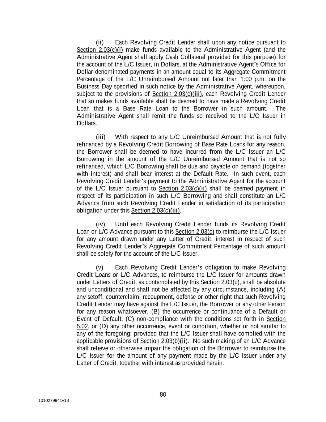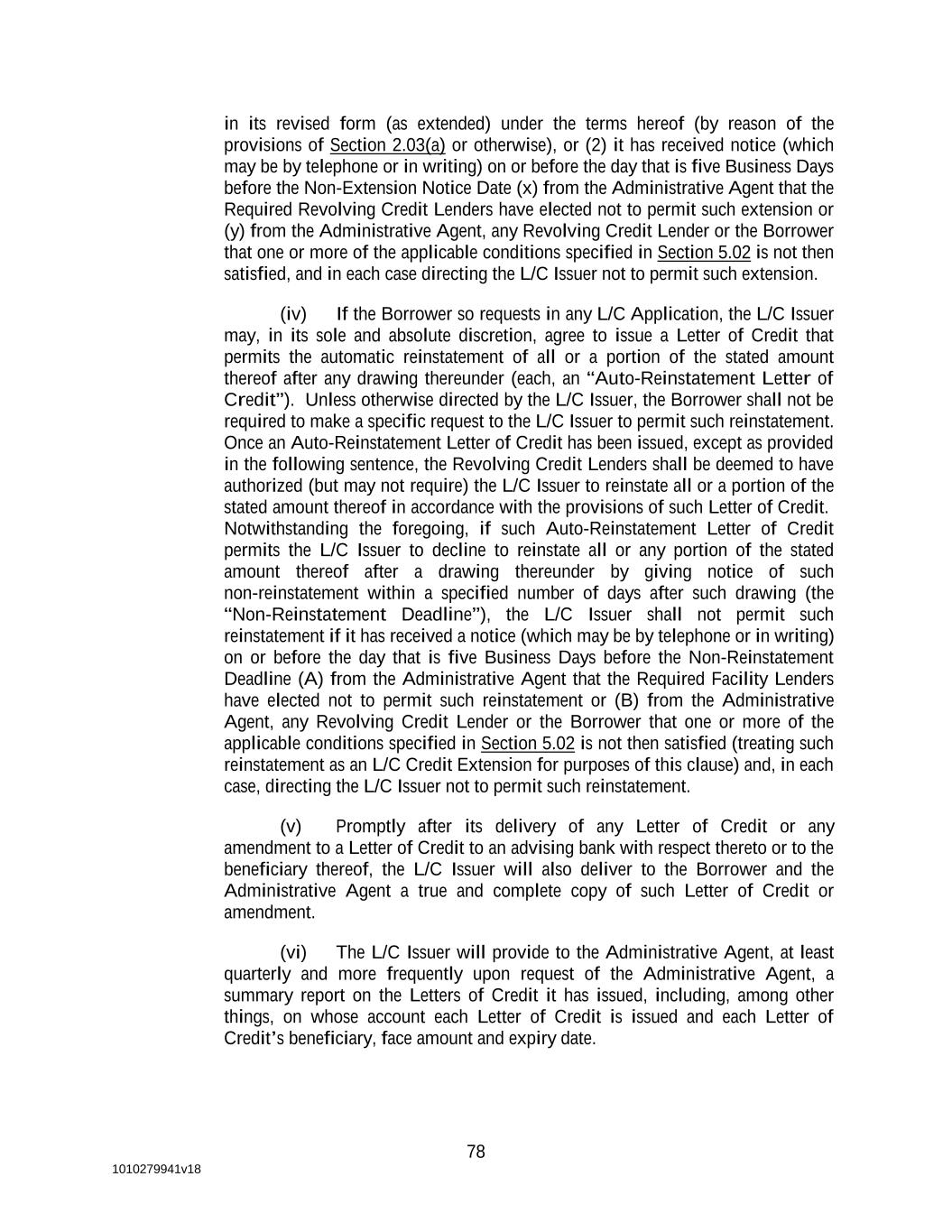 in its revised form (as extended) under the terms hereof (by reason of the provisions of Section 2.03(a) or otherwise), or (2) it has received notice (which may be by telephone or in writing) on or before the day that is five Business Days before the Non-Extension Notice Date (x) from the Administrative Agent that the Required Revolving Credit Lenders have elected not to permit such extension or (y) from the Administrative Agent, any Revolving Credit Lender or the Borrower that one or more of the applicable conditions specified in Section 5.02 is not then satisfied, and in each case directing the L/C Issuer not to permit such extension. (iv) If the Borrower so requests in any L/C Application, the L/C Issuer may, in its sole and absolute discretion, agree to issue a Letter of Credit that permits the automatic reinstatement of all or a portion of the stated amount thereof after any drawing thereunder (each, an “Auto-Reinstatement Letter of Credit”). Unless otherwise directed by the L/C Issuer, the Borrower shall not be required to make a specific request to the L/C Issuer to permit such reinstatement. Once an Auto-Reinstatement Letter of Credit has been issued, except as provided in the following sentence, the Revolving Credit Lenders shall be deemed to have authorized (but may not require) the L/C Issuer to reinstate all or a portion of the stated amount thereof in accordance with the provisions of such Letter of Credit. Notwithstanding the foregoing, if such Auto-Reinstatement Letter of Credit permits the L/C Issuer to decline to reinstate all or any portion of the stated amount thereof after a drawing thereunder by giving notice of such non-reinstatement within a specified number of days after such drawing (the “Non-Reinstatement Deadline”), the L/C Issuer shall not permit such reinstatement if it has received a notice (which may be by telephone or in writing) on or before the day that is five Business Days before the Non-Reinstatement Deadline (A) from the Administrative Agent that the Required Facility Lenders have elected not to permit such reinstatement or (B) from the Administrative Agent, any Revolving Credit Lender or the Borrower that one or more of the applicable conditions specified in Section 5.02 is not then satisfied (treating such reinstatement as an L/C Credit Extension for purposes of this clause) and, in each case, directing the L/C Issuer not to permit such reinstatement. (v) Promptly after its delivery of any Letter of Credit or any amendment to a Letter of Credit to an advising bank with respect thereto or to the beneficiary thereof, the L/C Issuer will also deliver to the Borrower and the Administrative Agent a true and complete copy of such Letter of Credit or amendment. (vi) The L/C Issuer will provide to the Administrative Agent, at least quarterly and more frequently upon request of the Administrative Agent, a summary report on the Letters of Credit it has issued, including, among other things, on whose account each Letter of Credit is issued and each Letter of Credit’s beneficiary, face amount and expiry date. 78 1010279941v18