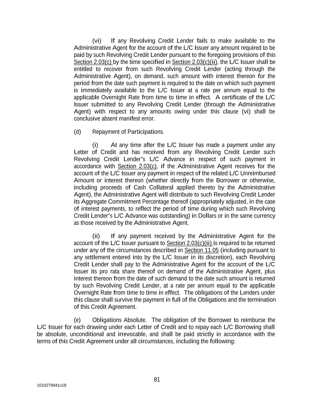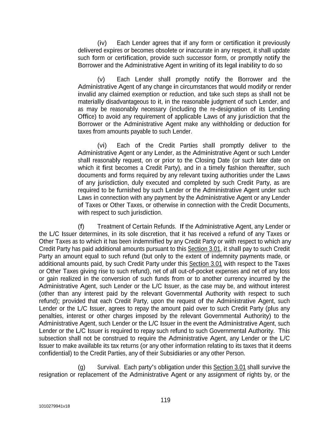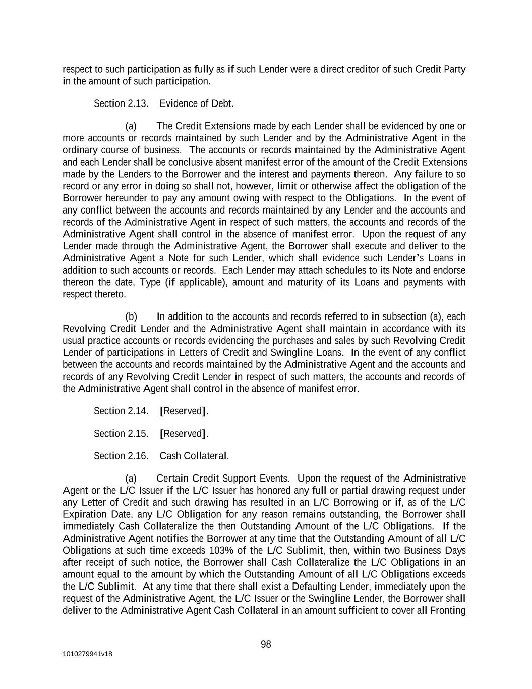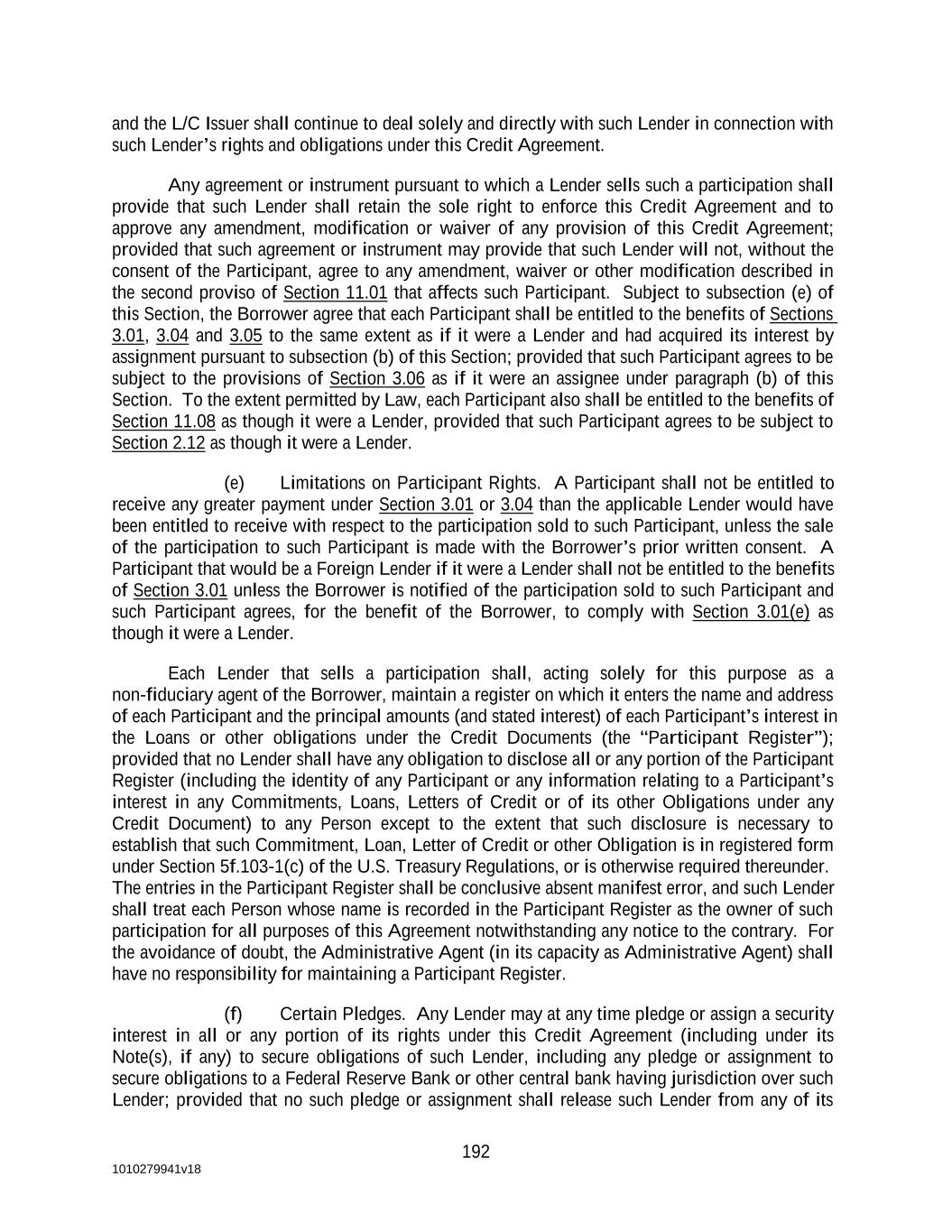 and the L/C Issuer shall continue to deal solely and directly with such Lender in connection with such Lender’s rights and obligations under this Credit Agreement. Any agreement or instrument pursuant to which a Lender sells such a participation shall provide that such Lender shall retain the sole right to enforce this Credit Agreement and to approve any amendment, modification or waiver of any provision of this Credit Agreement; provided that such agreement or instrument may provide that such Lender will not, without the consent of the Participant, agree to any amendment, waiver or other modification described in the second proviso of Section 11.01 that affects such Participant. Subject to subsection (e) of this Section, the Borrower agree that each Participant shall be entitled to the benefits of Sections 3.01, 3.04 and 3.05 to the same extent as if it were a Lender and had acquired its interest by assignment pursuant to subsection (b) of this Section; provided that such Participant agrees to be subject to the provisions of Section 3.06 as if it were an assignee under paragraph (b) of this Section. To the extent permitted by Law, each Participant also shall be entitled to the benefits of Section 11.08 as though it were a Lender, provided that such Participant agrees to be subject to Section 2.12 as though it were a Lender. (e) Limitations on Participant Rights. A Participant shall not be entitled to receive any greater payment under Section 3.01 or 3.04 than the applicable Lender would have been entitled to receive with respect to the participation sold to such Participant, unless the sale of the participation to such Participant is made with the Borrower’s prior written consent. A Participant that would be a Foreign Lender if it were a Lender shall not be entitled to the benefits of Section 3.01 unless the Borrower is notified of the participation sold to such Participant and such Participant agrees, for the benefit of the Borrower, to comply with Section 3.01(e) as though it were a Lender. Each Lender that sells a participation shall, acting solely for this purpose as a non-fiduciary agent of the Borrower, maintain a register on which it enters the name and address of each Participant and the principal amounts (and stated interest) of each Participant’s interest in the Loans or other obligations under the Credit Documents (the “Participant Register”); provided that no Lender shall have any obligation to disclose all or any portion of the Participant Register (including the identity of any Participant or any information relating to a Participant’s interest in any Commitments, Loans, Letters of Credit or of its other Obligations under any Credit Document) to any Person except to the extent that such disclosure is necessary to establish that such Commitment, Loan, Letter of Credit or other Obligation is in registered form under Section 5f.103-1(c) of the U.S. Treasury Regulations, or is otherwise required thereunder. The entries in the Participant Register shall be conclusive absent manifest error, and such Lender shall treat each Person whose name is recorded in the Participant Register as the owner of such participation for all purposes of this Agreement notwithstanding any notice to the contrary. For the avoidance of doubt, the Administrative Agent (in its capacity as Administrative Agent) shall have no responsibility for maintaining a Participant Register. (f) Certain Pledges. Any Lender may at any time pledge or assign a security interest in all or any portion of its rights under this Credit Agreement (including under its Note(s), if any) to secure obligations of such Lender, including any pledge or assignment to secure obligations to a Federal Reserve Bank or other central bank having jurisdiction over such Lender; provided that no such pledge or assignment shall release such Lender from any of its 192 1010279941v18