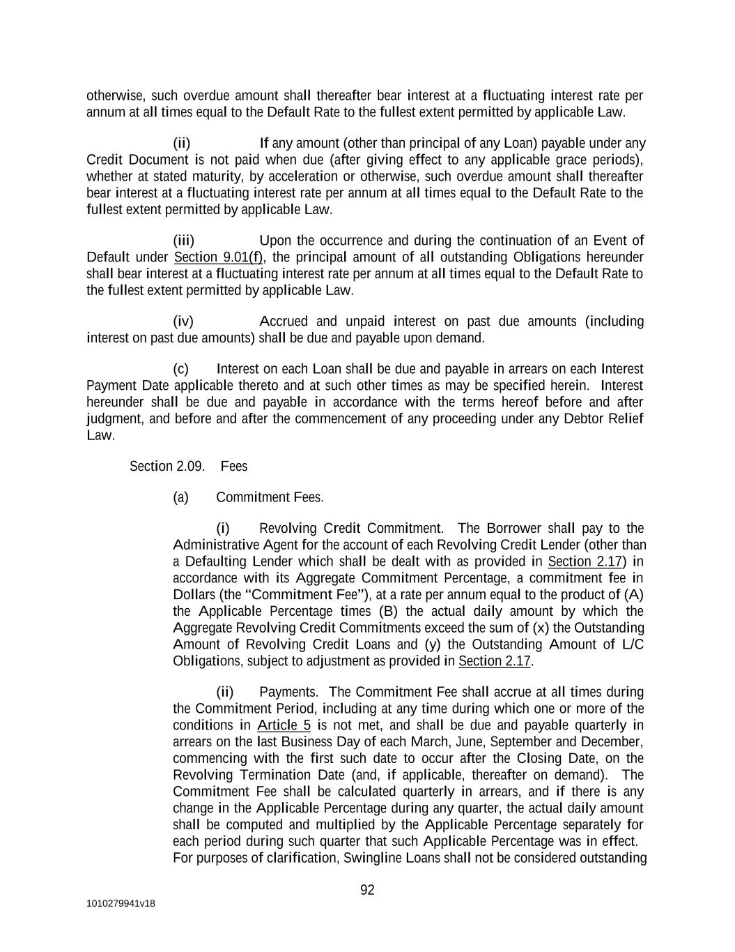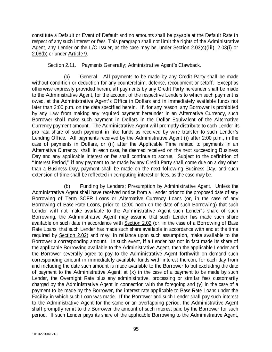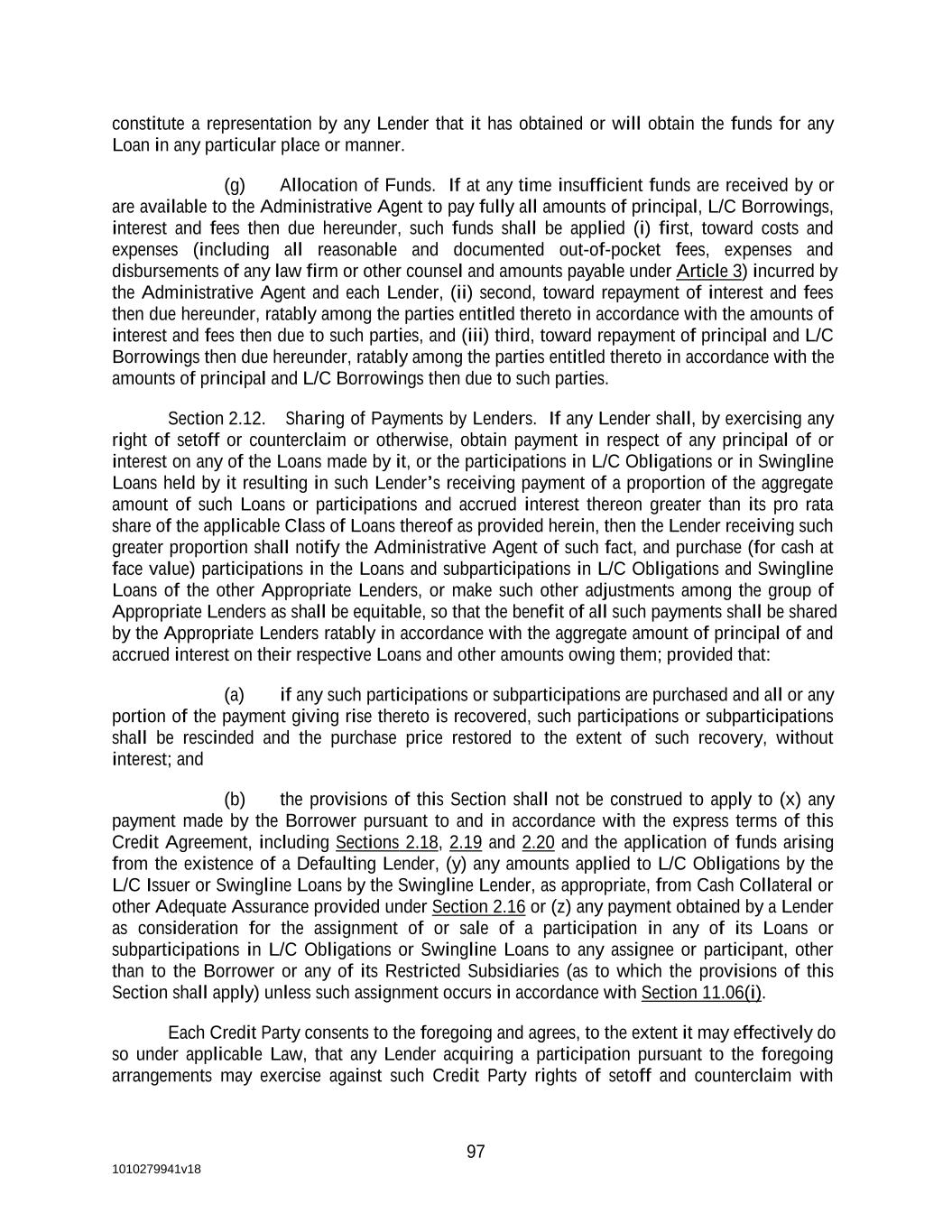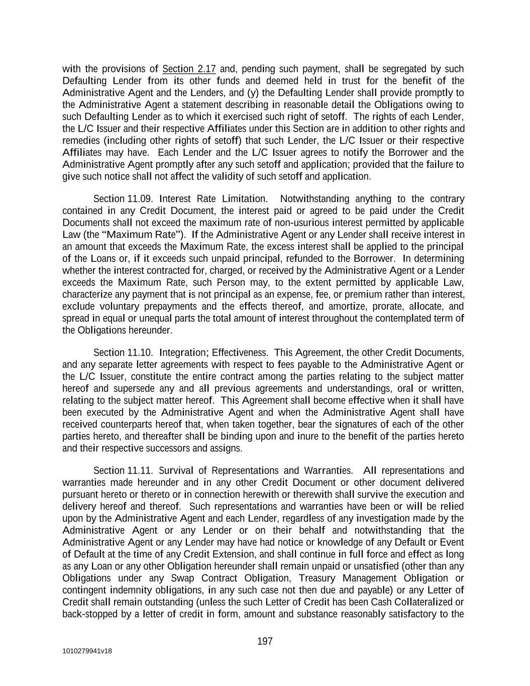 with the provisions of Section 2.17 and, pending such payment, shall be segregated by such Defaulting Lender from its other funds and deemed held in trust for the benefit of the Administrative Agent and the Lenders, and (y) the Defaulting Lender shall provide promptly to the Administrative Agent a statement describing in reasonable detail the Obligations owing to such Defaulting Lender as to which it exercised such right of setoff. The rights of each Lender, the L/C Issuer and their respective Affiliates under this Section are in addition to other rights and remedies (including other rights of setoff) that such Lender, the L/C Issuer or their respective Affiliates may have. Each Lender and the L/C Issuer agrees to notify the Borrower and the Administrative Agent promptly after any such setoff and application; provided that the failure to give such notice shall not affect the validity of such setoff and application. Section 11.09. Interest Rate Limitation. Notwithstanding anything to the contrary contained in any Credit Document, the interest paid or agreed to be paid under the Credit Documents shall not exceed the maximum rate of non-usurious interest permitted by applicable Law (the “Maximum Rate”). If the Administrative Agent or any Lender shall receive interest in an amount that exceeds the Maximum Rate, the excess interest shall be applied to the principal of the Loans or, if it exceeds such unpaid principal, refunded to the Borrower. In determining whether the interest contracted for, charged, or received by the Administrative Agent or a Lender exceeds the Maximum Rate, such Person may, to the extent permitted by applicable Law, characterize any payment that is not principal as an expense, fee, or premium rather than interest, exclude voluntary prepayments and the effects thereof, and amortize, prorate, allocate, and spread in equal or unequal parts the total amount of interest throughout the contemplated term of the Obligations hereunder. Section 11.10. Integration; Effectiveness. This Agreement, the other Credit Documents, and any separate letter agreements with respect to fees payable to the Administrative Agent or the L/C Issuer, constitute the entire contract among the parties relating to the subject matter hereof and supersede any and all previous agreements and understandings, oral or written, relating to the subject matter hereof. This Agreement shall become effective when it shall have been executed by the Administrative Agent and when the Administrative Agent shall have received counterparts hereof that, when taken together, bear the signatures of each of the other parties hereto, and thereafter shall be binding upon and inure to the benefit of the parties hereto and their respective successors and assigns. Section 11.11. Survival of Representations and Warranties. All representations and warranties made hereunder and in any other Credit Document or other document delivered pursuant hereto or thereto or in connection herewith or therewith shall survive the execution and delivery hereof and thereof. Such representations and warranties have been or will be relied upon by the Administrative Agent and each Lender, regardless of any investigation made by the Administrative Agent or any Lender or on their behalf and notwithstanding that the Administrative Agent or any Lender may have had notice or knowledge of any Default or Event of Default at the time of any Credit Extension, and shall continue in full force and effect as long as any Loan or any other Obligation hereunder shall remain unpaid or unsatisfied (other than any Obligations under any Swap Contract Obligation, Treasury Management Obligation or contingent indemnity obligations, in any such case not then due and payable) or any Letter of Credit shall remain outstanding (unless the such Letter of Credit has been Cash Collateralized or back-stopped by a letter of credit in form, amount and substance reasonably satisfactory to the 197 1010279941v18