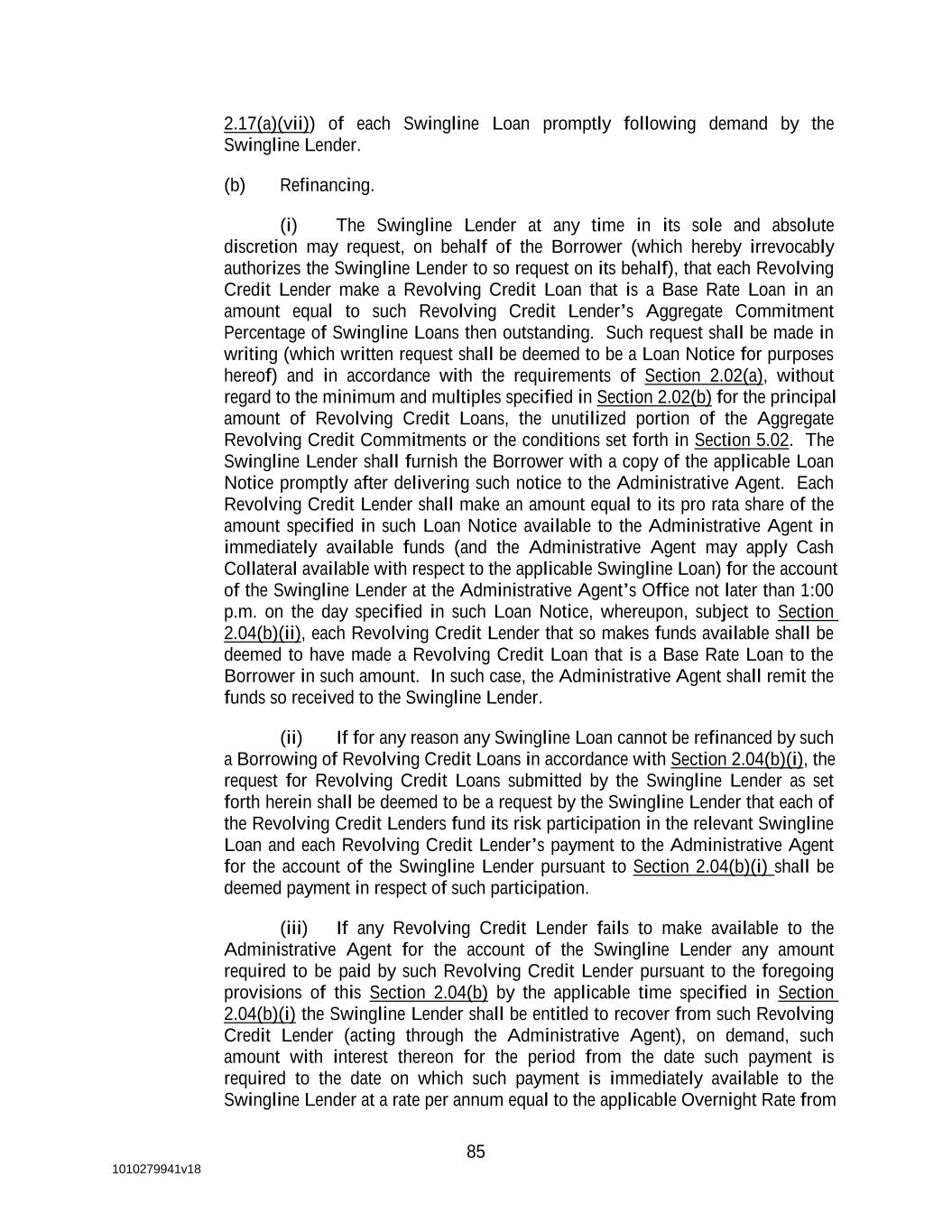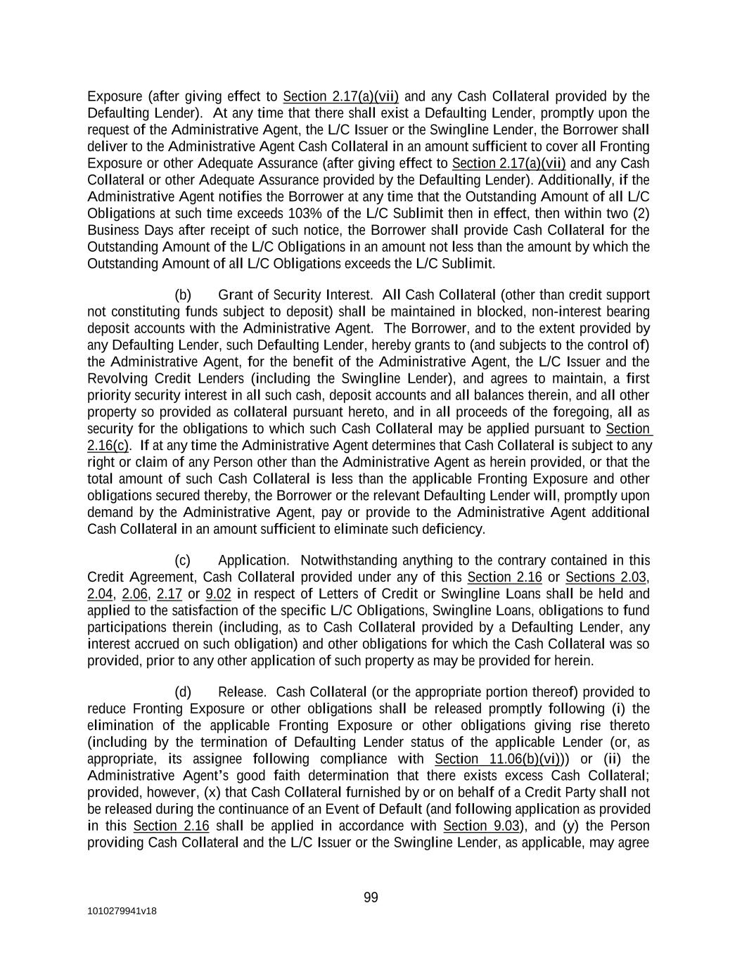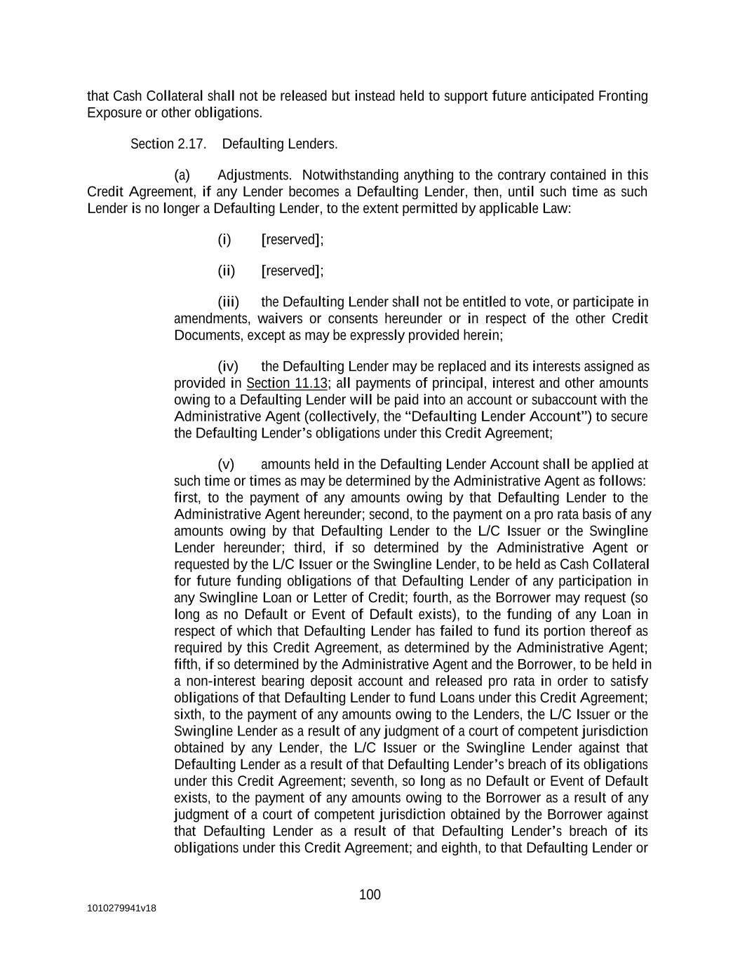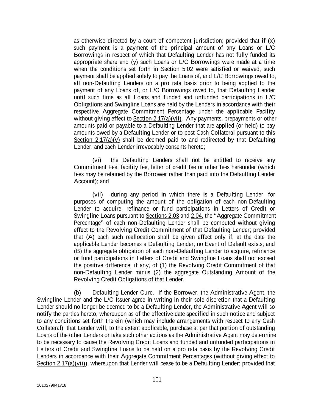 with the provisions of Section 2.17 and, pending such payment, shall be segregated by such Defaulting Lender from its other funds and deemed held in trust for the benefit of the Administrative Agent and the Lenders, and (y) the Defaulting Lender shall provide promptly to the Administrative Agent a statement describing in reasonable detail the Obligations owing to such Defaulting Lender as to which it exercised such right of setoff. The rights of each Lender, the L/C Issuer and their respective Affiliates under this Section are in addition to other rights and remedies (including other rights of setoff) that such Lender, the L/C Issuer or their respective Affiliates may have. Each Lender and the L/C Issuer agrees to notify the Borrower and the Administrative Agent promptly after any such setoff and application; provided that the failure to give such notice shall not affect the validity of such setoff and application. Section 11.09. Interest Rate Limitation. Notwithstanding anything to the contrary contained in any Credit Document, the interest paid or agreed to be paid under the Credit Documents shall not exceed the maximum rate of non-usurious interest permitted by applicable Law (the “Maximum Rate”). If the Administrative Agent or any Lender shall receive interest in an amount that exceeds the Maximum Rate, the excess interest shall be applied to the principal of the Loans or, if it exceeds such unpaid principal, refunded to the Borrower. In determining whether the interest contracted for, charged, or received by the Administrative Agent or a Lender exceeds the Maximum Rate, such Person may, to the extent permitted by applicable Law, characterize any payment that is not principal as an expense, fee, or premium rather than interest, exclude voluntary prepayments and the effects thereof, and amortize, prorate, allocate, and spread in equal or unequal parts the total amount of interest throughout the contemplated term of the Obligations hereunder. Section 11.10. Integration; Effectiveness. This Agreement, the other Credit Documents, and any separate letter agreements with respect to fees payable to the Administrative Agent or the L/C Issuer, constitute the entire contract among the parties relating to the subject matter hereof and supersede any and all previous agreements and understandings, oral or written, relating to the subject matter hereof. This Agreement shall become effective when it shall have been executed by the Administrative Agent and when the Administrative Agent shall have received counterparts hereof that, when taken together, bear the signatures of each of the other parties hereto, and thereafter shall be binding upon and inure to the benefit of the parties hereto and their respective successors and assigns. Section 11.11. Survival of Representations and Warranties. All representations and warranties made hereunder and in any other Credit Document or other document delivered pursuant hereto or thereto or in connection herewith or therewith shall survive the execution and delivery hereof and thereof. Such representations and warranties have been or will be relied upon by the Administrative Agent and each Lender, regardless of any investigation made by the Administrative Agent or any Lender or on their behalf and notwithstanding that the Administrative Agent or any Lender may have had notice or knowledge of any Default or Event of Default at the time of any Credit Extension, and shall continue in full force and effect as long as any Loan or any other Obligation hereunder shall remain unpaid or unsatisfied (other than any Obligations under any Swap Contract Obligation, Treasury Management Obligation or contingent indemnity obligations, in any such case not then due and payable) or any Letter of Credit shall remain outstanding (unless the such Letter of Credit has been Cash Collateralized or back-stopped by a letter of credit in form, amount and substance reasonably satisfactory to the 197 1010279941v18