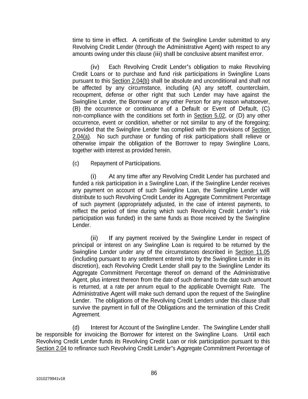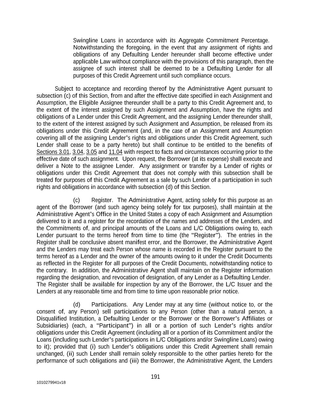 Swingline Loans in accordance with its Aggregate Commitment Percentage. Notwithstanding the foregoing, in the event that any assignment of rights and obligations of any Defaulting Lender hereunder shall become effective under applicable Law without compliance with the provisions of this paragraph, then the assignee of such interest shall be deemed to be a Defaulting Lender for all purposes of this Credit Agreement until such compliance occurs. Subject to acceptance and recording thereof by the Administrative Agent pursuant to subsection (c) of this Section, from and after the effective date specified in each Assignment and Assumption, the Eligible Assignee thereunder shall be a party to this Credit Agreement and, to the extent of the interest assigned by such Assignment and Assumption, have the rights and obligations of a Lender under this Credit Agreement, and the assigning Lender thereunder shall, to the extent of the interest assigned by such Assignment and Assumption, be released from its obligations under this Credit Agreement (and, in the case of an Assignment and Assumption covering all of the assigning Lender’s rights and obligations under this Credit Agreement, such Lender shall cease to be a party hereto) but shall continue to be entitled to the benefits of Sections 3.01, 3.04, 3.05 and 11.04 with respect to facts and circumstances occurring prior to the effective date of such assignment. Upon request, the Borrower (at its expense) shall execute and deliver a Note to the assignee Lender. Any assignment or transfer by a Lender of rights or obligations under this Credit Agreement that does not comply with this subsection shall be treated for purposes of this Credit Agreement as a sale by such Lender of a participation in such rights and obligations in accordance with subsection (d) of this Section. (c) Register. The Administrative Agent, acting solely for this purpose as an agent of the Borrower (and such agency being solely for tax purposes), shall maintain at the Administrative Agent’s Office in the United States a copy of each Assignment and Assumption delivered to it and a register for the recordation of the names and addresses of the Lenders, and the Commitments of, and principal amounts of the Loans and L/C Obligations owing to, each Lender pursuant to the terms hereof from time to time (the “Register”). The entries in the Register shall be conclusive absent manifest error, and the Borrower, the Administrative Agent and the Lenders may treat each Person whose name is recorded in the Register pursuant to the terms hereof as a Lender and the owner of the amounts owing to it under the Credit Documents as reflected in the Register for all purposes of the Credit Documents, notwithstanding notice to the contrary. In addition, the Administrative Agent shall maintain on the Register information regarding the designation, and revocation of designation, of any Lender as a Defaulting Lender. The Register shall be available for inspection by any of the Borrower, the L/C Issuer and the Lenders at any reasonable time and from time to time upon reasonable prior notice. (d) Participations. Any Lender may at any time (without notice to, or the consent of, any Person) sell participations to any Person (other than a natural person, a Disqualified Institution, a Defaulting Lender or the Borrower or the Borrower’s Affiliates or Subsidiaries) (each, a “Participant”) in all or a portion of such Lender’s rights and/or obligations under this Credit Agreement (including all or a portion of its Commitment and/or the Loans (including such Lender’s participations in L/C Obligations and/or Swingline Loans) owing to it); provided that (i) such Lender’s obligations under this Credit Agreement shall remain unchanged, (ii) such Lender shall remain solely responsible to the other parties hereto for the performance of such obligations and (iii) the Borrower, the Administrative Agent, the Lenders 191 1010279941v18