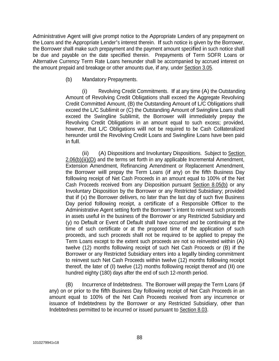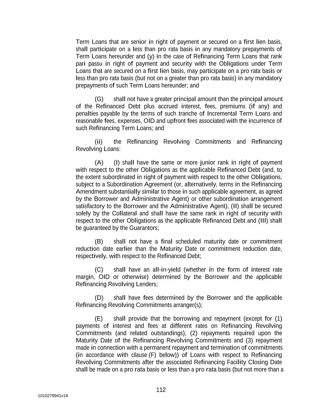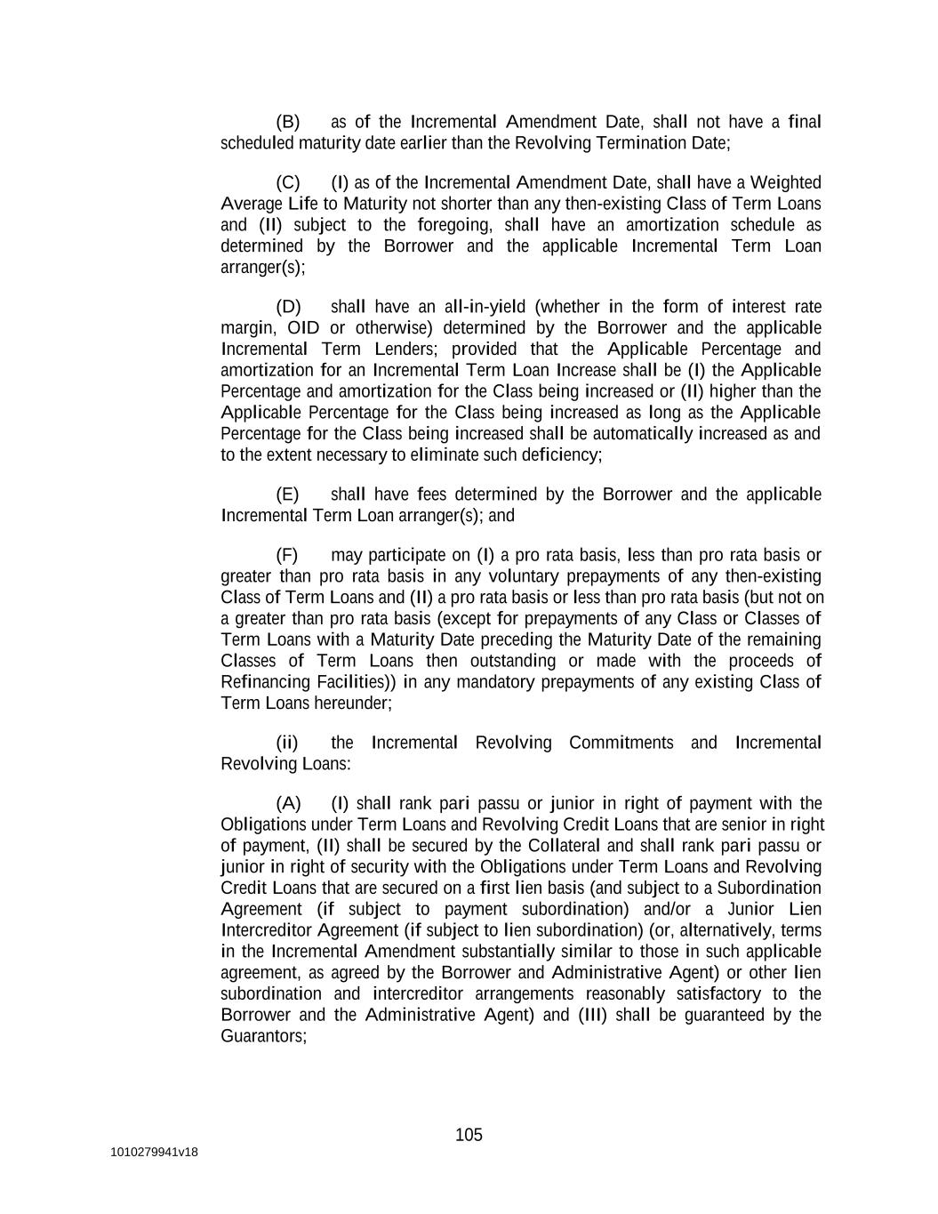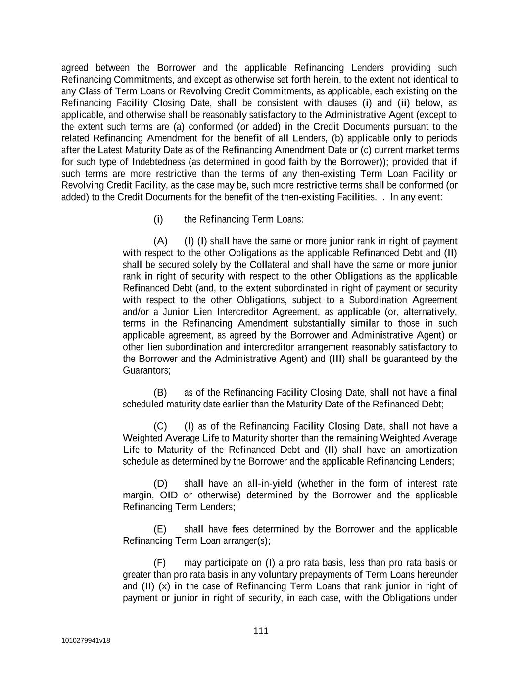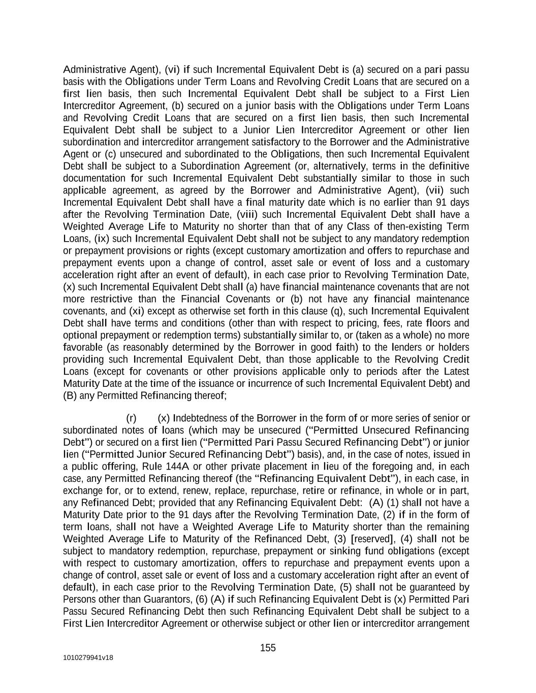 Administrative Agent), (vi) if such Incremental Equivalent Debt is (a) secured on a pari passu basis with the Obligations under Term Loans and Revolving Credit Loans that are secured on a first lien basis, then such Incremental Equivalent Debt shall be subject to a First Lien Intercreditor Agreement, (b) secured on a junior basis with the Obligations under Term Loans and Revolving Credit Loans that are secured on a first lien basis, then such Incremental Equivalent Debt shall be subject to a Junior Lien Intercreditor Agreement or other lien subordination and intercreditor arrangement satisfactory to the Borrower and the Administrative Agent or (c) unsecured and subordinated to the Obligations, then such Incremental Equivalent Debt shall be subject to a Subordination Agreement (or, alternatively, terms in the definitive documentation for such Incremental Equivalent Debt substantially similar to those in such applicable agreement, as agreed by the Borrower and Administrative Agent), (vii) such Incremental Equivalent Debt shall have a final maturity date which is no earlier than 91 days after the Revolving Termination Date, (viii) such Incremental Equivalent Debt shall have a Weighted Average Life to Maturity no shorter than that of any Class of then-existing Term Loans, (ix) such Incremental Equivalent Debt shall not be subject to any mandatory redemption or prepayment provisions or rights (except customary amortization and offers to repurchase and prepayment events upon a change of control, asset sale or event of loss and a customary acceleration right after an event of default), in each case prior to Revolving Termination Date, (x) such Incremental Equivalent Debt shall (a) have financial maintenance covenants that are not more restrictive than the Financial Covenants or (b) not have any financial maintenance covenants, and (xi) except as otherwise set forth in this clause (q), such Incremental Equivalent Debt shall have terms and conditions (other than with respect to pricing, fees, rate floors and optional prepayment or redemption terms) substantially similar to, or (taken as a whole) no more favorable (as reasonably determined by the Borrower in good faith) to the lenders or holders providing such Incremental Equivalent Debt, than those applicable to the Revolving Credit Loans (except for covenants or other provisions applicable only to periods after the Latest Maturity Date at the time of the issuance or incurrence of such Incremental Equivalent Debt) and (B) any Permitted Refinancing thereof; (r) (x) Indebtedness of the Borrower in the form of or more series of senior or subordinated notes of loans (which may be unsecured (“Permitted Unsecured Refinancing Debt”) or secured on a first lien (“Permitted Pari Passu Secured Refinancing Debt”) or junior lien (“Permitted Junior Secured Refinancing Debt”) basis), and, in the case of notes, issued in a public offering, Rule 144A or other private placement in lieu of the foregoing and, in each case, any Permitted Refinancing thereof (the “Refinancing Equivalent Debt”), in each case, in exchange for, or to extend, renew, replace, repurchase, retire or refinance, in whole or in part, any Refinanced Debt; provided that any Refinancing Equivalent Debt: (A) (1) shall not have a Maturity Date prior to the 91 days after the Revolving Termination Date, (2) if in the form of term loans, shall not have a Weighted Average Life to Maturity shorter than the remaining Weighted Average Life to Maturity of the Refinanced Debt, (3) [reserved], (4) shall not be subject to mandatory redemption, repurchase, prepayment or sinking fund obligations (except with respect to customary amortization, offers to repurchase and prepayment events upon a change of control, asset sale or event of loss and a customary acceleration right after an event of default), in each case prior to the Revolving Termination Date, (5) shall not be guaranteed by Persons other than Guarantors, (6) (A) if such Refinancing Equivalent Debt is (x) Permitted Pari Passu Secured Refinancing Debt then such Refinancing Equivalent Debt shall be subject to a First Lien Intercreditor Agreement or otherwise subject or other lien or intercreditor arrangement 155 1010279941v18