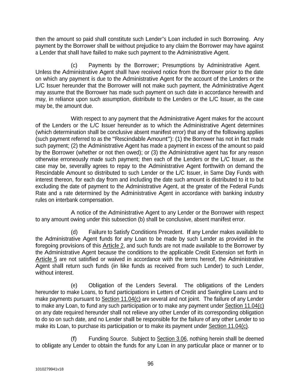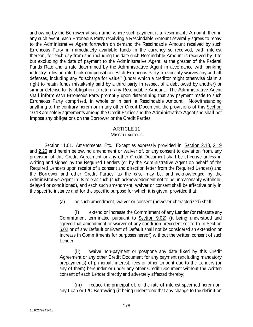 and owing by the Borrower at such time, where such payment is a Rescindable Amount, then in any such event, each Erroneous Party receiving a Rescindable Amount severally agrees to repay to the Administrative Agent forthwith on demand the Rescindable Amount received by such Erroneous Party in immediately available funds in the currency so received, with interest thereon, for each day from and including the date such Rescindable Amount is received by it to but excluding the date of payment to the Administrative Agent, at the greater of the Federal Funds Rate and a rate determined by the Administrative Agent in accordance with banking industry rules on interbank compensation. Each Erroneous Party irrevocably waives any and all defenses, including any “discharge for value” (under which a creditor might otherwise claim a right to retain funds mistakenly paid by a third party in respect of a debt owed by another) or similar defense to its obligation to return any Rescindable Amount. The Administrative Agent shall inform each Erroneous Party promptly upon determining that any payment made to such Erroneous Party comprised, in whole or in part, a Rescindable Amount. Notwithstanding anything to the contrary herein or in any other Credit Document, the provisions of this Section 10.13 are solely agreements among the Credit Parties and the Administrative Agent and shall not impose any obligations on the Borrower or the Credit Parties. ARTICLE 11 MISCELLANEOUS Section 11.01. Amendments, Etc. Except as expressly provided in, Section 2.18, 2.19 and 2.20 and herein below, no amendment or waiver of, or any consent to deviation from, any provision of this Credit Agreement or any other Credit Document shall be effective unless in writing and signed by the Required Lenders (or by the Administrative Agent on behalf of the Required Lenders upon receipt of a consent and direction letter from the Required Lenders) and the Borrower and other Credit Parties, as the case may be, and acknowledged by the Administrative Agent in its role as such (such acknowledgment not to be unreasonably withheld, delayed or conditioned), and each such amendment, waiver or consent shall be effective only in the specific instance and for the specific purpose for which it is given; provided that: (a) no such amendment, waiver or consent (however characterized) shall: (i) extend or increase the Commitment of any Lender (or reinstate any Commitment terminated pursuant to Section 9.02) (it being understood and agreed that amendment or waiver of any condition precedent set forth in Section 5.02 or of any Default or Event of Default shall not be considered an extension or increase in Commitments for purposes hereof) without the written consent of such Lender; (ii) waive non-payment or postpone any date fixed by this Credit Agreement or any other Credit Document for any payment (excluding mandatory prepayments) of principal, interest, fees or other amount due to the Lenders (or any of them) hereunder or under any other Credit Document without the written consent of each Lender directly and adversely affected thereby; (iii) reduce the principal of, or the rate of interest specified herein on, any Loan or L/C Borrowing (it being understood that any change to the definition 178 1010279941v18