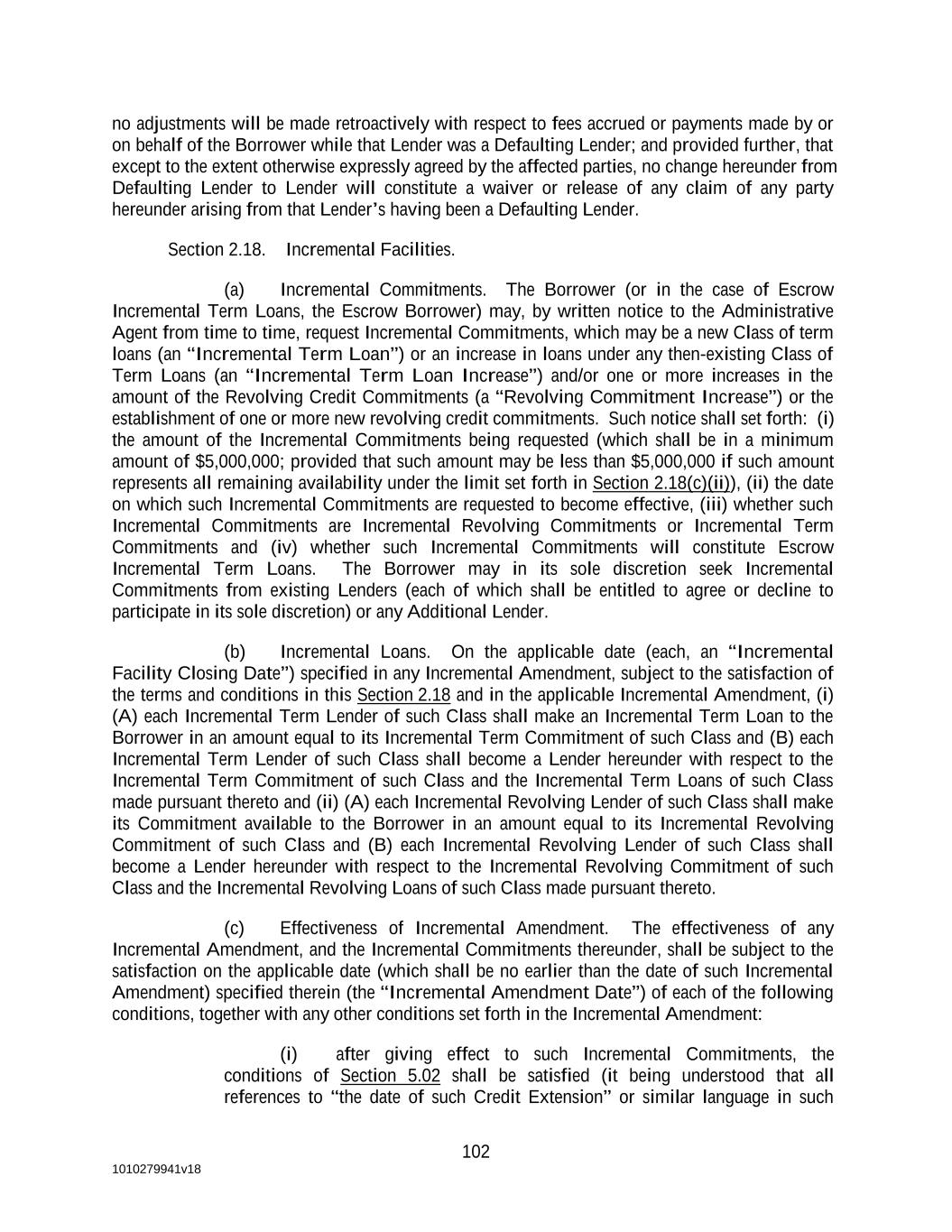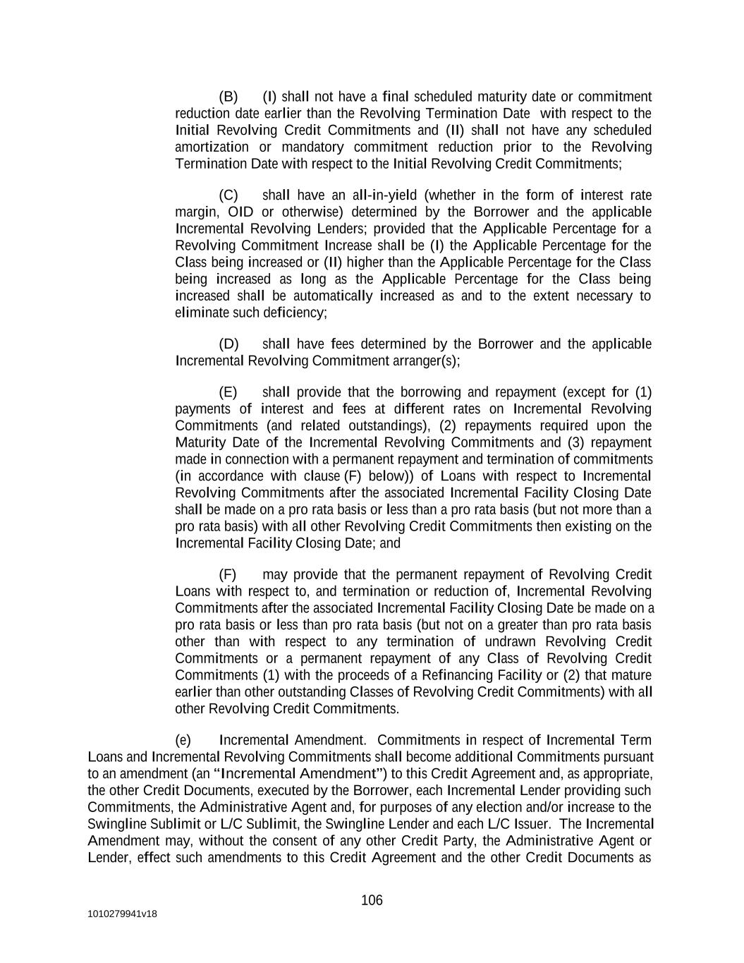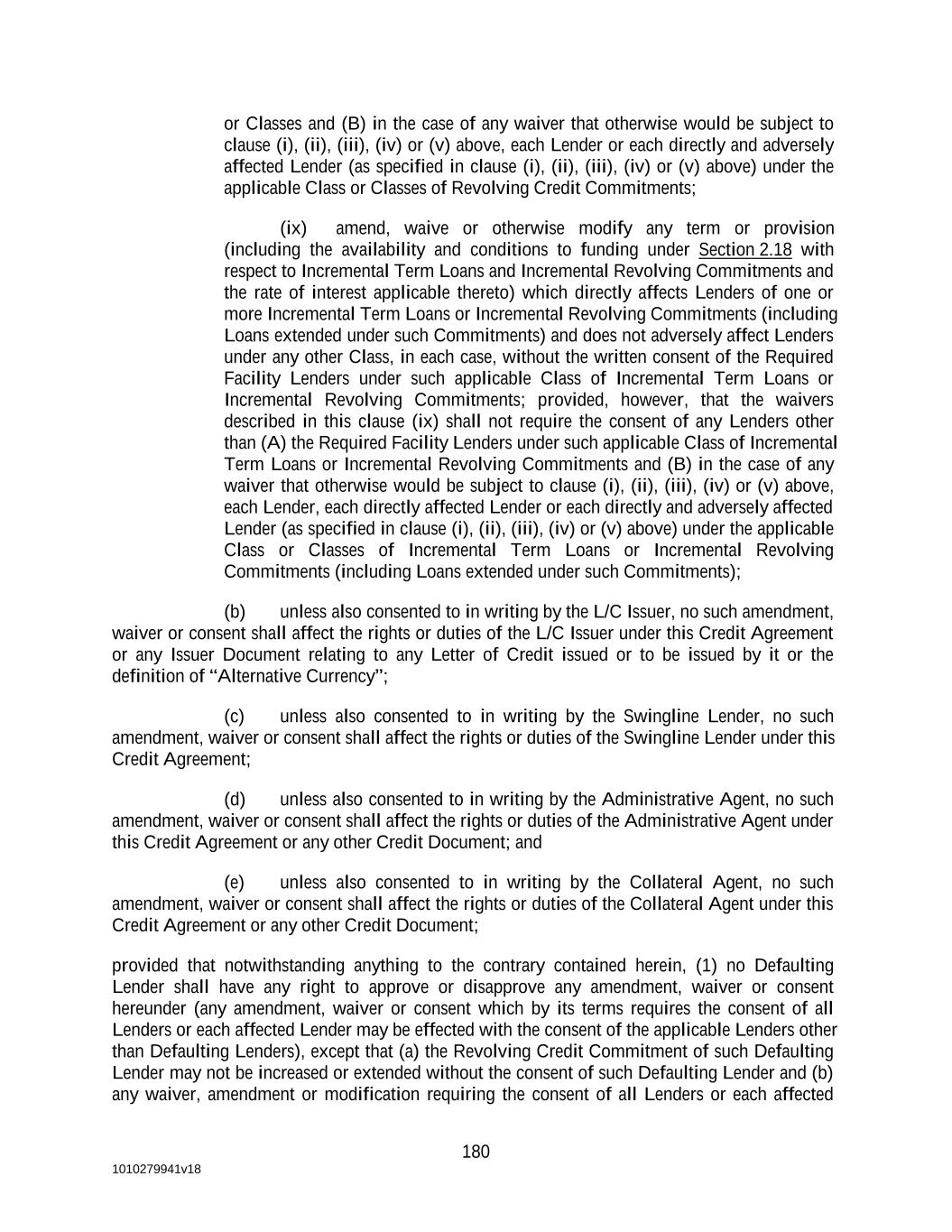 or Classes and (B) in the case of any waiver that otherwise would be subject to clause (i), (ii), (iii), (iv) or (v) above, each Lender or each directly and adversely affected Lender (as specified in clause (i), (ii), (iii), (iv) or (v) above) under the applicable Class or Classes of Revolving Credit Commitments; (ix) amend, waive or otherwise modify any term or provision (including the availability and conditions to funding under Section 2.18 with respect to Incremental Term Loans and Incremental Revolving Commitments and the rate of interest applicable thereto) which directly affects Lenders of one or more Incremental Term Loans or Incremental Revolving Commitments (including Loans extended under such Commitments) and does not adversely affect Lenders under any other Class, in each case, without the written consent of the Required Facility Lenders under such applicable Class of Incremental Term Loans or Incremental Revolving Commitments; provided, however, that the waivers described in this clause (ix) shall not require the consent of any Lenders other than (A) the Required Facility Lenders under such applicable Class of Incremental Term Loans or Incremental Revolving Commitments and (B) in the case of any waiver that otherwise would be subject to clause (i), (ii), (iii), (iv) or (v) above, each Lender, each directly affected Lender or each directly and adversely affected Lender (as specified in clause (i), (ii), (iii), (iv) or (v) above) under the applicable Class or Classes of Incremental Term Loans or Incremental Revolving Commitments (including Loans extended under such Commitments); (b) unless also consented to in writing by the L/C Issuer, no such amendment, waiver or consent shall affect the rights or duties of the L/C Issuer under this Credit Agreement or any Issuer Document relating to any Letter of Credit issued or to be issued by it or the definition of “Alternative Currency”; (c) unless also consented to in writing by the Swingline Lender, no such amendment, waiver or consent shall affect the rights or duties of the Swingline Lender under this Credit Agreement; (d) unless also consented to in writing by the Administrative Agent, no such amendment, waiver or consent shall affect the rights or duties of the Administrative Agent under this Credit Agreement or any other Credit Document; and (e) unless also consented to in writing by the Collateral Agent, no such amendment, waiver or consent shall affect the rights or duties of the Collateral Agent under this Credit Agreement or any other Credit Document; provided that notwithstanding anything to the contrary contained herein, (1) no Defaulting Lender shall have any right to approve or disapprove any amendment, waiver or consent hereunder (any amendment, waiver or consent which by its terms requires the consent of all Lenders or each affected Lender may be effected with the consent of the applicable Lenders other than Defaulting Lenders), except that (a) the Revolving Credit Commitment of such Defaulting Lender may not be increased or extended without the consent of such Defaulting Lender and (b) any waiver, amendment or modification requiring the consent of all Lenders or each affected 180 1010279941v18
