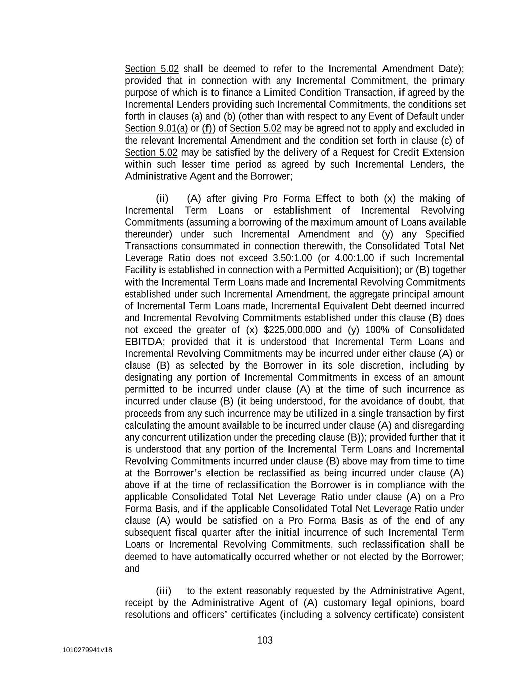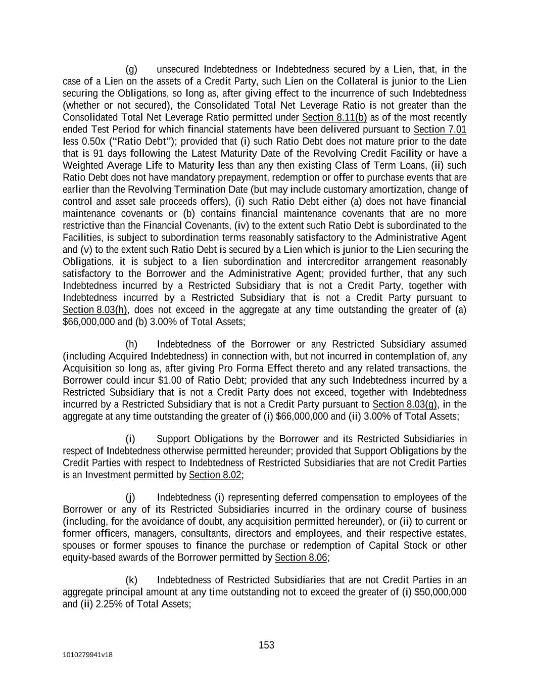 (g) unsecured Indebtedness or Indebtedness secured by a Lien, that, in the case of a Lien on the assets of a Credit Party, such Lien on the Collateral is junior to the Lien securing the Obligations, so long as, after giving effect to the incurrence of such Indebtedness (whether or not secured), the Consolidated Total Net Leverage Ratio is not greater than the Consolidated Total Net Leverage Ratio permitted under Section 8.11(b) as of the most recently ended Test Period for which financial statements have been delivered pursuant to Section 7.01 less 0.50x (“Ratio Debt”); provided that (i) such Ratio Debt does not mature prior to the date that is 91 days following the Latest Maturity Date of the Revolving Credit Facility or have a Weighted Average Life to Maturity less than any then existing Class of Term Loans, (ii) such Ratio Debt does not have mandatory prepayment, redemption or offer to purchase events that are earlier than the Revolving Termination Date (but may include customary amortization, change of control and asset sale proceeds offers), (i) such Ratio Debt either (a) does not have financial maintenance covenants or (b) contains financial maintenance covenants that are no more restrictive than the Financial Covenants, (iv) to the extent such Ratio Debt is subordinated to the Facilities, is subject to subordination terms reasonably satisfactory to the Administrative Agent and (v) to the extent such Ratio Debt is secured by a Lien which is junior to the Lien securing the Obligations, it is subject to a lien subordination and intercreditor arrangement reasonably satisfactory to the Borrower and the Administrative Agent; provided further, that any such Indebtedness incurred by a Restricted Subsidiary that is not a Credit Party, together with Indebtedness incurred by a Restricted Subsidiary that is not a Credit Party pursuant to Section 8.03(h), does not exceed in the aggregate at any time outstanding the greater of (a) $66,000,000 and (b) 3.00% of Total Assets; (h) Indebtedness of the Borrower or any Restricted Subsidiary assumed (including Acquired Indebtedness) in connection with, but not incurred in contemplation of, any Acquisition so long as, after giving Pro Forma Effect thereto and any related transactions, the Borrower could incur $1.00 of Ratio Debt; provided that any such Indebtedness incurred by a Restricted Subsidiary that is not a Credit Party does not exceed, together with Indebtedness incurred by a Restricted Subsidiary that is not a Credit Party pursuant to Section 8.03(g), in the aggregate at any time outstanding the greater of (i) $66,000,000 and (ii) 3.00% of Total Assets; (i) Support Obligations by the Borrower and its Restricted Subsidiaries in respect of Indebtedness otherwise permitted hereunder; provided that Support Obligations by the Credit Parties with respect to Indebtedness of Restricted Subsidiaries that are not Credit Parties is an Investment permitted by Section 8.02; (j) Indebtedness (i) representing deferred compensation to employees of the Borrower or any of its Restricted Subsidiaries incurred in the ordinary course of business (including, for the avoidance of doubt, any acquisition permitted hereunder), or (ii) to current or former officers, managers, consultants, directors and employees, and their respective estates, spouses or former spouses to finance the purchase or redemption of Capital Stock or other equity-based awards of the Borrower permitted by Section 8.06; (k) Indebtedness of Restricted Subsidiaries that are not Credit Parties in an aggregate principal amount at any time outstanding not to exceed the greater of (i) $50,000,000 and (ii) 2.25% of Total Assets; 153 1010279941v18