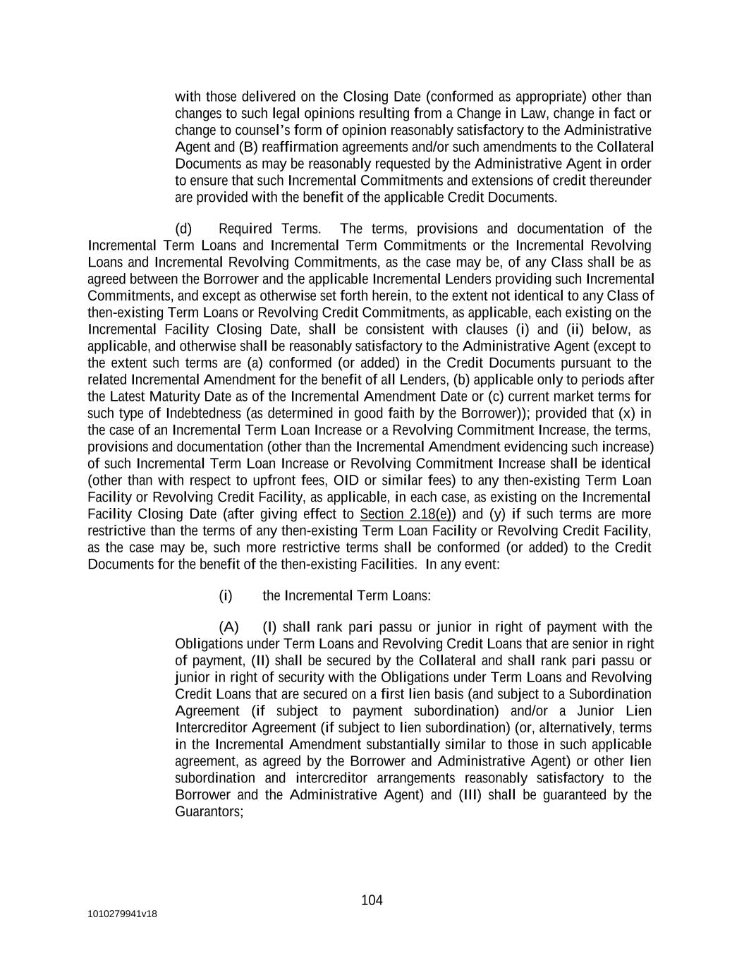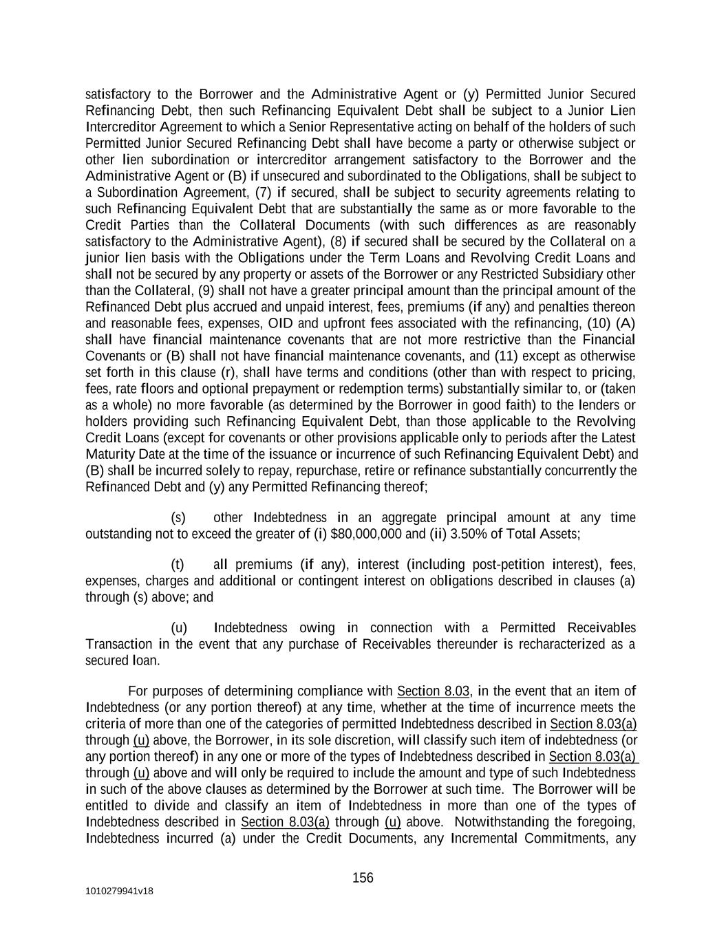 satisfactory to the Borrower and the Administrative Agent or (y) Permitted Junior Secured Refinancing Debt, then such Refinancing Equivalent Debt shall be subject to a Junior Lien Intercreditor Agreement to which a Senior Representative acting on behalf of the holders of such Permitted Junior Secured Refinancing Debt shall have become a party or otherwise subject or other lien subordination or intercreditor arrangement satisfactory to the Borrower and the Administrative Agent or (B) if unsecured and subordinated to the Obligations, shall be subject to a Subordination Agreement, (7) if secured, shall be subject to security agreements relating to such Refinancing Equivalent Debt that are substantially the same as or more favorable to the Credit Parties than the Collateral Documents (with such differences as are reasonably satisfactory to the Administrative Agent), (8) if secured shall be secured by the Collateral on a junior lien basis with the Obligations under the Term Loans and Revolving Credit Loans and shall not be secured by any property or assets of the Borrower or any Restricted Subsidiary other than the Collateral, (9) shall not have a greater principal amount than the principal amount of the Refinanced Debt plus accrued and unpaid interest, fees, premiums (if any) and penalties thereon and reasonable fees, expenses, OID and upfront fees associated with the refinancing, (10) (A) shall have financial maintenance covenants that are not more restrictive than the Financial Covenants or (B) shall not have financial maintenance covenants, and (11) except as otherwise set forth in this clause (r), shall have terms and conditions (other than with respect to pricing, fees, rate floors and optional prepayment or redemption terms) substantially similar to, or (taken as a whole) no more favorable (as determined by the Borrower in good faith) to the lenders or holders providing such Refinancing Equivalent Debt, than those applicable to the Revolving Credit Loans (except for covenants or other provisions applicable only to periods after the Latest Maturity Date at the time of the issuance or incurrence of such Refinancing Equivalent Debt) and (B) shall be incurred solely to repay, repurchase, retire or refinance substantially concurrently the Refinanced Debt and (y) any Permitted Refinancing thereof; (s) other Indebtedness in an aggregate principal amount at any time outstanding not to exceed the greater of (i) $80,000,000 and (ii) 3.50% of Total Assets; (t) all premiums (if any), interest (including post-petition interest), fees, expenses, charges and additional or contingent interest on obligations described in clauses (a) through (s) above; and (u) Indebtedness owing in connection with a Permitted Receivables Transaction in the event that any purchase of Receivables thereunder is recharacterized as a secured loan. For purposes of determining compliance with Section 8.03, in the event that an item of Indebtedness (or any portion thereof) at any time, whether at the time of incurrence meets the criteria of more than one of the categories of permitted Indebtedness described in Section 8.03(a) through (u) above, the Borrower, in its sole discretion, will classify such item of indebtedness (or any portion thereof) in any one or more of the types of Indebtedness described in Section 8.03(a) through (u) above and will only be required to include the amount and type of such Indebtedness in such of the above clauses as determined by the Borrower at such time. The Borrower will be entitled to divide and classify an item of Indebtedness in more than one of the types of Indebtedness described in Section 8.03(a) through (u) above. Notwithstanding the foregoing, Indebtedness incurred (a) under the Credit Documents, any Incremental Commitments, any 156 1010279941v18