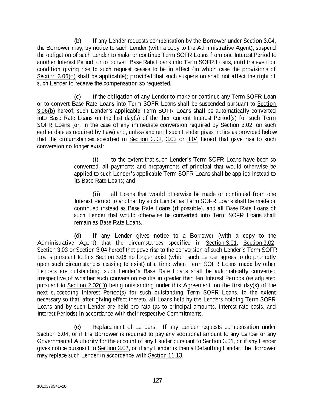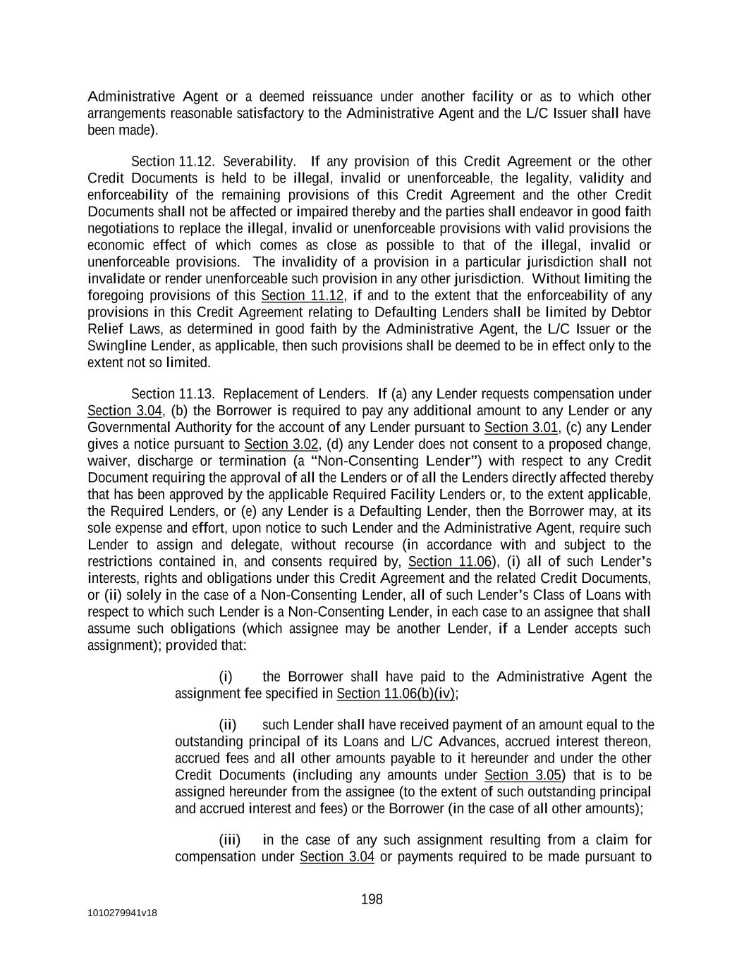 Administrative Agent or a deemed reissuance under another facility or as to which other arrangements reasonable satisfactory to the Administrative Agent and the L/C Issuer shall have been made). Section 11.12. Severability. If any provision of this Credit Agreement or the other Credit Documents is held to be illegal, invalid or unenforceable, the legality, validity and enforceability of the remaining provisions of this Credit Agreement and the other Credit Documents shall not be affected or impaired thereby and the parties shall endeavor in good faith negotiations to replace the illegal, invalid or unenforceable provisions with valid provisions the economic effect of which comes as close as possible to that of the illegal, invalid or unenforceable provisions. The invalidity of a provision in a particular jurisdiction shall not invalidate or render unenforceable such provision in any other jurisdiction. Without limiting the foregoing provisions of this Section 11.12, if and to the extent that the enforceability of any provisions in this Credit Agreement relating to Defaulting Lenders shall be limited by Debtor Relief Laws, as determined in good faith by the Administrative Agent, the L/C Issuer or the Swingline Lender, as applicable, then such provisions shall be deemed to be in effect only to the extent not so limited. Section 11.13. Replacement of Lenders. If (a) any Lender requests compensation under Section 3.04, (b) the Borrower is required to pay any additional amount to any Lender or any Governmental Authority for the account of any Lender pursuant to Section 3.01, (c) any Lender gives a notice pursuant to Section 3.02, (d) any Lender does not consent to a proposed change, waiver, discharge or termination (a “Non-Consenting Lender”) with respect to any Credit Document requiring the approval of all the Lenders or of all the Lenders directly affected thereby that has been approved by the applicable Required Facility Lenders or, to the extent applicable, the Required Lenders, or (e) any Lender is a Defaulting Lender, then the Borrower may, at its sole expense and effort, upon notice to such Lender and the Administrative Agent, require such Lender to assign and delegate, without recourse (in accordance with and subject to the restrictions contained in, and consents required by, Section 11.06), (i) all of such Lender’s interests, rights and obligations under this Credit Agreement and the related Credit Documents, or (ii) solely in the case of a Non-Consenting Lender, all of such Lender’s Class of Loans with respect to which such Lender is a Non-Consenting Lender, in each case to an assignee that shall assume such obligations (which assignee may be another Lender, if a Lender accepts such assignment); provided that: (i) the Borrower shall have paid to the Administrative Agent the assignment fee specified in Section 11.06(b)(iv); (ii) such Lender shall have received payment of an amount equal to the outstanding principal of its Loans and L/C Advances, accrued interest thereon, accrued fees and all other amounts payable to it hereunder and under the other Credit Documents (including any amounts under Section 3.05) that is to be assigned hereunder from the assignee (to the extent of such outstanding principal and accrued interest and fees) or the Borrower (in the case of all other amounts); (iii) in the case of any such assignment resulting from a claim for compensation under Section 3.04 or payments required to be made pursuant to 198 1010279941v18