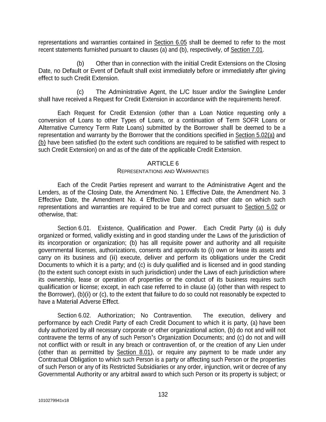 representations and warranties contained in Section 6.05 shall be deemed to refer to the most recent statements furnished pursuant to clauses (a) and (b), respectively, of Section 7.01. (b) Other than in connection with the initial Credit Extensions on the Closing Date, no Default or Event of Default shall exist immediately before or immediately after giving effect to such Credit Extension. (c) The Administrative Agent, the L/C Issuer and/or the Swingline Lender shall have received a Request for Credit Extension in accordance with the requirements hereof. Each Request for Credit Extension (other than a Loan Notice requesting only a conversion of Loans to other Types of Loans, or a continuation of Term SOFR Loans or Alternative Currency Term Rate Loans) submitted by the Borrower shall be deemed to be a representation and warranty by the Borrower that the conditions specified in Section 5.02(a) and (b) have been satisfied (to the extent such conditions are required to be satisfied with respect to such Credit Extension) on and as of the date of the applicable Credit Extension. ARTICLE 6 REPRESENTATIONS AND WARRANTIES Each of the Credit Parties represent and warrant to the Administrative Agent and the Lenders, as of the Closing Date, the Amendment No. 1 Effective Date, the Amendment No. 3 Effective Date, the Amendment No. 4 Effective Date and each other date on which such representations and warranties are required to be true and correct pursuant to Section 5.02 or otherwise, that: Section 6.01. Existence, Qualification and Power. Each Credit Party (a) is duly organized or formed, validly existing and in good standing under the Laws of the jurisdiction of its incorporation or organization; (b) has all requisite power and authority and all requisite governmental licenses, authorizations, consents and approvals to (i) own or lease its assets and carry on its business and (ii) execute, deliver and perform its obligations under the Credit Documents to which it is a party; and (c) is duly qualified and is licensed and in good standing (to the extent such concept exists in such jurisdiction) under the Laws of each jurisdiction where its ownership, lease or operation of properties or the conduct of its business requires such qualification or license; except, in each case referred to in clause (a) (other than with respect to the Borrower), (b)(i) or (c), to the extent that failure to do so could not reasonably be expected to have a Material Adverse Effect. Section 6.02. Authorization; No Contravention. The execution, delivery and performance by each Credit Party of each Credit Document to which it is party, (a) have been duly authorized by all necessary corporate or other organizational action, (b) do not and will not contravene the terms of any of such Person’s Organization Documents; and (c) do not and will not conflict with or result in any breach or contravention of, or the creation of any Lien under (other than as permitted by Section 8.01), or require any payment to be made under any Contractual Obligation to which such Person is a party or affecting such Person or the properties of such Person or any of its Restricted Subsidiaries or any order, injunction, writ or decree of any Governmental Authority or any arbitral award to which such Person or its property is subject; or 132 1010279941v18