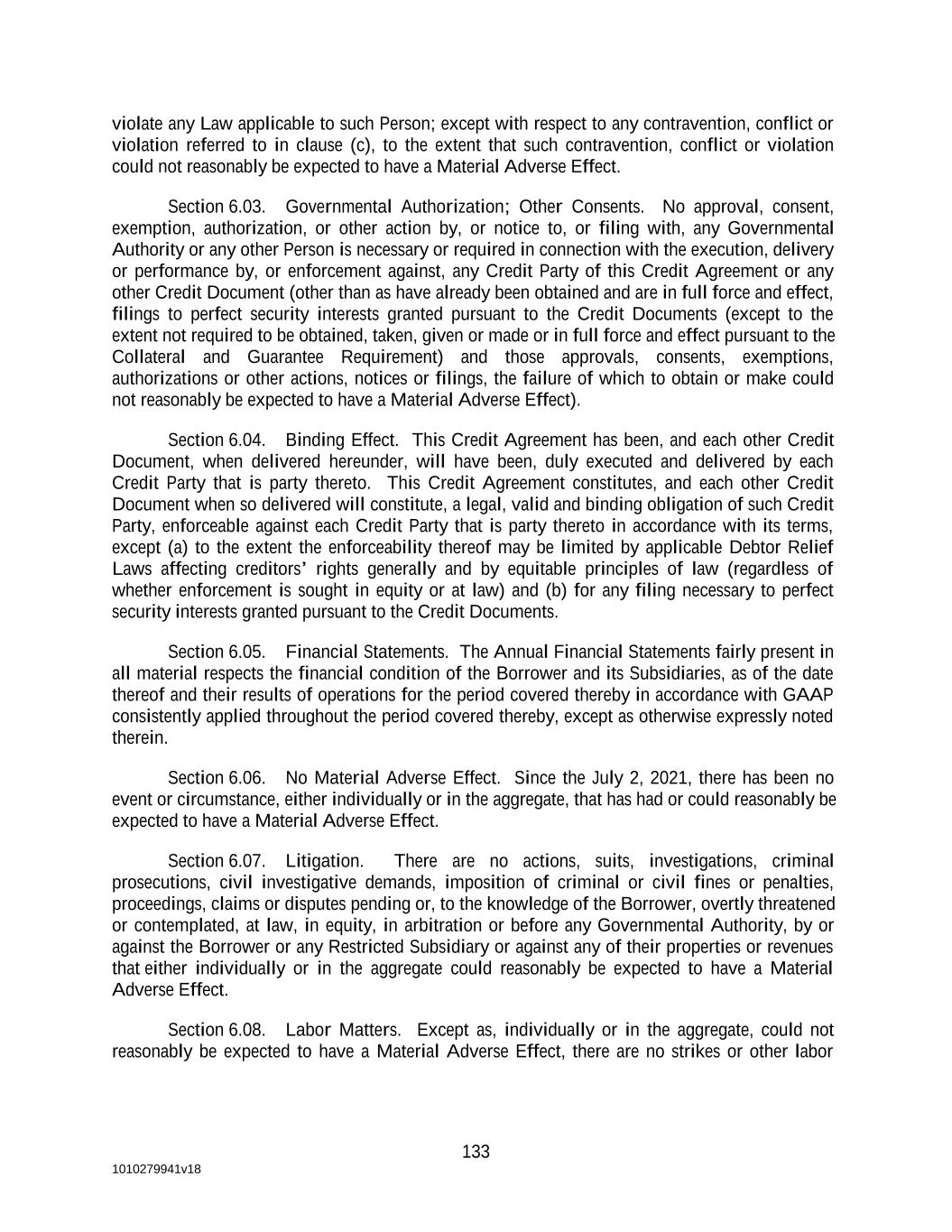 violate any Law applicable to such Person; except with respect to any contravention, conflict or violation referred to in clause (c), to the extent that such contravention, conflict or violation could not reasonably be expected to have a Material Adverse Effect. Section 6.03. Governmental Authorization; Other Consents. No approval, consent, exemption, authorization, or other action by, or notice to, or filing with, any Governmental Authority or any other Person is necessary or required in connection with the execution, delivery or performance by, or enforcement against, any Credit Party of this Credit Agreement or any other Credit Document (other than as have already been obtained and are in full force and effect, filings to perfect security interests granted pursuant to the Credit Documents (except to the extent not required to be obtained, taken, given or made or in full force and effect pursuant to the Collateral and Guarantee Requirement) and those approvals, consents, exemptions, authorizations or other actions, notices or filings, the failure of which to obtain or make could not reasonably be expected to have a Material Adverse Effect). Section 6.04. Binding Effect. This Credit Agreement has been, and each other Credit Document, when delivered hereunder, will have been, duly executed and delivered by each Credit Party that is party thereto. This Credit Agreement constitutes, and each other Credit Document when so delivered will constitute, a legal, valid and binding obligation of such Credit Party, enforceable against each Credit Party that is party thereto in accordance with its terms, except (a) to the extent the enforceability thereof may be limited by applicable Debtor Relief Laws affecting creditors’ rights generally and by equitable principles of law (regardless of whether enforcement is sought in equity or at law) and (b) for any filing necessary to perfect security interests granted pursuant to the Credit Documents. Section 6.05. Financial Statements. The Annual Financial Statements fairly present in all material respects the financial condition of the Borrower and its Subsidiaries, as of the date thereof and their results of operations for the period covered thereby in accordance with GAAP consistently applied throughout the period covered thereby, except as otherwise expressly noted therein. Section 6.06. No Material Adverse Effect. Since the July 2, 2021, there has been no event or circumstance, either individually or in the aggregate, that has had or could reasonably be expected to have a Material Adverse Effect. Section 6.07. Litigation. There are no actions, suits, investigations, criminal prosecutions, civil investigative demands, imposition of criminal or civil fines or penalties, proceedings, claims or disputes pending or, to the knowledge of the Borrower, overtly threatened or contemplated, at law, in equity, in arbitration or before any Governmental Authority, by or against the Borrower or any Restricted Subsidiary or against any of their properties or revenues that either individually or in the aggregate could reasonably be expected to have a Material Adverse Effect. Section 6.08. Labor Matters. Except as, individually or in the aggregate, could not reasonably be expected to have a Material Adverse Effect, there are no strikes or other labor 133 1010279941v18