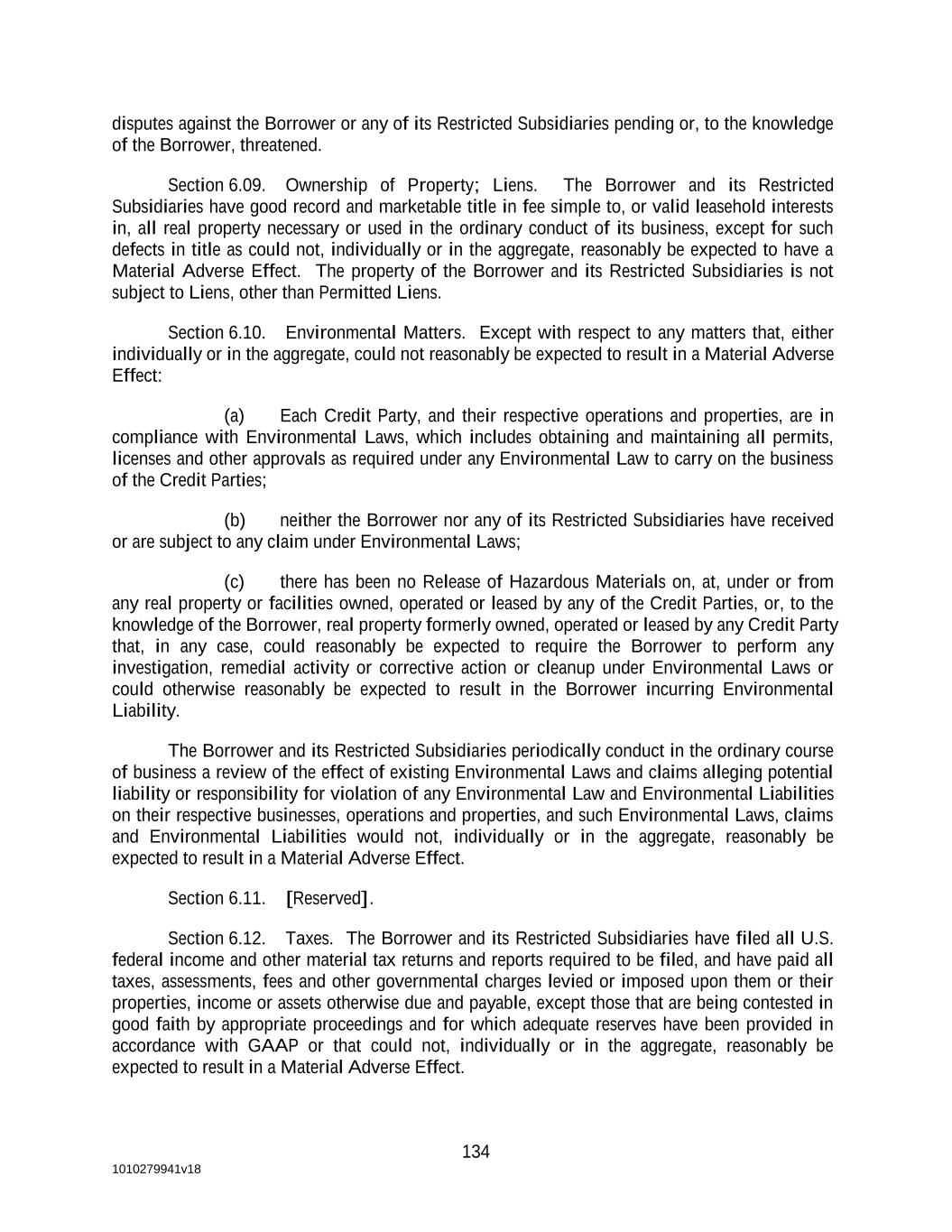 disputes against the Borrower or any of its Restricted Subsidiaries pending or, to the knowledge of the Borrower, threatened. Section 6.09. Ownership of Property; Liens. The Borrower and its Restricted Subsidiaries have good record and marketable title in fee simple to, or valid leasehold interests in, all real property necessary or used in the ordinary conduct of its business, except for such defects in title as could not, individually or in the aggregate, reasonably be expected to have a Material Adverse Effect. The property of the Borrower and its Restricted Subsidiaries is not subject to Liens, other than Permitted Liens. Section 6.10. Environmental Matters. Except with respect to any matters that, either individually or in the aggregate, could not reasonably be expected to result in a Material Adverse Effect: (a) Each Credit Party, and their respective operations and properties, are in compliance with Environmental Laws, which includes obtaining and maintaining all permits, licenses and other approvals as required under any Environmental Law to carry on the business of the Credit Parties; (b) neither the Borrower nor any of its Restricted Subsidiaries have received or are subject to any claim under Environmental Laws; (c) there has been no Release of Hazardous Materials on, at, under or from any real property or facilities owned, operated or leased by any of the Credit Parties, or, to the knowledge of the Borrower, real property formerly owned, operated or leased by any Credit Party that, in any case, could reasonably be expected to require the Borrower to perform any investigation, remedial activity or corrective action or cleanup under Environmental Laws or could otherwise reasonably be expected to result in the Borrower incurring Environmental Liability. The Borrower and its Restricted Subsidiaries periodically conduct in the ordinary course of business a review of the effect of existing Environmental Laws and claims alleging potential liability or responsibility for violation of any Environmental Law and Environmental Liabilities on their respective businesses, operations and properties, and such Environmental Laws, claims and Environmental Liabilities would not, individually or in the aggregate, reasonably be expected to result in a Material Adverse Effect. Section 6.11. [Reserved]. Section 6.12. Taxes. The Borrower and its Restricted Subsidiaries have filed all U.S. federal income and other material tax returns and reports required to be filed, and have paid all taxes, assessments, fees and other governmental charges levied or imposed upon them or their properties, income or assets otherwise due and payable, except those that are being contested in good faith by appropriate proceedings and for which adequate reserves have been provided in accordance with GAAP or that could not, individually or in the aggregate, reasonably be expected to result in a Material Adverse Effect. 134 1010279941v18