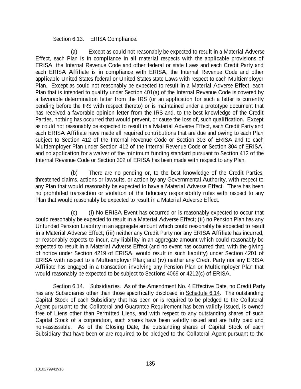 Section 6.13. ERISA Compliance. (a) Except as could not reasonably be expected to result in a Material Adverse Effect, each Plan is in compliance in all material respects with the applicable provisions of ERISA, the Internal Revenue Code and other federal or state Laws and each Credit Party and each ERISA Affiliate is in compliance with ERISA, the Internal Revenue Code and other applicable United States federal or United States state Laws with respect to each Multiemployer Plan. Except as could not reasonably be expected to result in a Material Adverse Effect, each Plan that is intended to qualify under Section 401(a) of the Internal Revenue Code is covered by a favorable determination letter from the IRS (or an application for such a letter is currently pending before the IRS with respect thereto) or is maintained under a prototype document that has received a favorable opinion letter from the IRS and, to the best knowledge of the Credit Parties, nothing has occurred that would prevent, or cause the loss of, such qualification. Except as could not reasonably be expected to result in a Material Adverse Effect, each Credit Party and each ERISA Affiliate have made all required contributions that are due and owing to each Plan subject to Section 412 of the Internal Revenue Code or Section 303 of ERISA and to each Multiemployer Plan under Section 412 of the Internal Revenue Code or Section 304 of ERISA, and no application for a waiver of the minimum funding standard pursuant to Section 412 of the Internal Revenue Code or Section 302 of ERISA has been made with respect to any Plan. (b) There are no pending or, to the best knowledge of the Credit Parties, threatened claims, actions or lawsuits, or action by any Governmental Authority, with respect to any Plan that would reasonably be expected to have a Material Adverse Effect. There has been no prohibited transaction or violation of the fiduciary responsibility rules with respect to any Plan that would reasonably be expected to result in a Material Adverse Effect. (c) (i) No ERISA Event has occurred or is reasonably expected to occur that could reasonably be expected to result in a Material Adverse Effect; (ii) no Pension Plan has any Unfunded Pension Liability in an aggregate amount which could reasonably be expected to result in a Material Adverse Effect; (iii) neither any Credit Party nor any ERISA Affiliate has incurred, or reasonably expects to incur, any liability in an aggregate amount which could reasonably be expected to result in a Material Adverse Effect (and no event has occurred that, with the giving of notice under Section 4219 of ERISA, would result in such liability) under Section 4201 of ERISA with respect to a Multiemployer Plan; and (iv) neither any Credit Party nor any ERISA Affiliate has engaged in a transaction involving any Pension Plan or Multiemployer Plan that would reasonably be expected to be subject to Sections 4069 or 4212(c) of ERISA. Section 6.14. Subsidiaries. As of the Amendment No. 4 Effective Date, no Credit Party has any Subsidiaries other than those specifically disclosed in Schedule 6.14. The outstanding Capital Stock of each Subsidiary that has been or is required to be pledged to the Collateral Agent pursuant to the Collateral and Guarantee Requirement has been validly issued, is owned free of Liens other than Permitted Liens, and with respect to any outstanding shares of such Capital Stock of a corporation, such shares have been validly issued and are fully paid and non-assessable. As of the Closing Date, the outstanding shares of Capital Stock of each Subsidiary that have been or are required to be pledged to the Collateral Agent pursuant to the 135 1010279941v18
