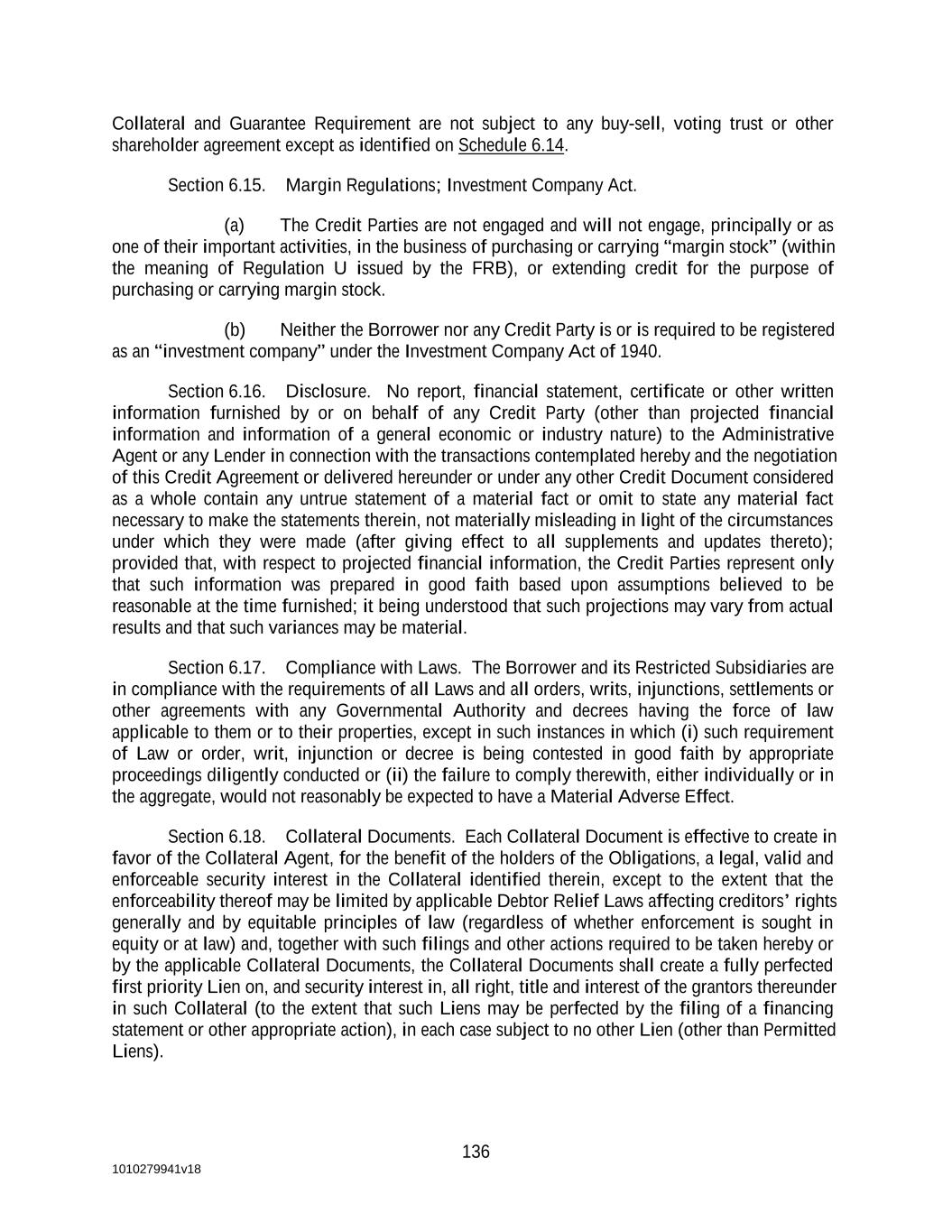 Collateral and Guarantee Requirement are not subject to any buy-sell, voting trust or other shareholder agreement except as identified on Schedule 6.14. Section 6.15. Margin Regulations; Investment Company Act. (a) The Credit Parties are not engaged and will not engage, principally or as one of their important activities, in the business of purchasing or carrying “margin stock” (within the meaning of Regulation U issued by the FRB), or extending credit for the purpose of purchasing or carrying margin stock. (b) Neither the Borrower nor any Credit Party is or is required to be registered as an “investment company” under the Investment Company Act of 1940. Section 6.16. Disclosure. No report, financial statement, certificate or other written information furnished by or on behalf of any Credit Party (other than projected financial information and information of a general economic or industry nature) to the Administrative Agent or any Lender in connection with the transactions contemplated hereby and the negotiation of this Credit Agreement or delivered hereunder or under any other Credit Document considered as a whole contain any untrue statement of a material fact or omit to state any material fact necessary to make the statements therein, not materially misleading in light of the circumstances under which they were made (after giving effect to all supplements and updates thereto); provided that, with respect to projected financial information, the Credit Parties represent only that such information was prepared in good faith based upon assumptions believed to be reasonable at the time furnished; it being understood that such projections may vary from actual results and that such variances may be material. Section 6.17. Compliance with Laws. The Borrower and its Restricted Subsidiaries are in compliance with the requirements of all Laws and all orders, writs, injunctions, settlements or other agreements with any Governmental Authority and decrees having the force of law applicable to them or to their properties, except in such instances in which (i) such requirement of Law or order, writ, injunction or decree is being contested in good faith by appropriate proceedings diligently conducted or (ii) the failure to comply therewith, either individually or in the aggregate, would not reasonably be expected to have a Material Adverse Effect. Section 6.18. Collateral Documents. Each Collateral Document is effective to create in favor of the Collateral Agent, for the benefit of the holders of the Obligations, a legal, valid and enforceable security interest in the Collateral identified therein, except to the extent that the enforceability thereof may be limited by applicable Debtor Relief Laws affecting creditors’ rights generally and by equitable principles of law (regardless of whether enforcement is sought in equity or at law) and, together with such filings and other actions required to be taken hereby or by the applicable Collateral Documents, the Collateral Documents shall create a fully perfected first priority Lien on, and security interest in, all right, title and interest of the grantors thereunder in such Collateral (to the extent that such Liens may be perfected by the filing of a financing statement or other appropriate action), in each case subject to no other Lien (other than Permitted Liens). 136 1010279941v18